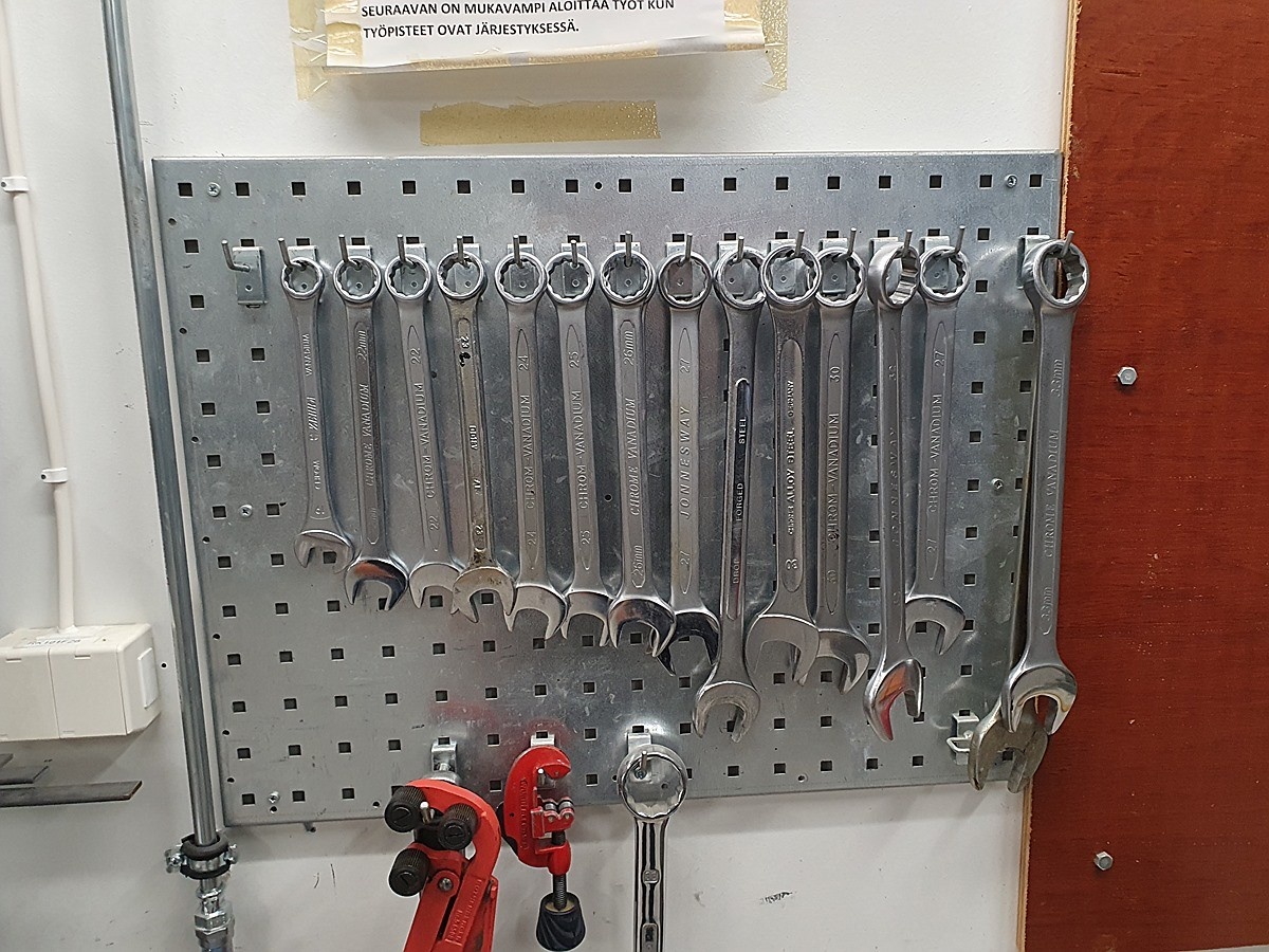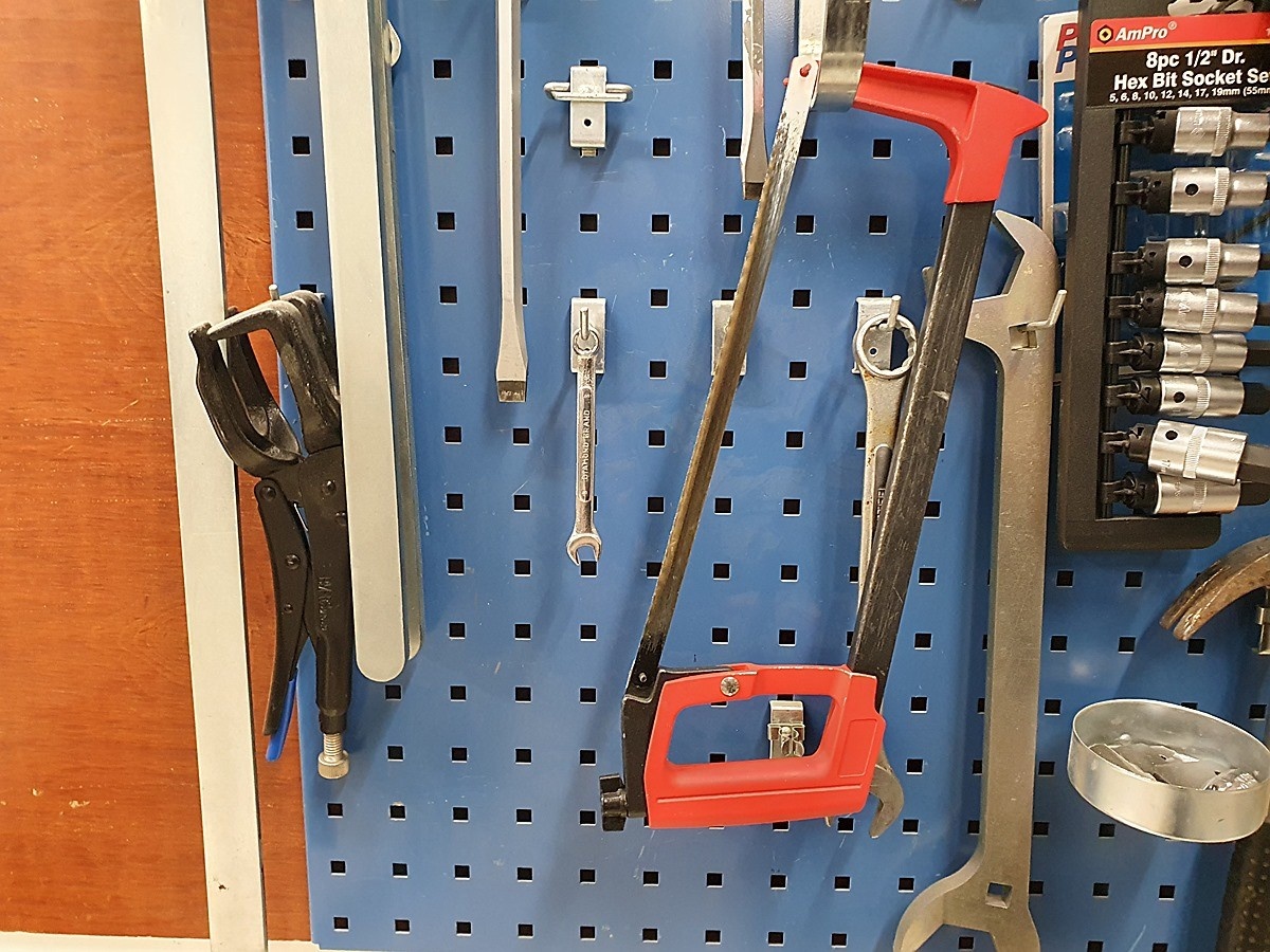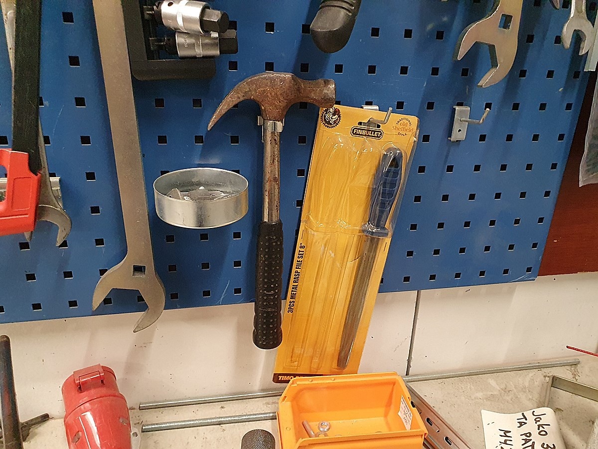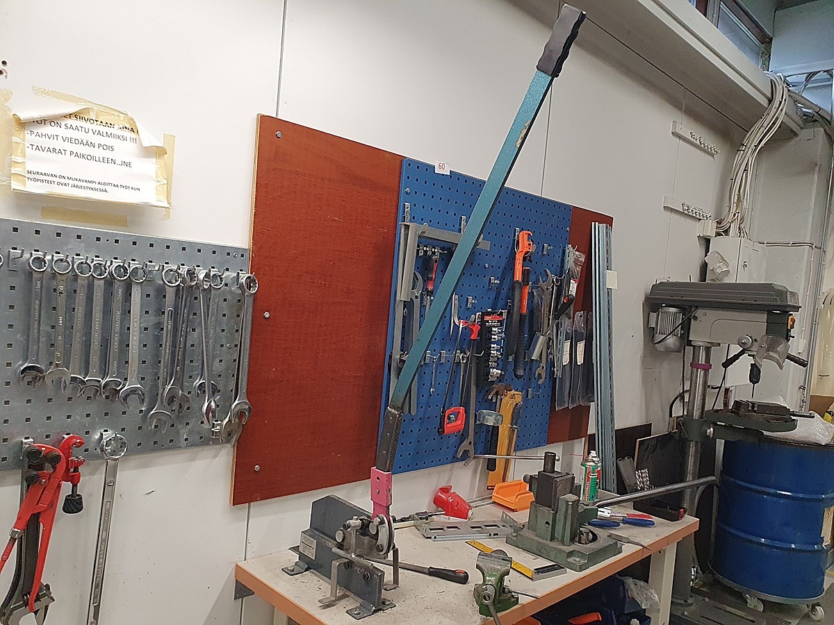 Työpöytä, työkaluseinä tavaroineen, peltileikkuri, raudantaivutin