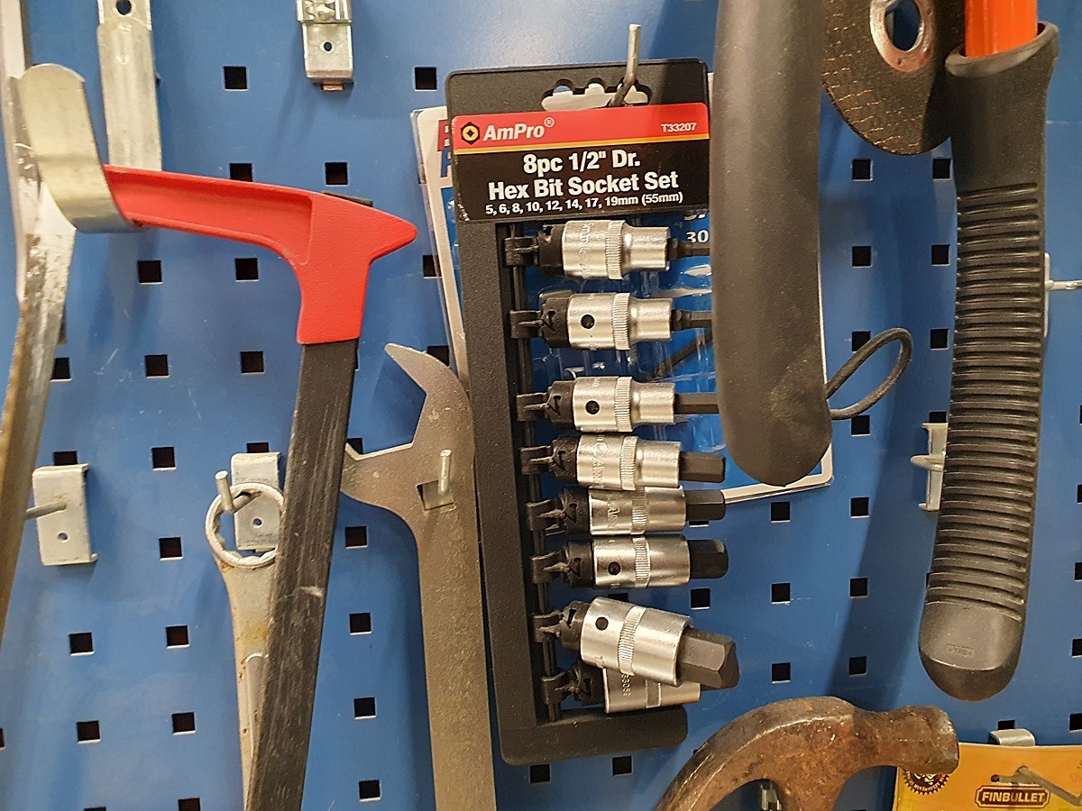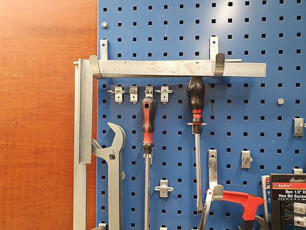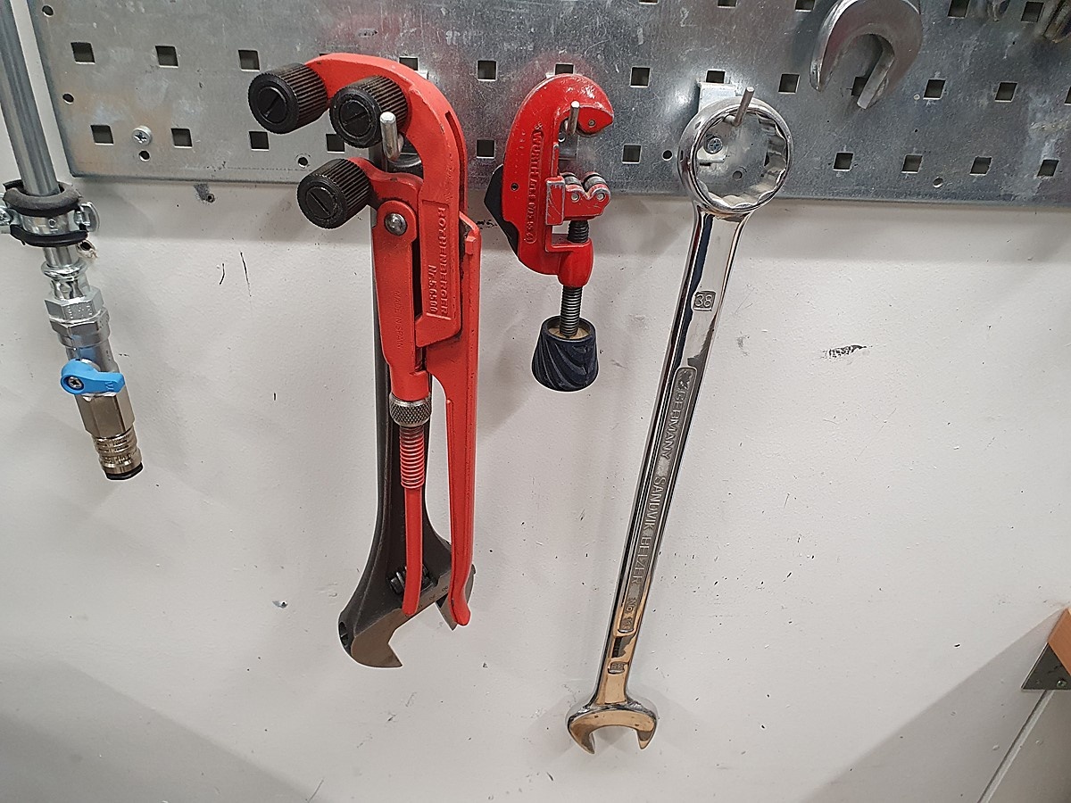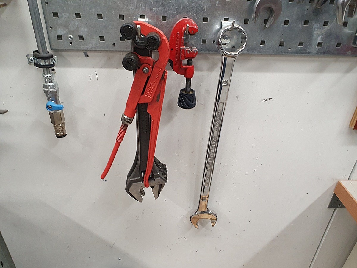 Työpöytä, työkaluseinä tavaroineen, peltileikkuri, raudantaivutin