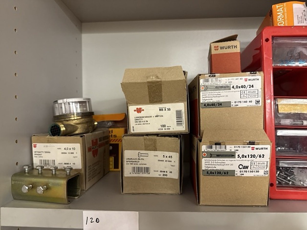 Myyntikohteet » 7. Jakotec Oy:n konkurssipesä (2031649-1), ÄÄNEKOSKI, 08.11.2025 » 120. kaapintavarat pultit, ruuvit yms.