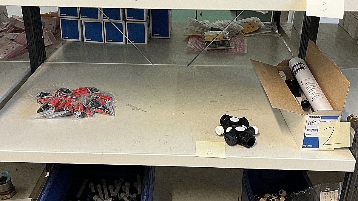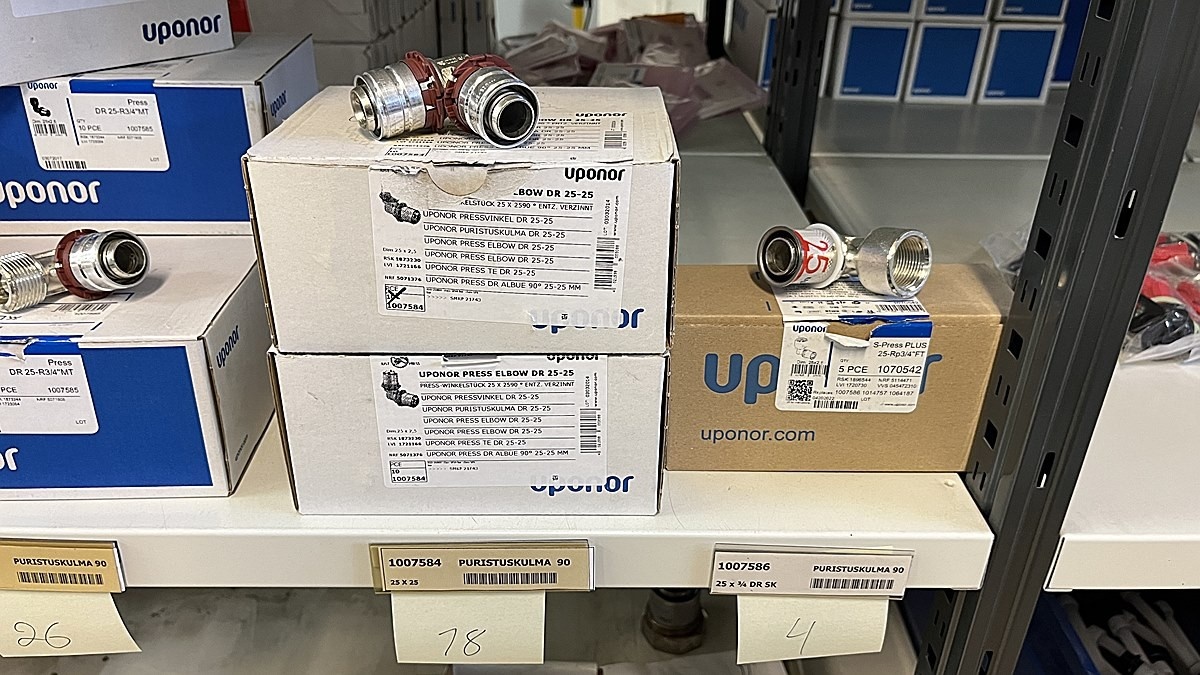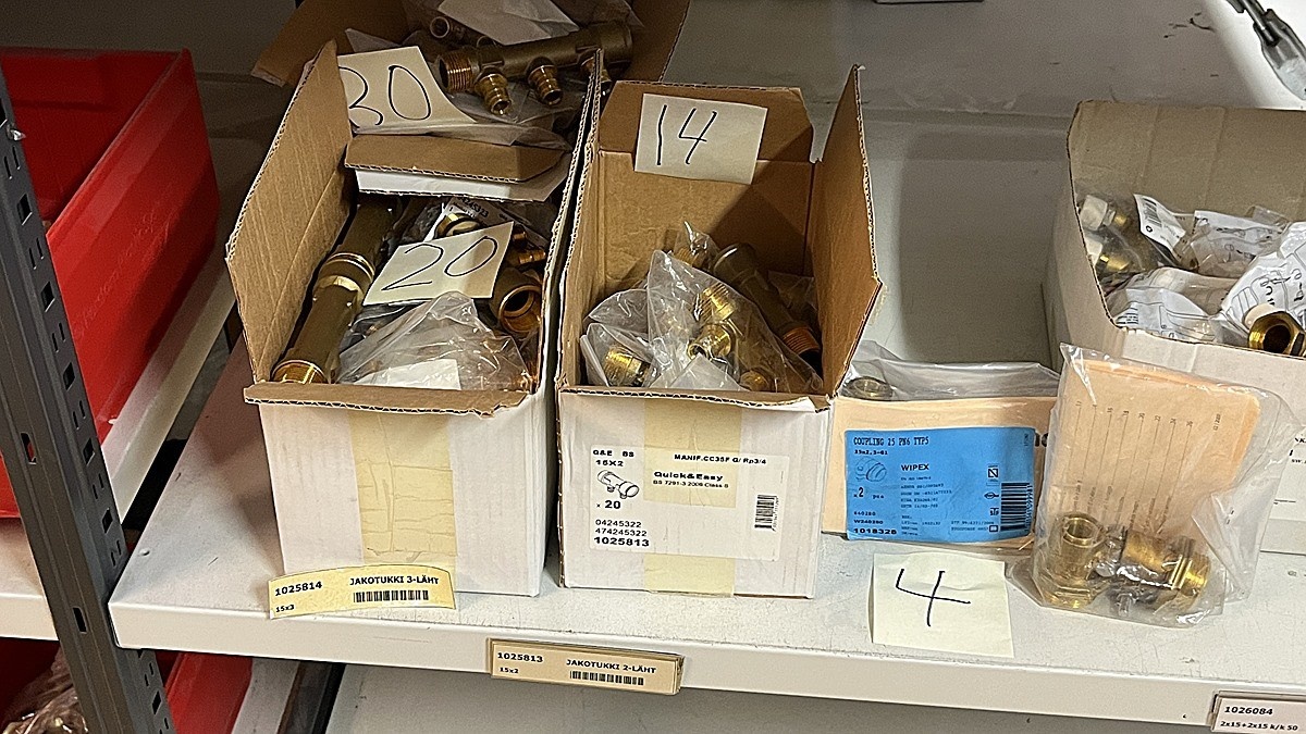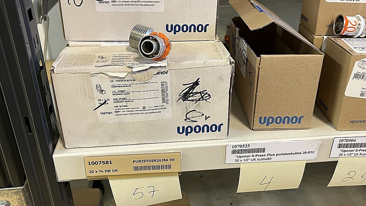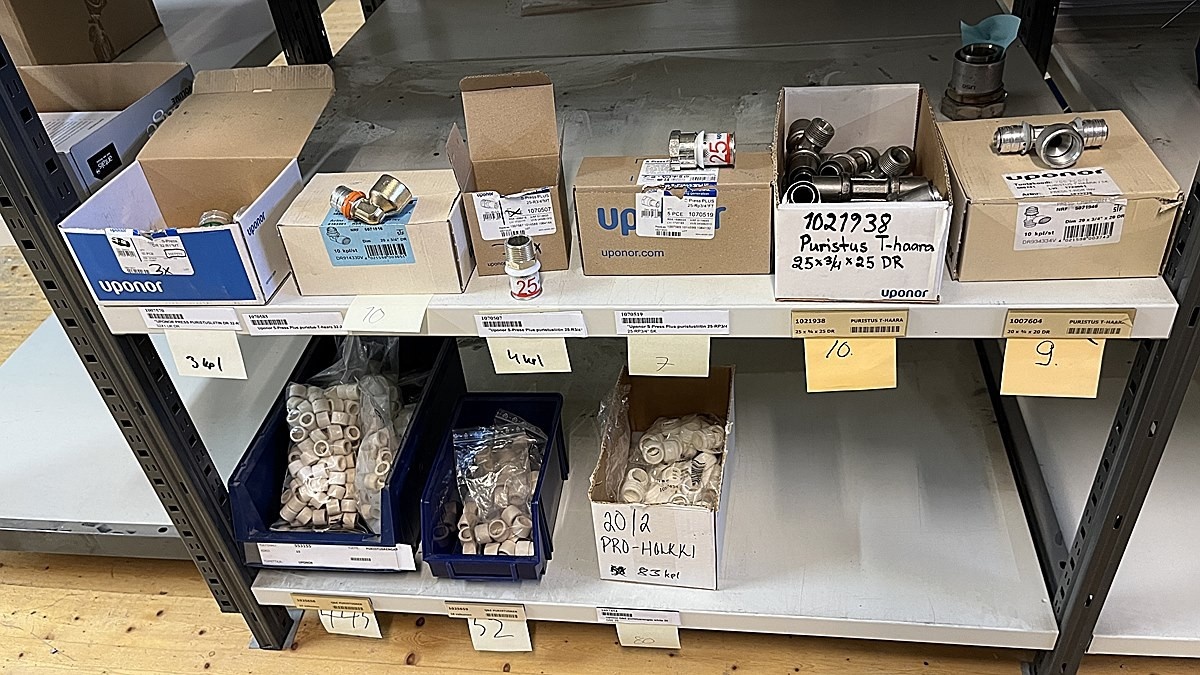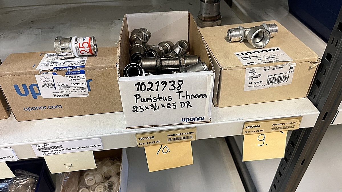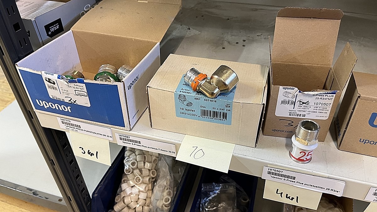 Myyntikohteet » 3. Jakotec Oy:n konkurssipesä (2031649-1), ÄÄNEKOSKI, 08.11.2025 » 40. Puristusliittimet, venttiilit, jakotukit Uponor (4 hyllyväliä)