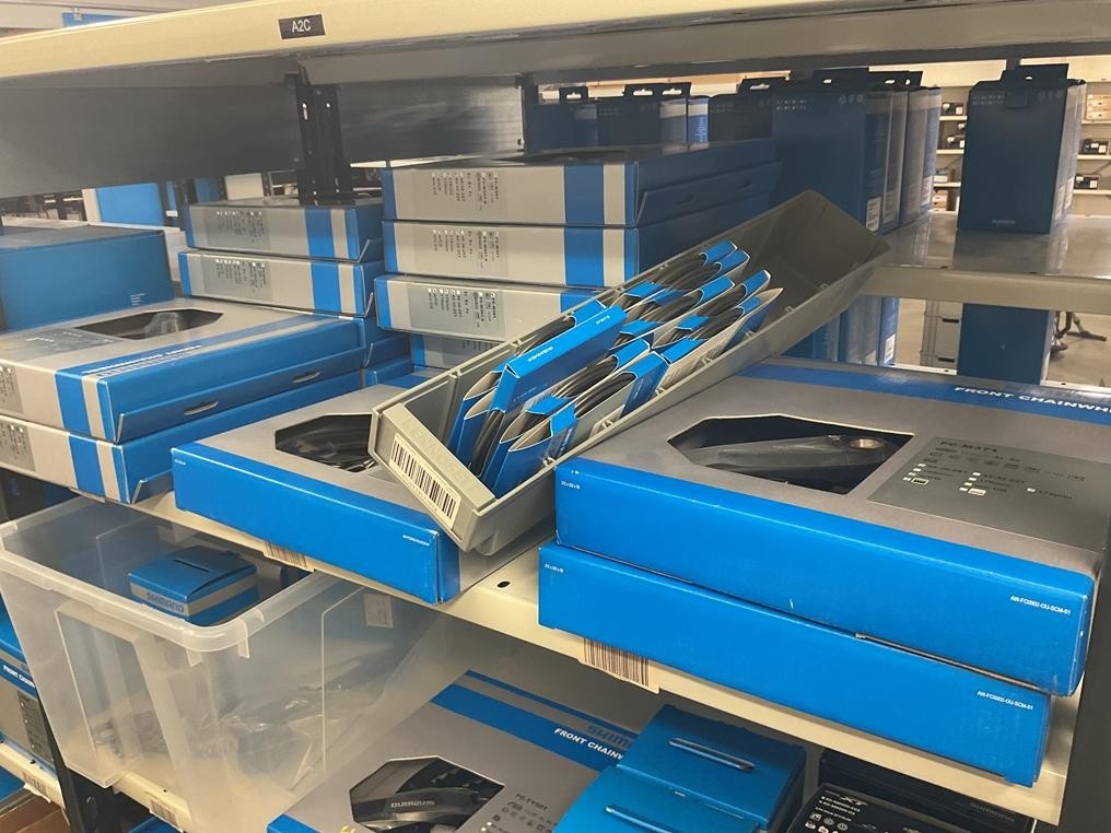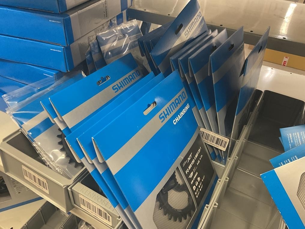 4-hyllytasolla olevat polkupyörien varaosat Shimano ym. yhteensä 49 kappaletta