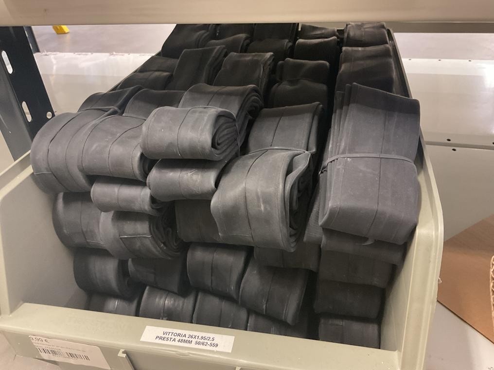 3-hyllytasolla olevat polkupyörien sisärenkaat ym. (Continental & Vittoria) yhteensä 6 laatikkoa