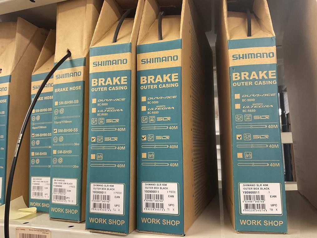 3-hyllytasolla olevat polkupyörien vaihde- ja jarruvaijerit Shimano yhteensä 20 laatikkoa
