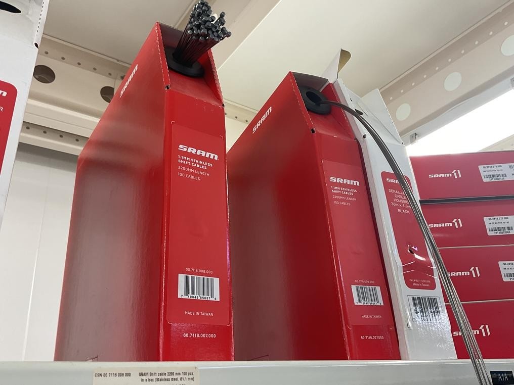 Hyllytasolla olevat polkupyörien vaijerit ym. Sram yhteensä 8 laatikkoa