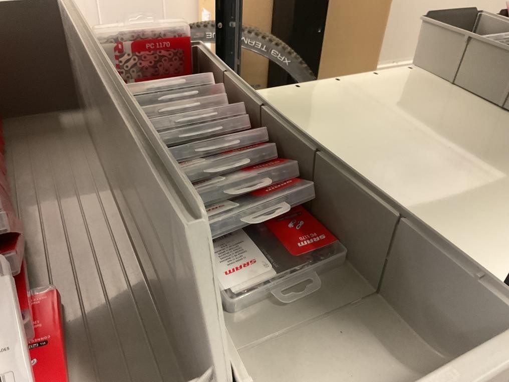 3-hyllytasolla olevat polkupyörien varaosat Sram yhteensä 74 kappaletta