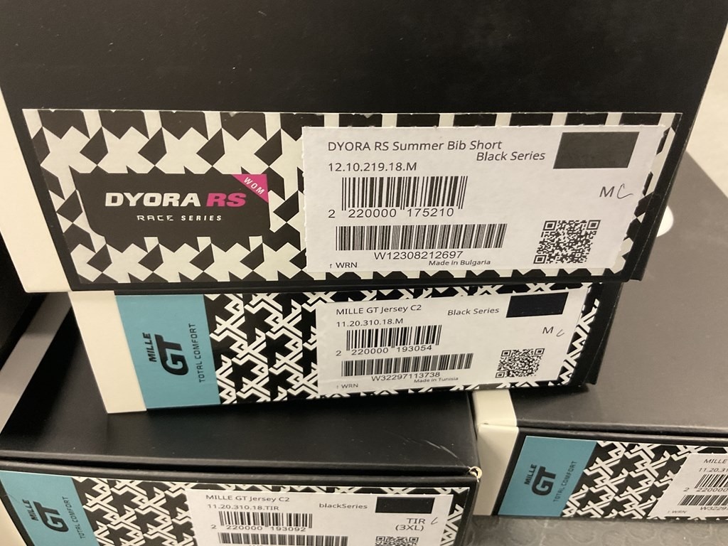Assos pyöräilyvaatteita (paitoja ja bib-shorteja).