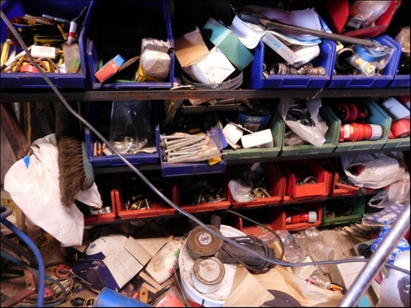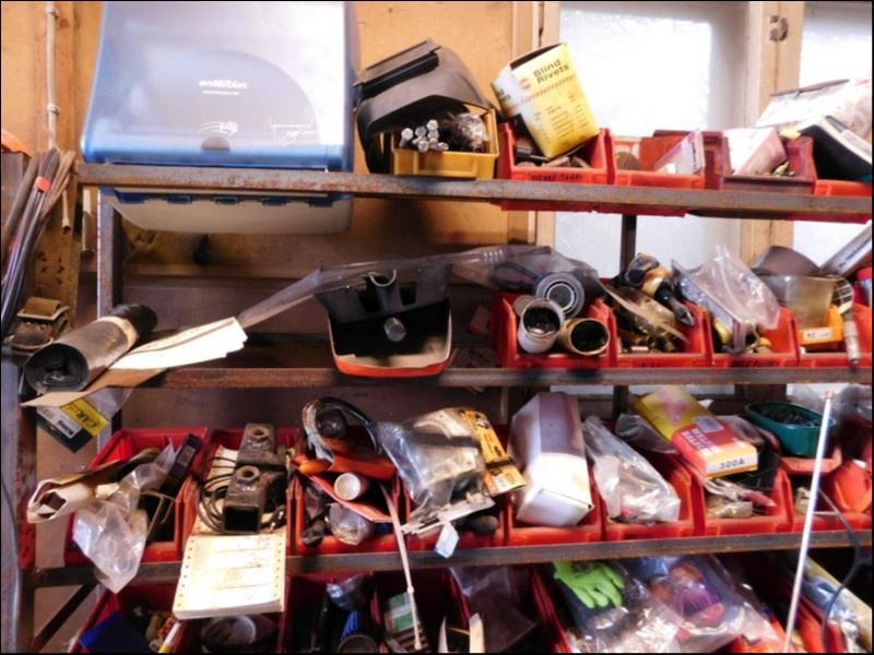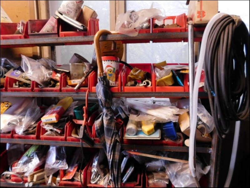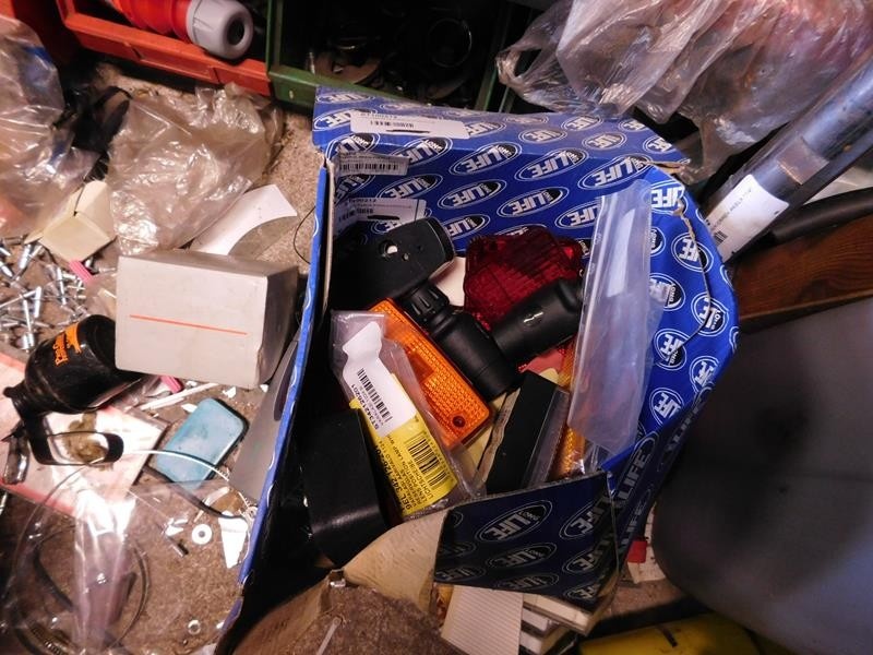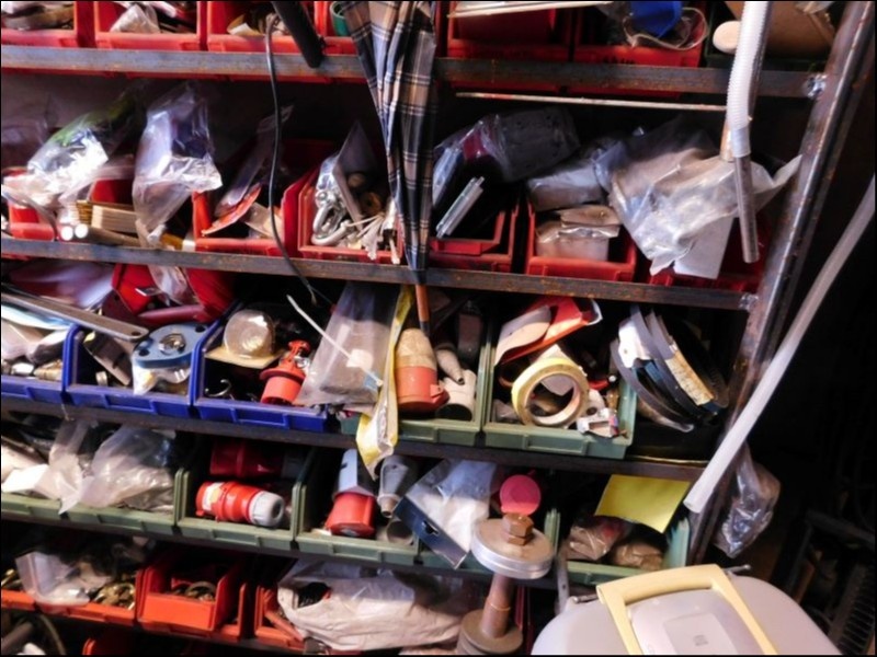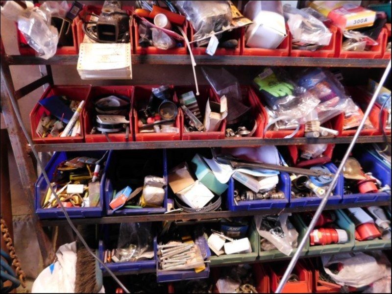 Erä sekalaisia varaosia ja tarvikkeita muovilokeroissa hyllykössä ja hyllykön edessä.