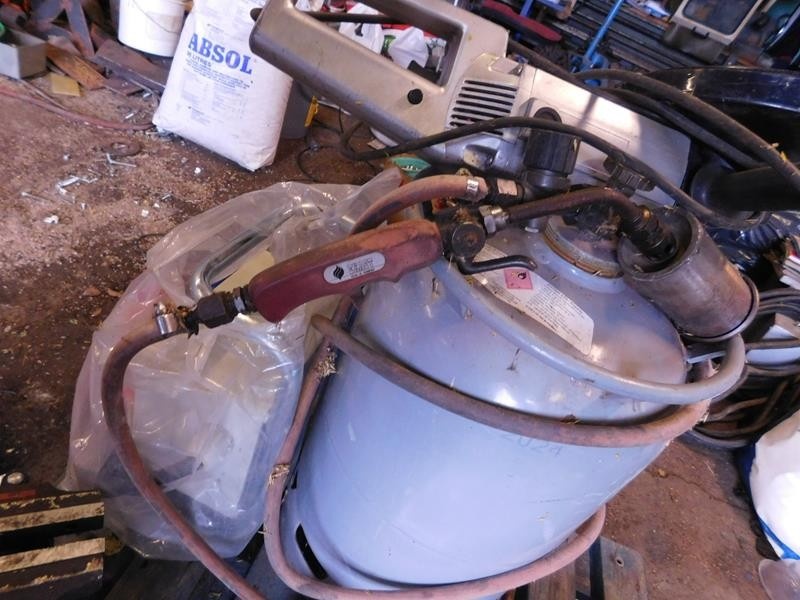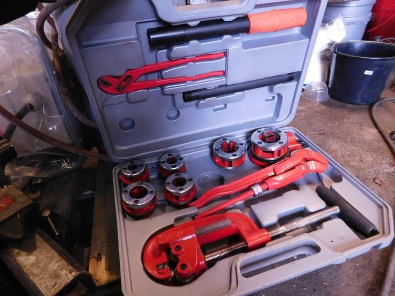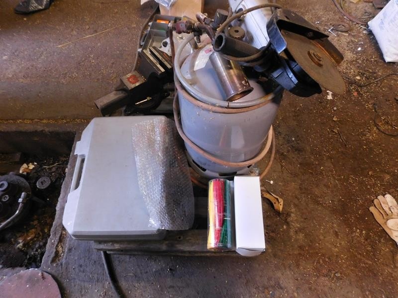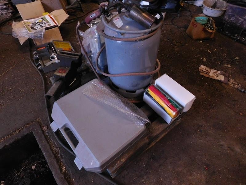 Kaasupullo ja "toho", uusi jakokeskus, putken kierteytyssarja, iso viilapenkki, katkaisulaikka ja erä värillisiä nippusiteitä.