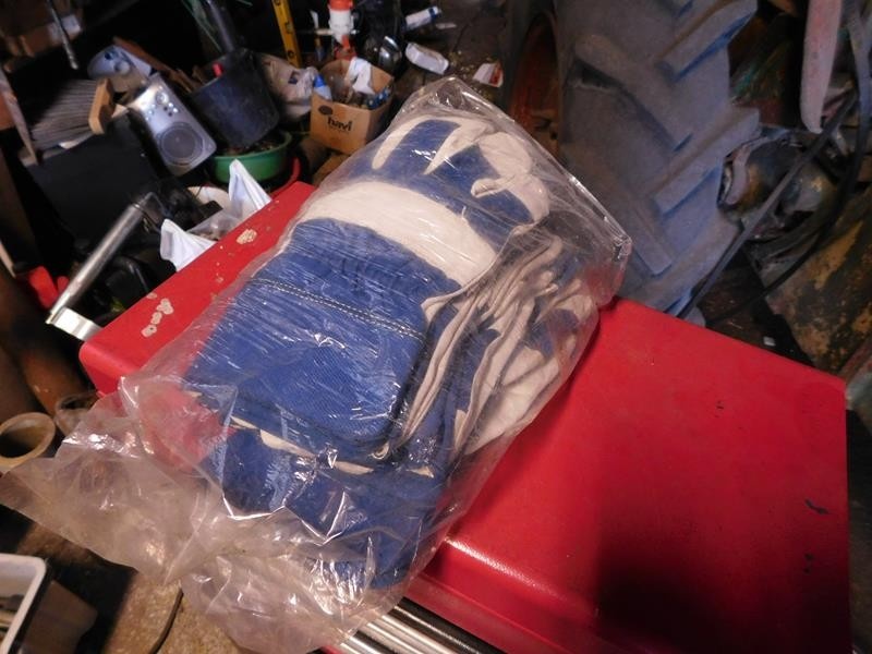 Metallinen työkaluvaunu työkaluineen sekä paketti työkäsineitä.