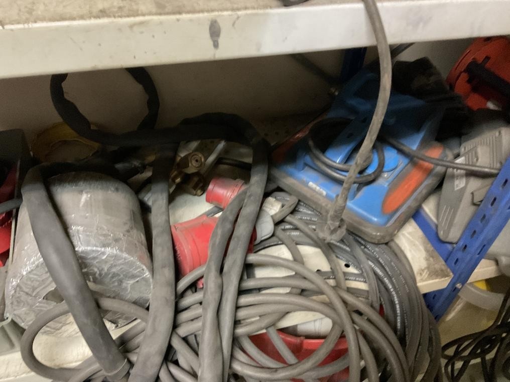 2. 3-hyllyvälissä olevat hitsausletkut, hitsauskoneet 2 kappaletta (epäkunnossa), viidessä laatikossa olevat tulpat