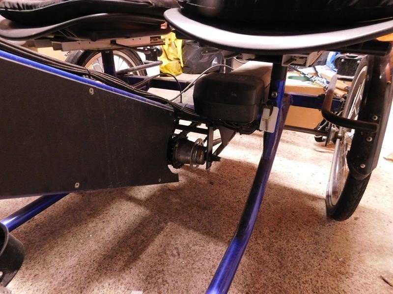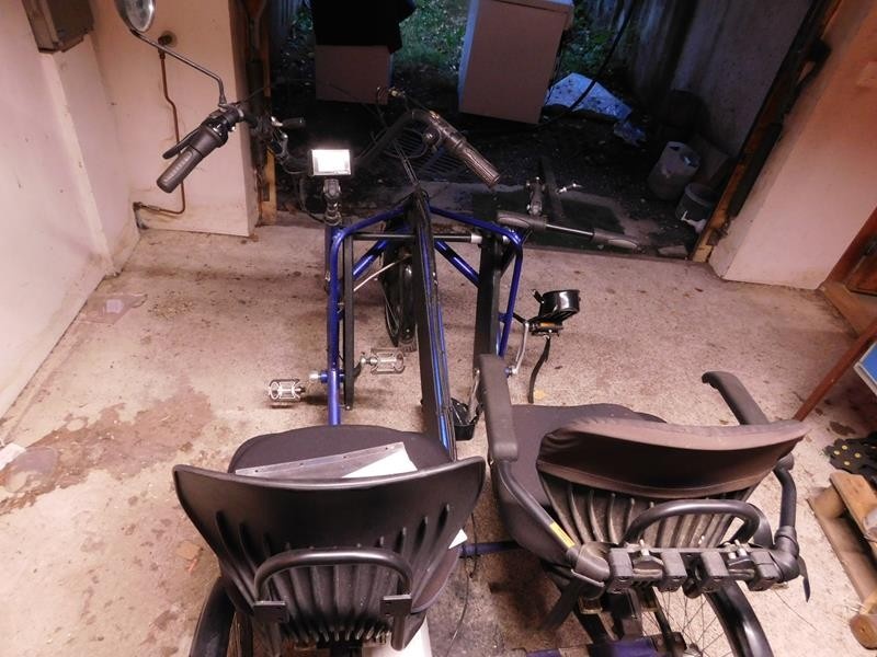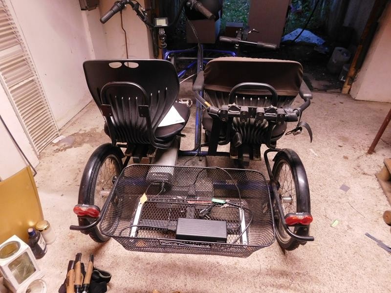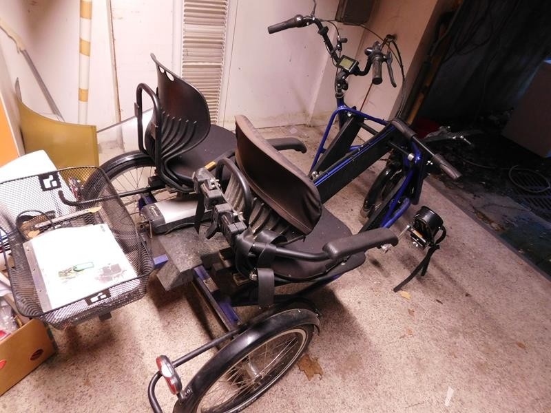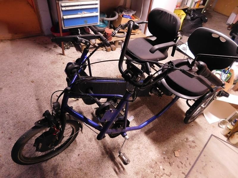 Kolmipyöräinen sähköavusteinen polkupyörä jossa oikealla puolella on istuin ja polkimet kyyditettävälle.