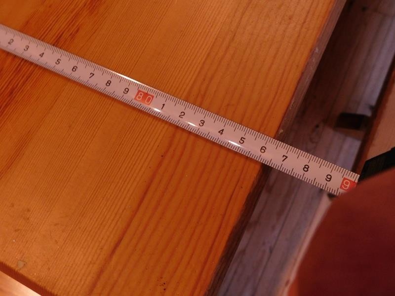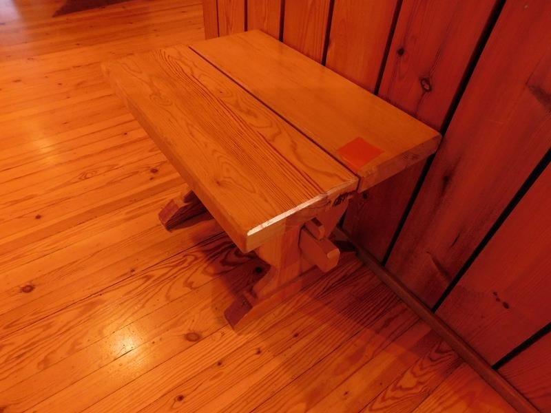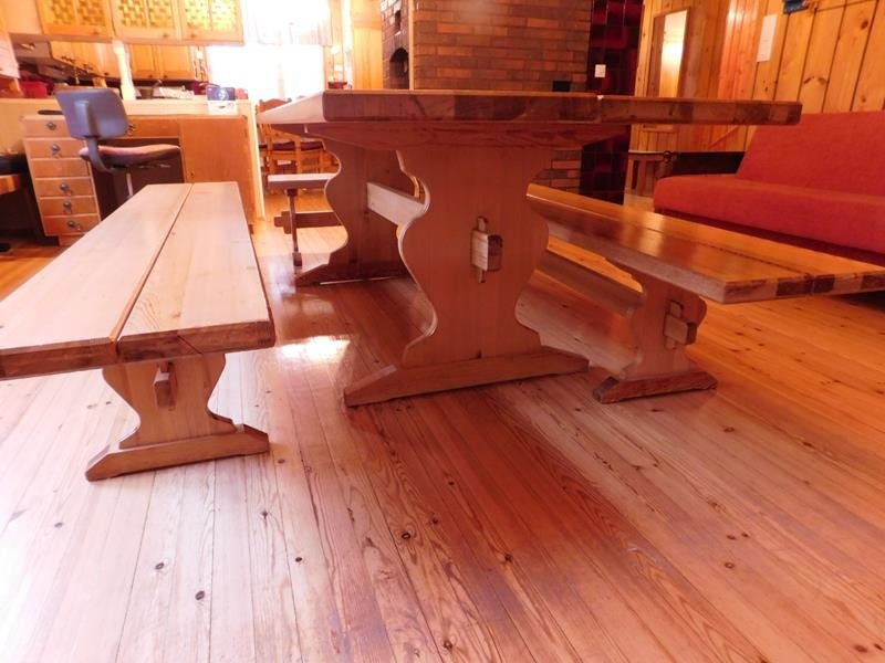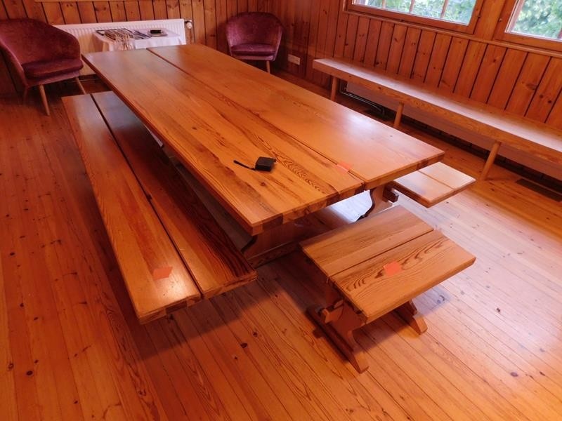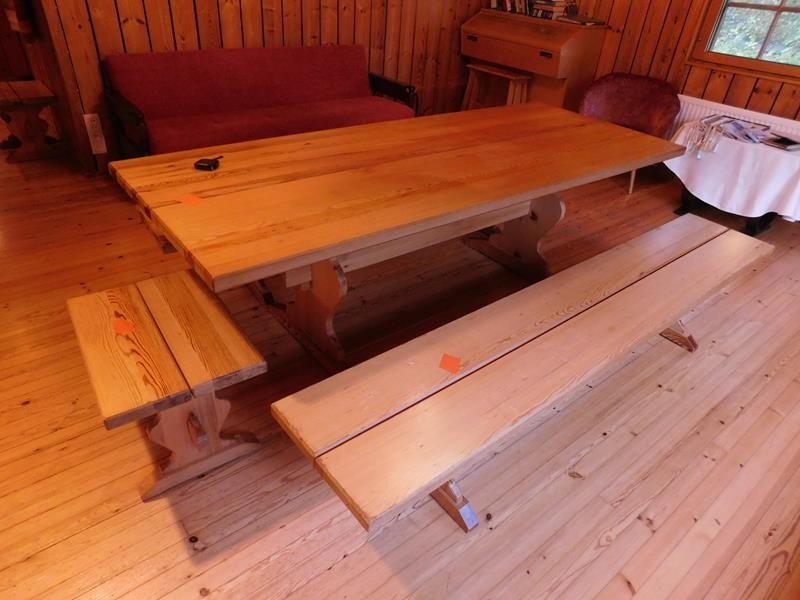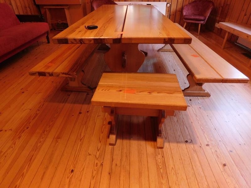 Jykevä paksukantinen pöytä, kaksi pitkää penkkiä ja kaksi lyhyttä penkkiä.