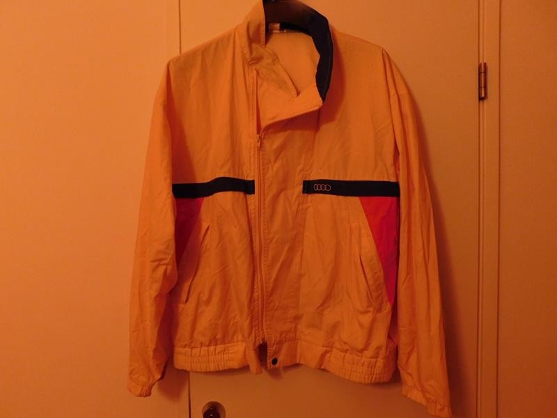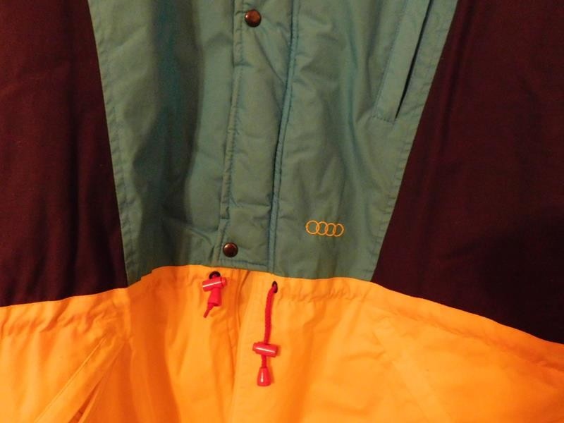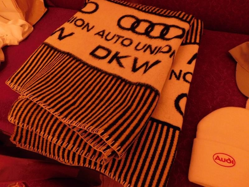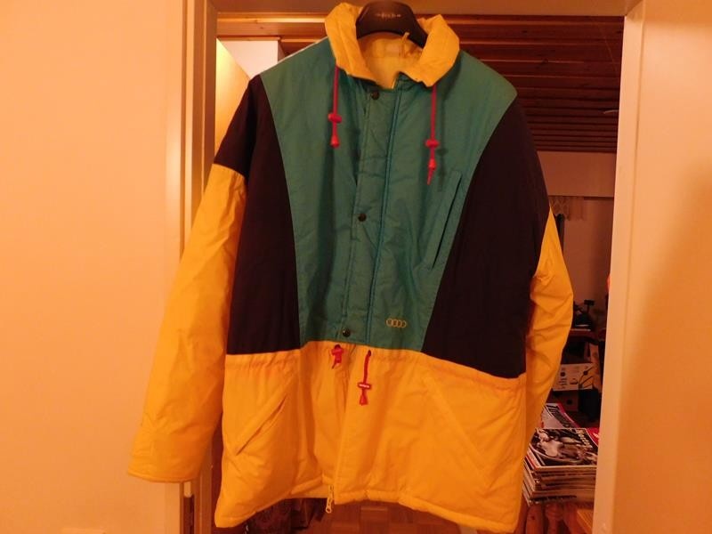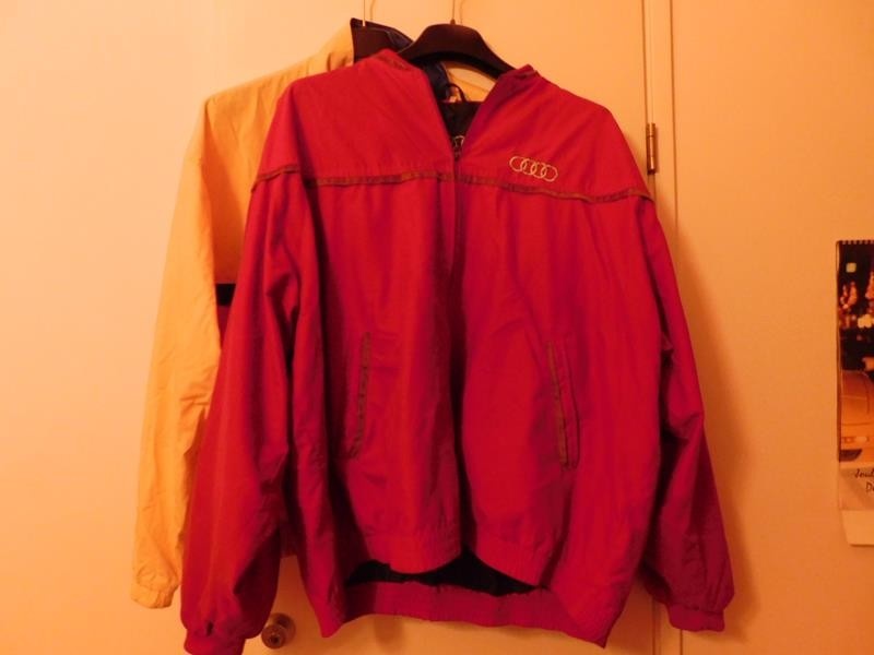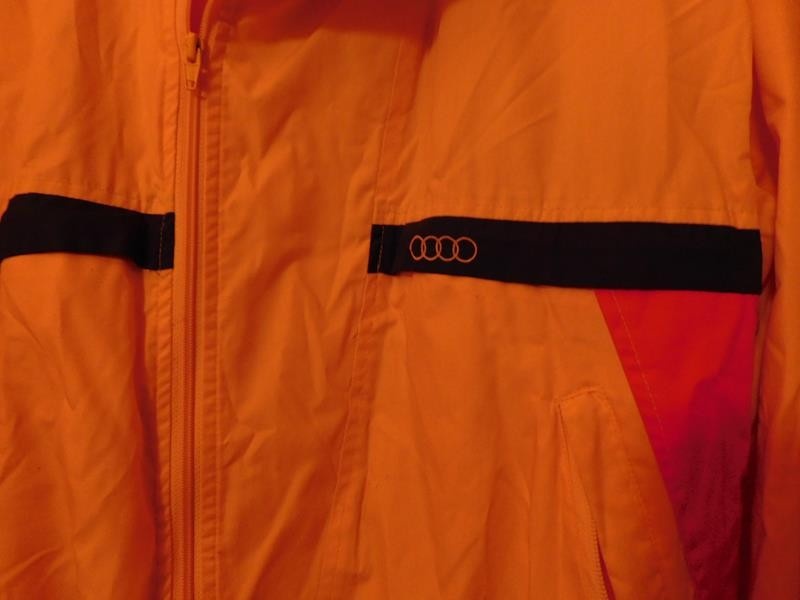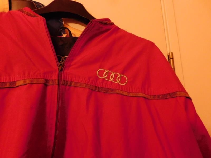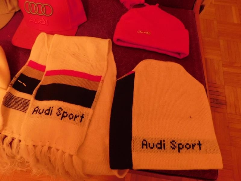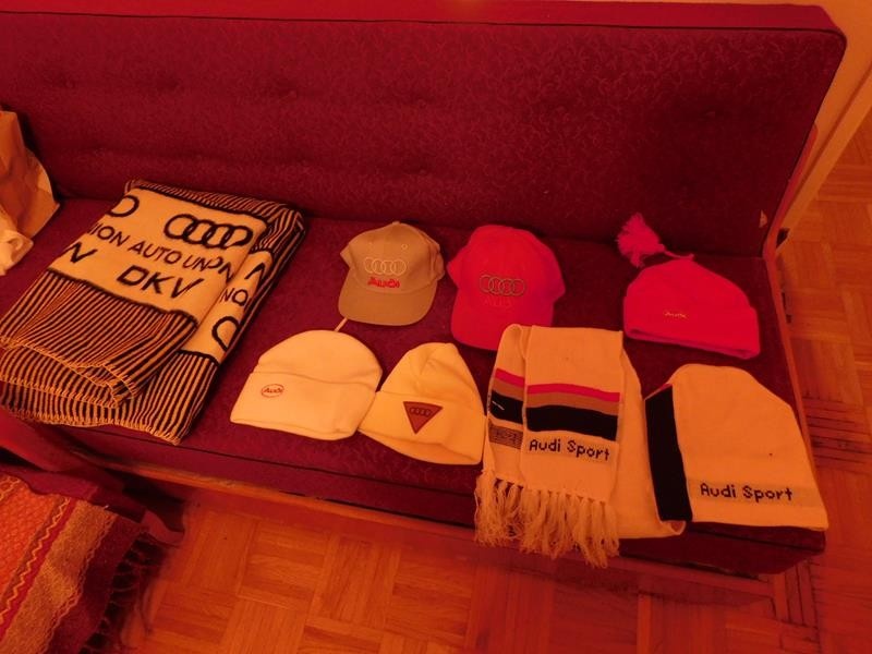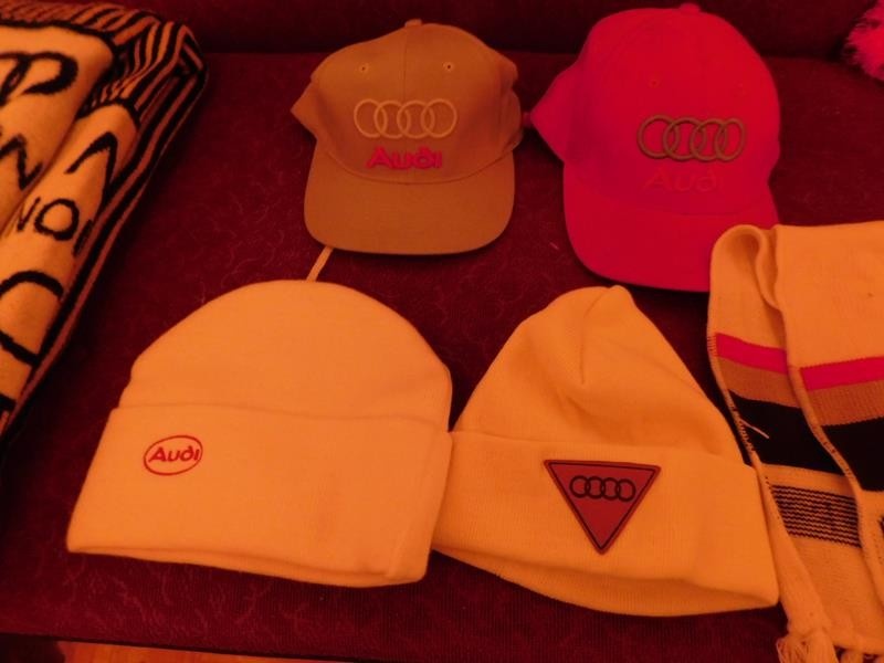 Erä erilaisia Audi-merkillä varustettuja mainostuotteita. 3 kpl takkeja/ puseroita, pipoja, kaulaliina, lippalakit.