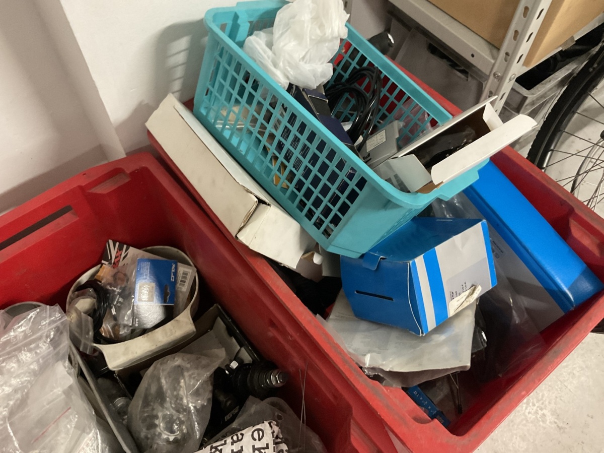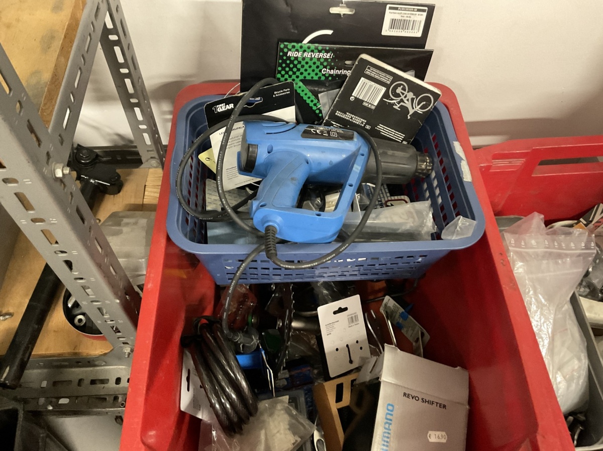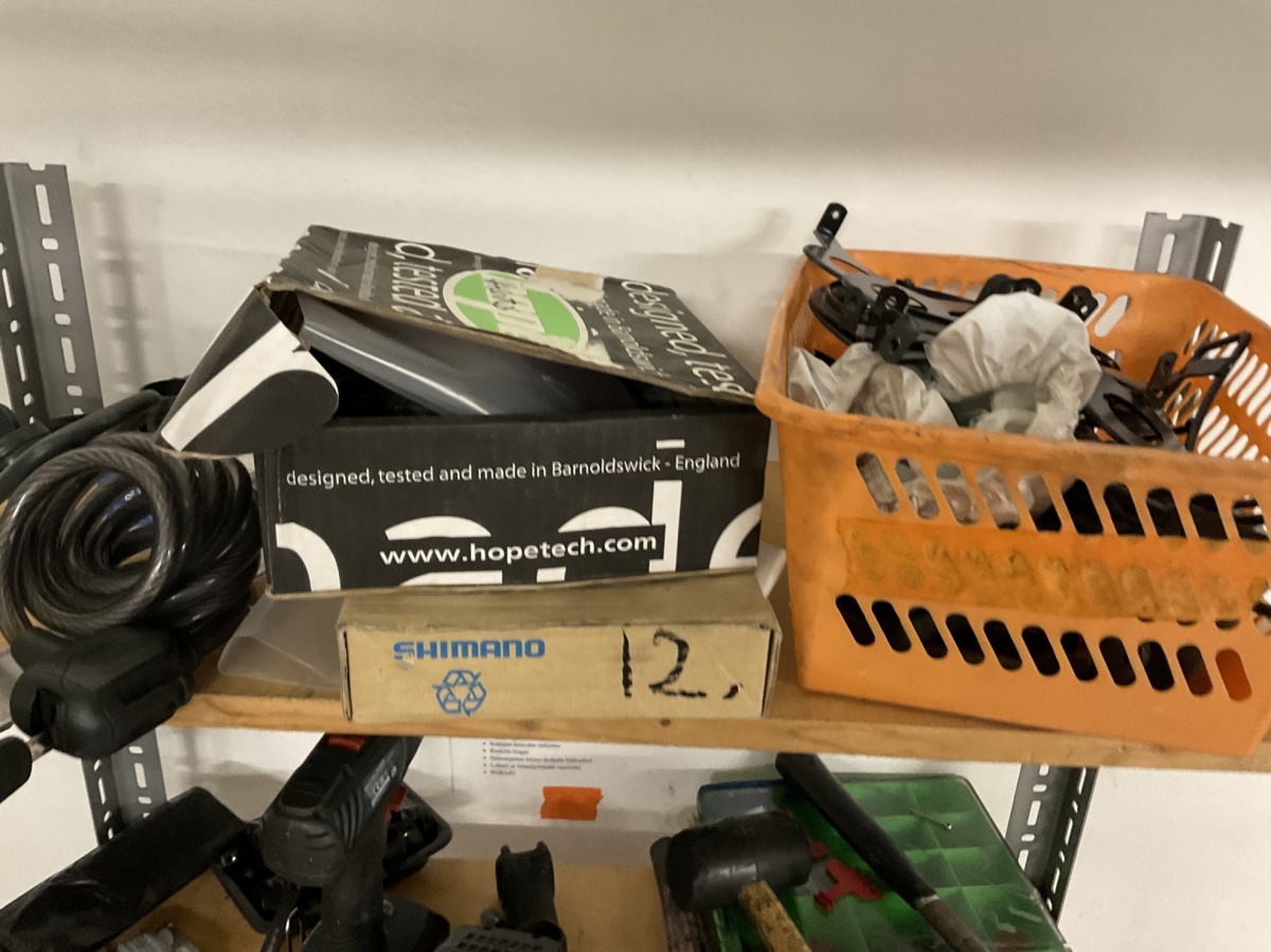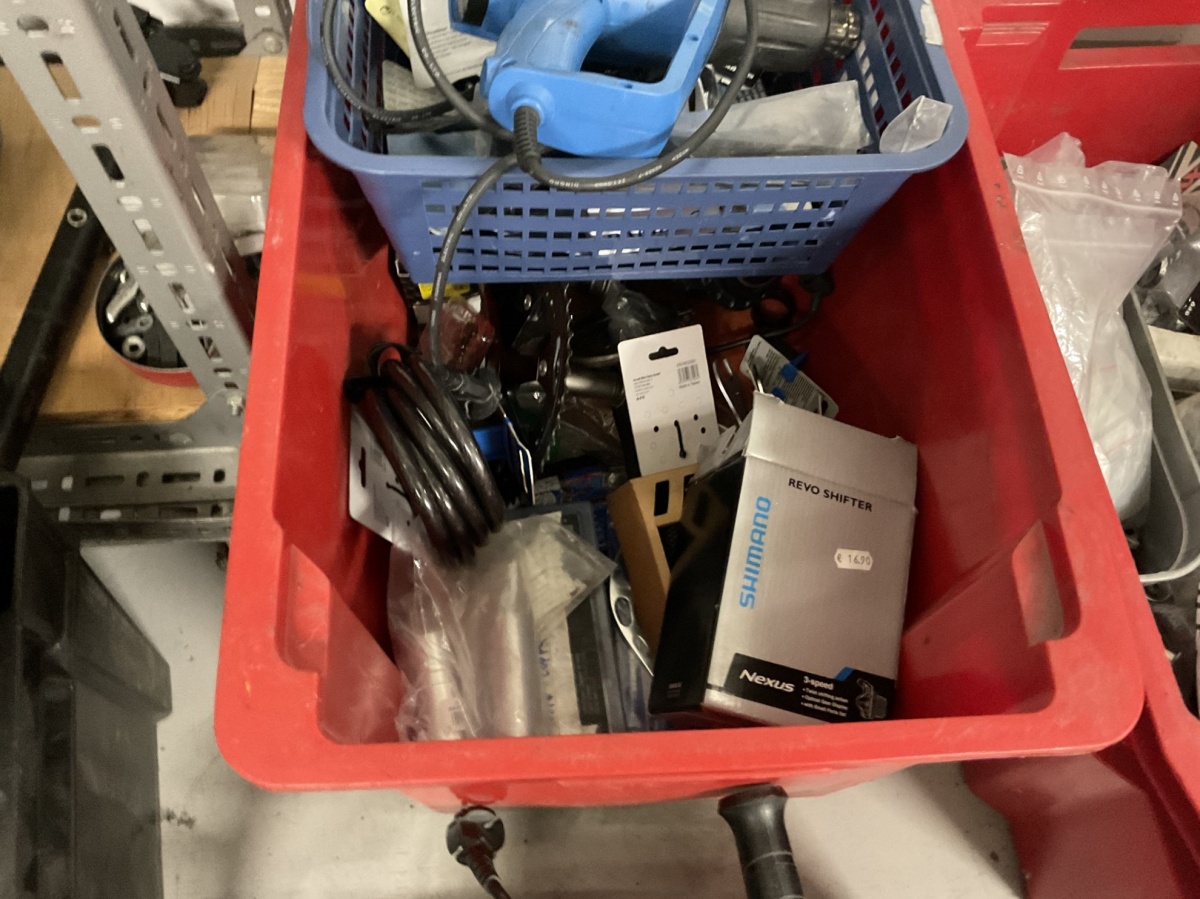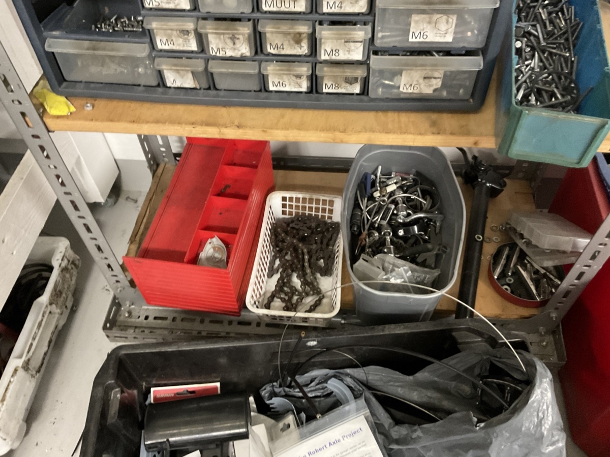 Myyntikohteet » 1. Kierrätyspyöräverstas Recykkeli /Monipalvelukeskus Tsemppi ry (1756671-3) TURKU, 03.10.2025 » 12. Hylly ja erilaisia laatikoita, joissa ketjuja, vaihde- ja jarruvaijereita, pultteja, muttereita ja sekalaisia pyörän osia