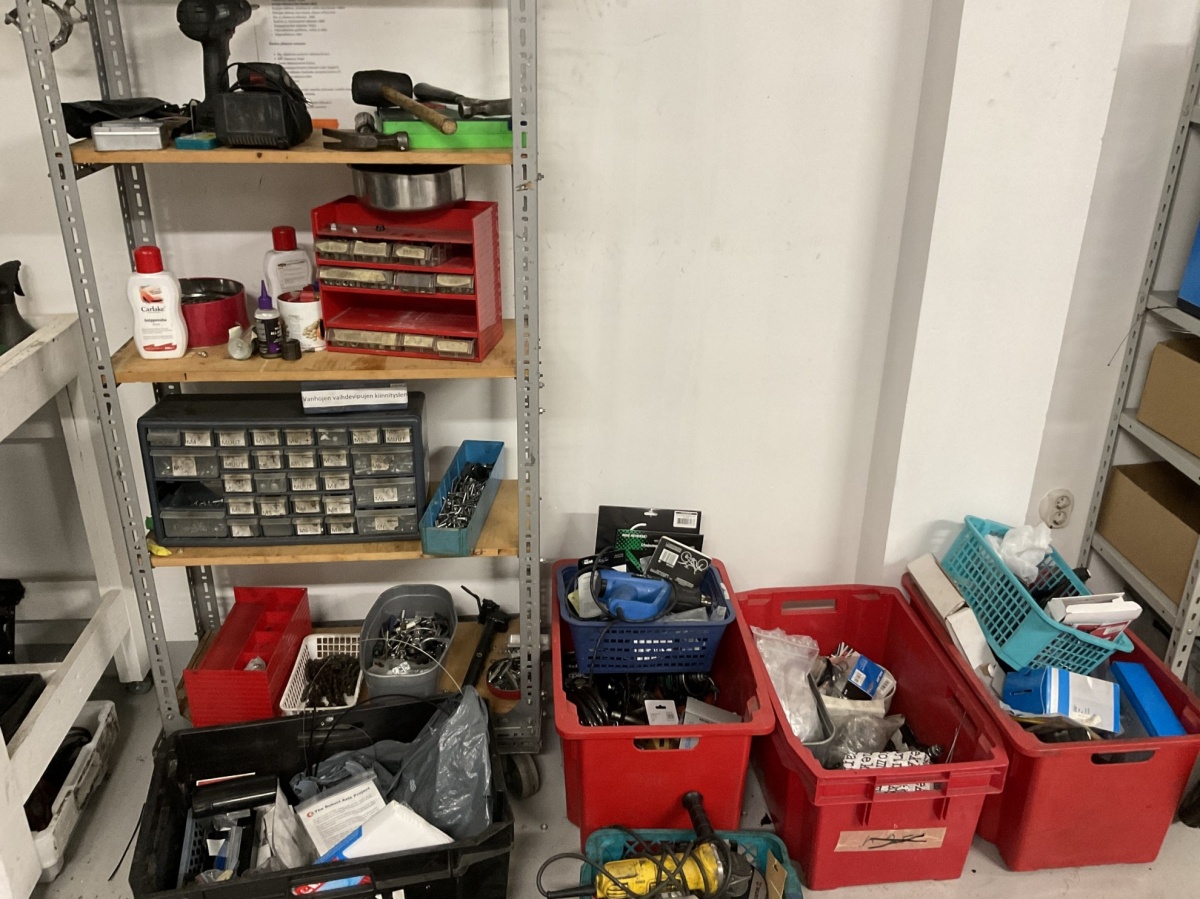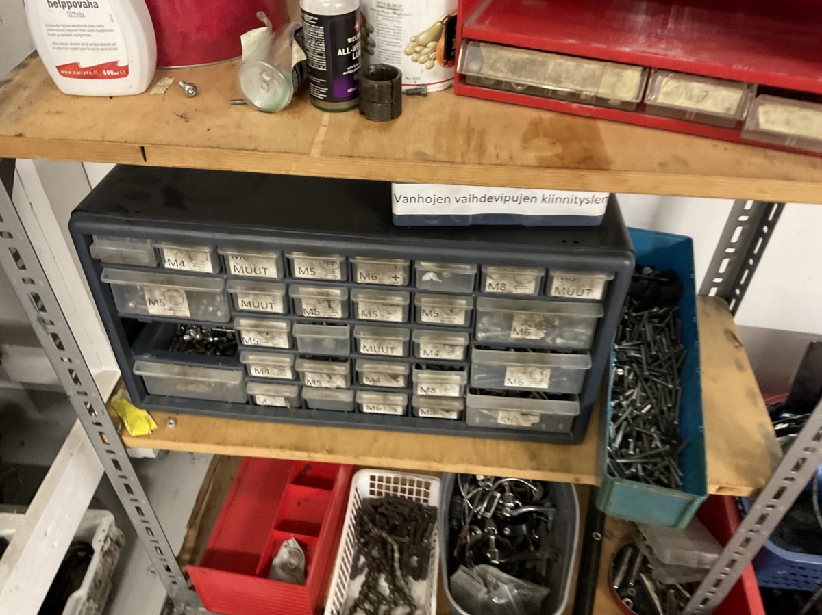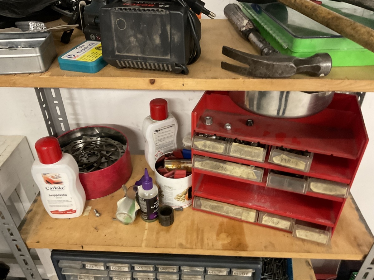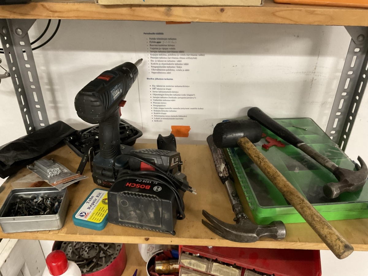 polkimia, vaihdeosia, pultteja, johtoja, sekalaisia varaosia, pieniä työkaluja ja varusteita