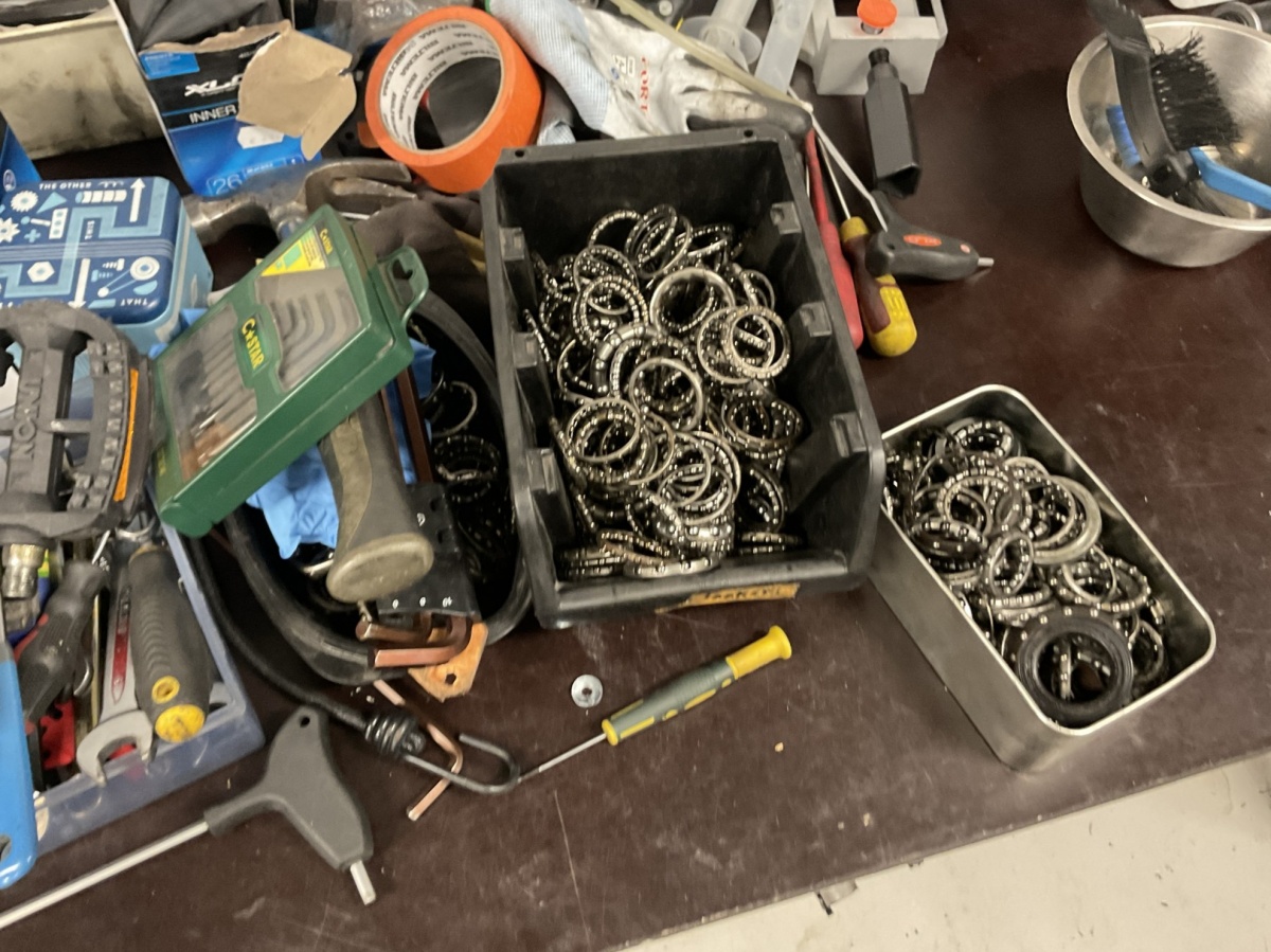 Ketjujen ja laakereiden osia (paljon kuulalaakereita koreissa).