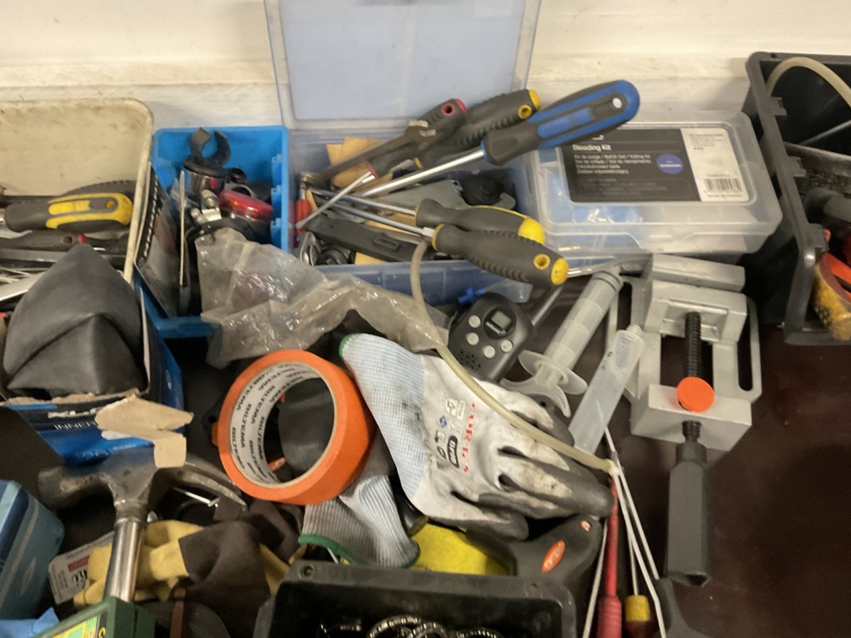 Pientarvikkeita, teippirullia, käsineitä, muovirasioita ja öljypulloja.