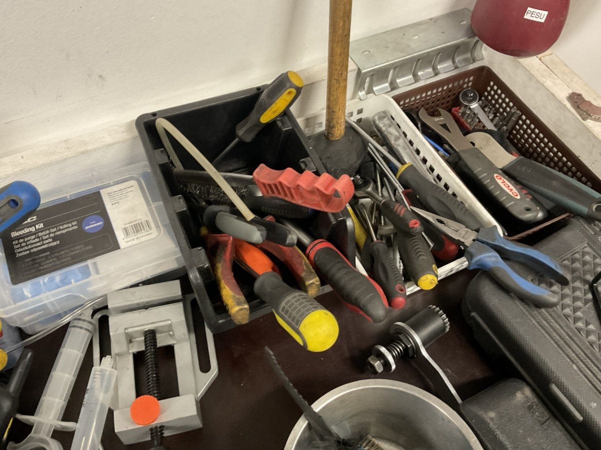 Ruuvimeisseleitä, lenkkiavaimia, kuusiokoloavaimia.