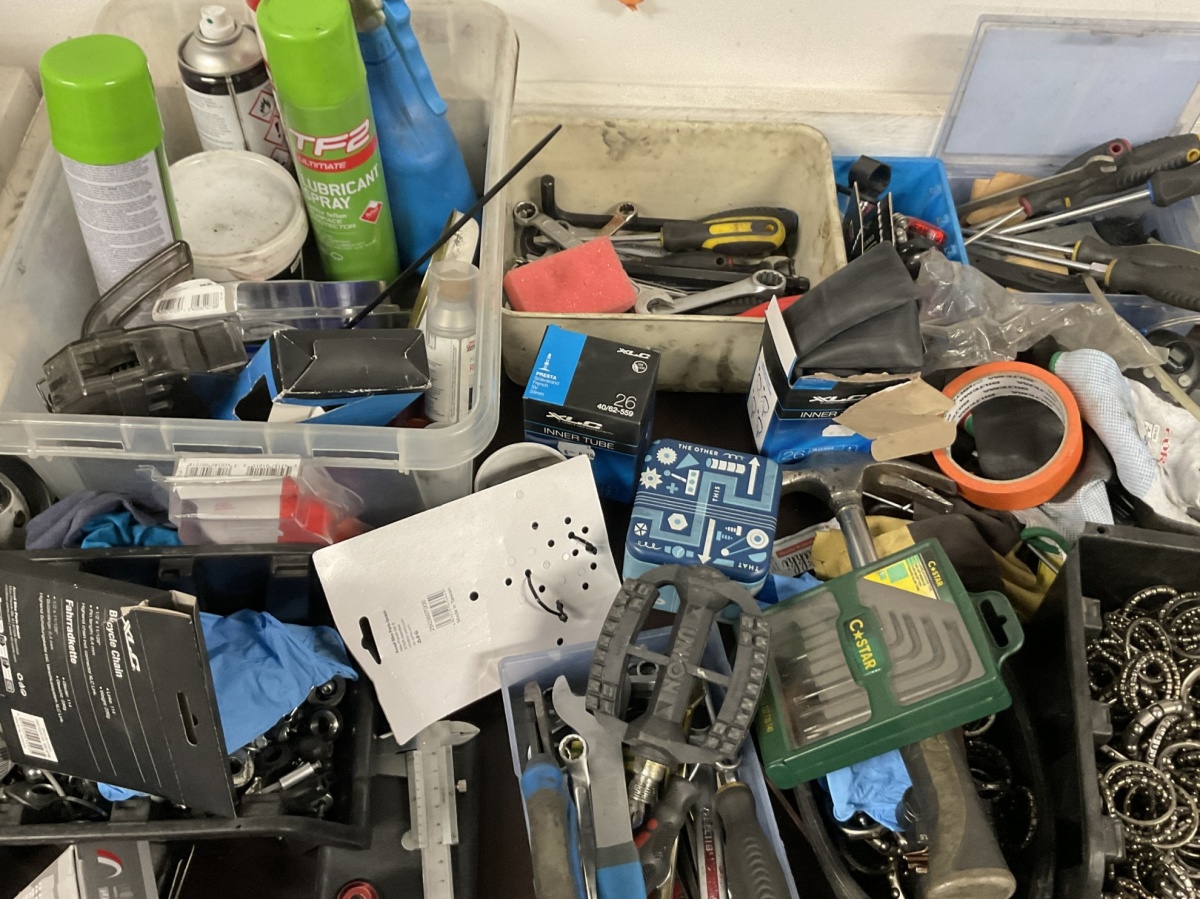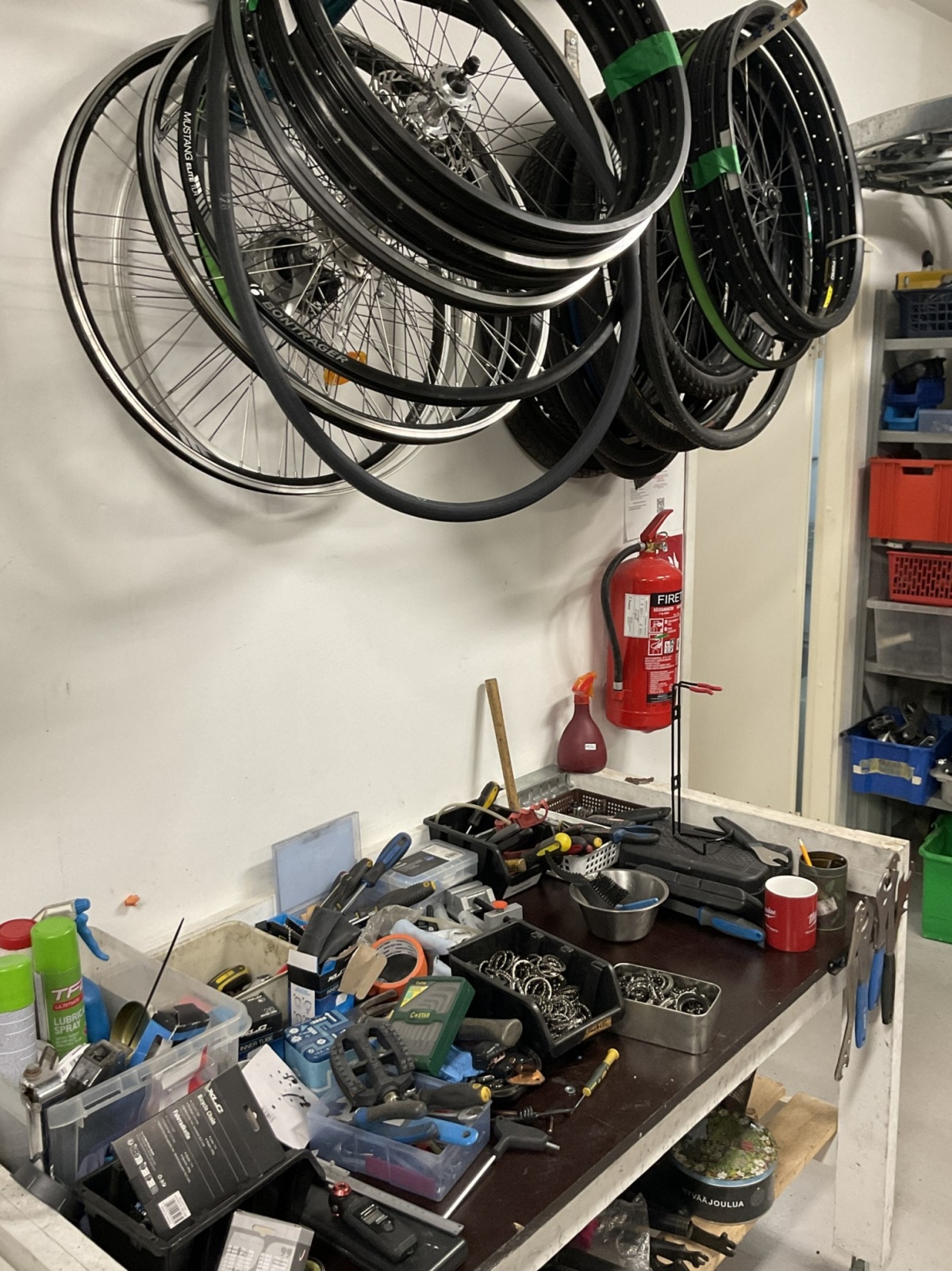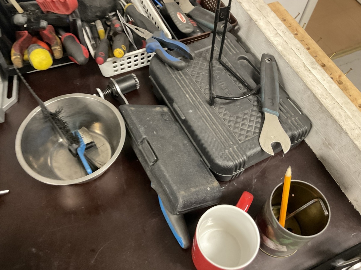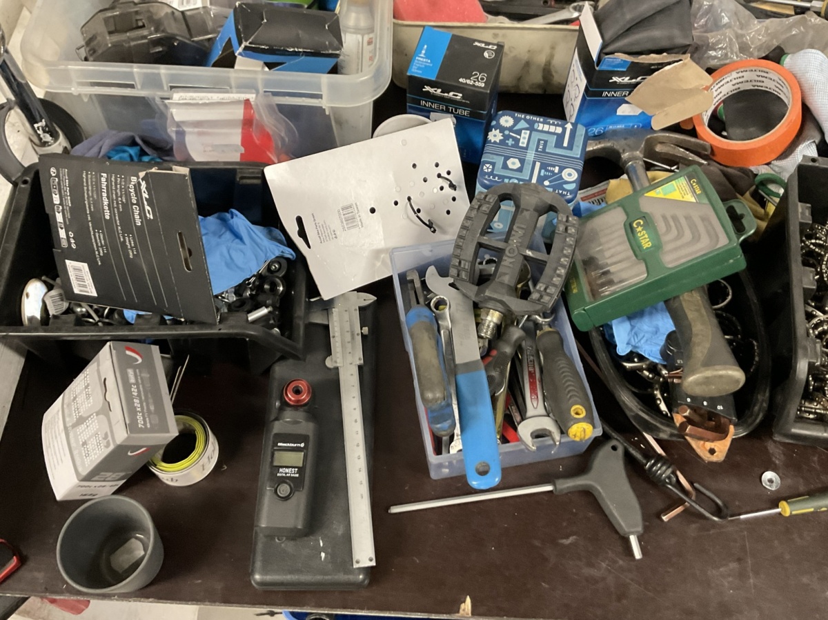 Polkupyöräkorjaamon/työpajan työpöytä ja polkupyörien osat ja tarvikkeet + työkalut mm.