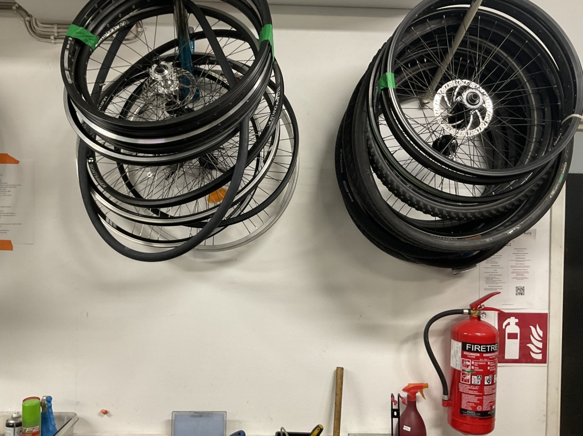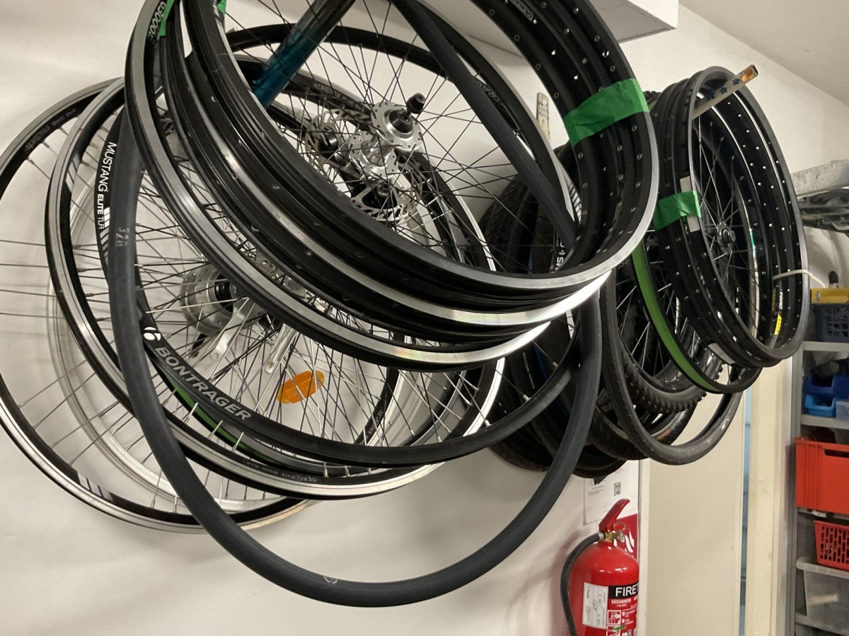 Seinällä – roikkuvia kokonaisia pyörän vanteita ja renkaita, osa jarrulevyillä.