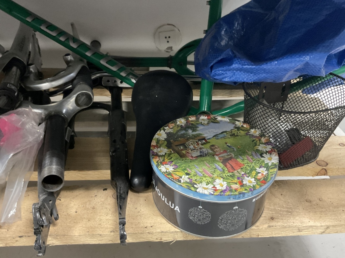 Hyllyjen alla – erilaisten pyörän osien varastointia.