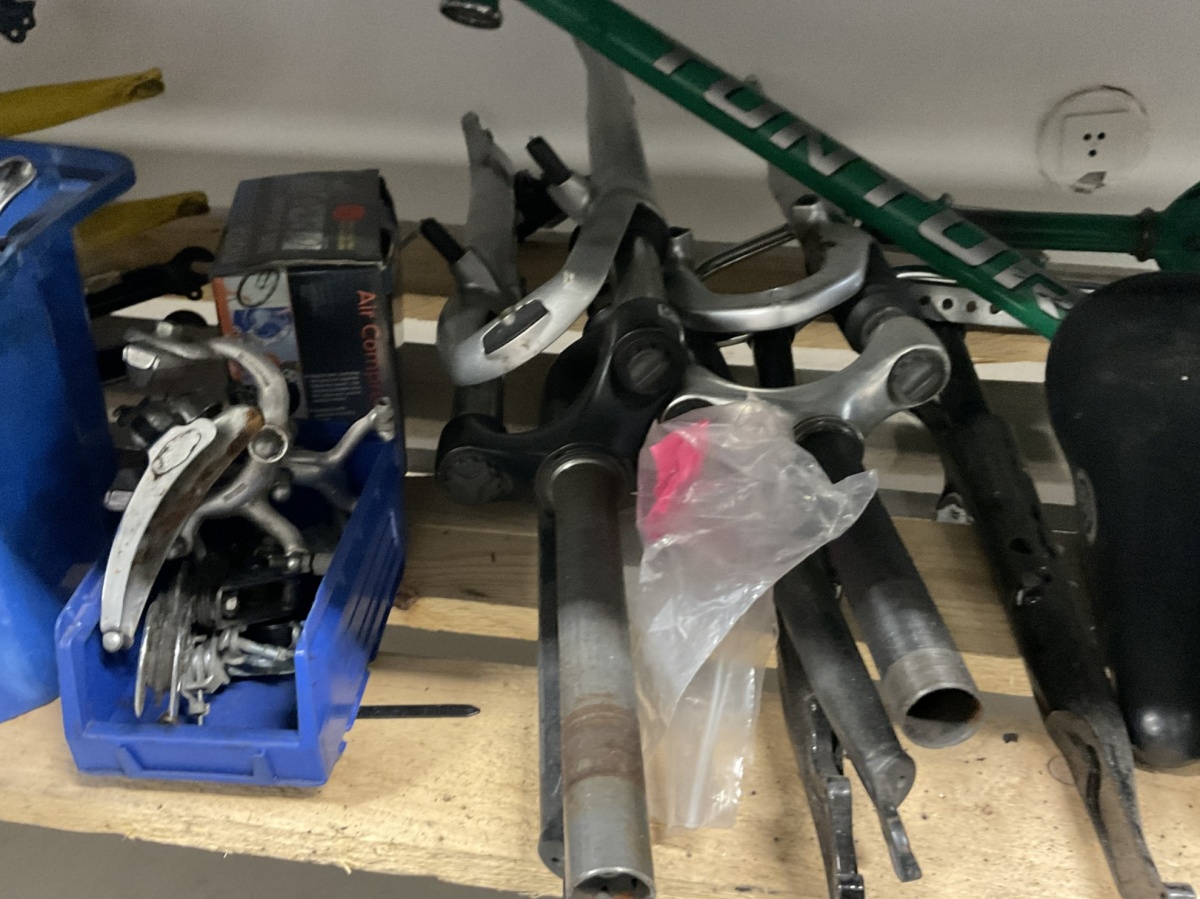 Polkupyörän haarukoita, ohjainlaakereita, satuloita.