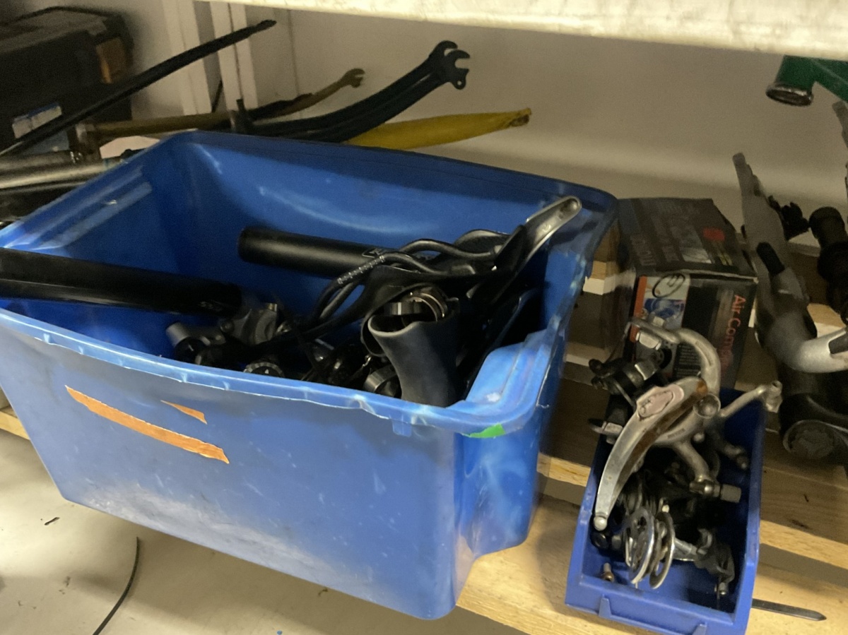 Sinisissä laatikoissa polkupyörän osia, esim. jarruja, ohjainkannattimia ja tankoja.
