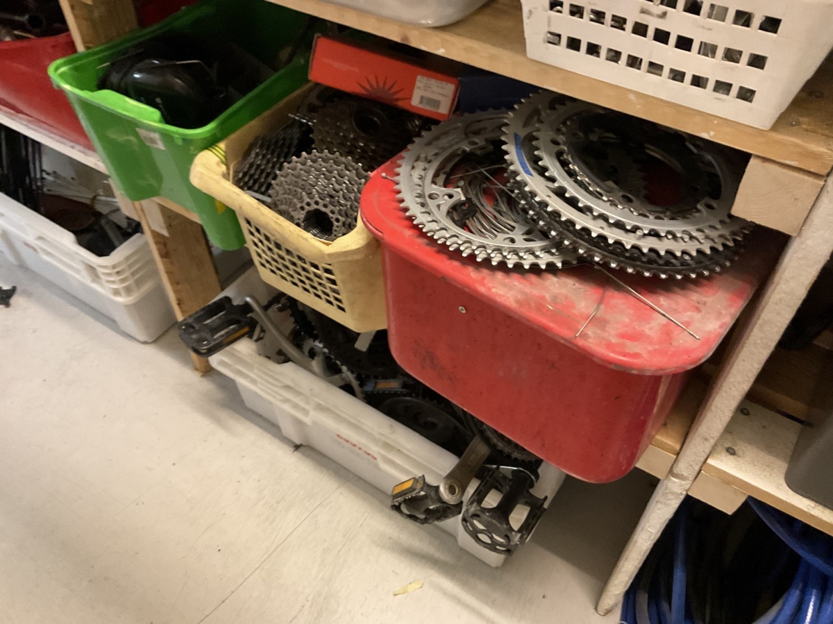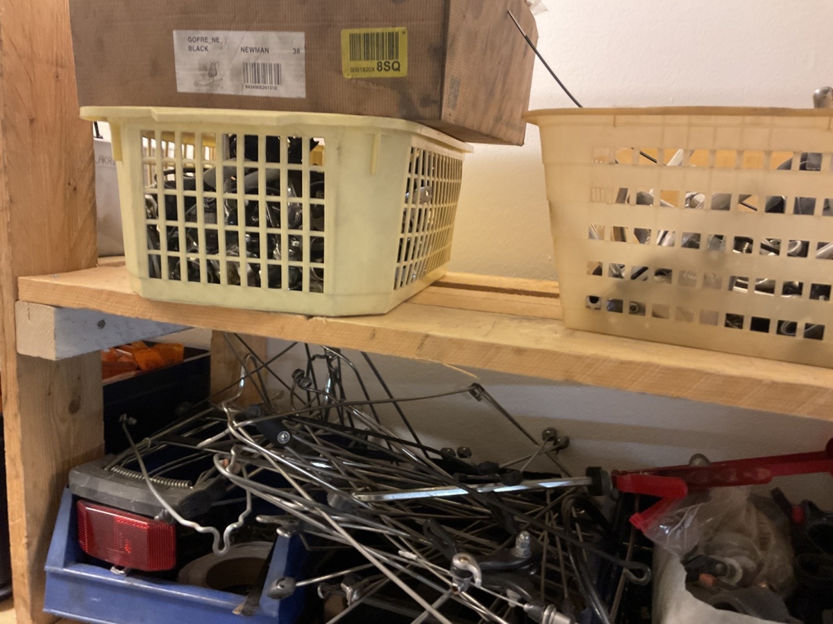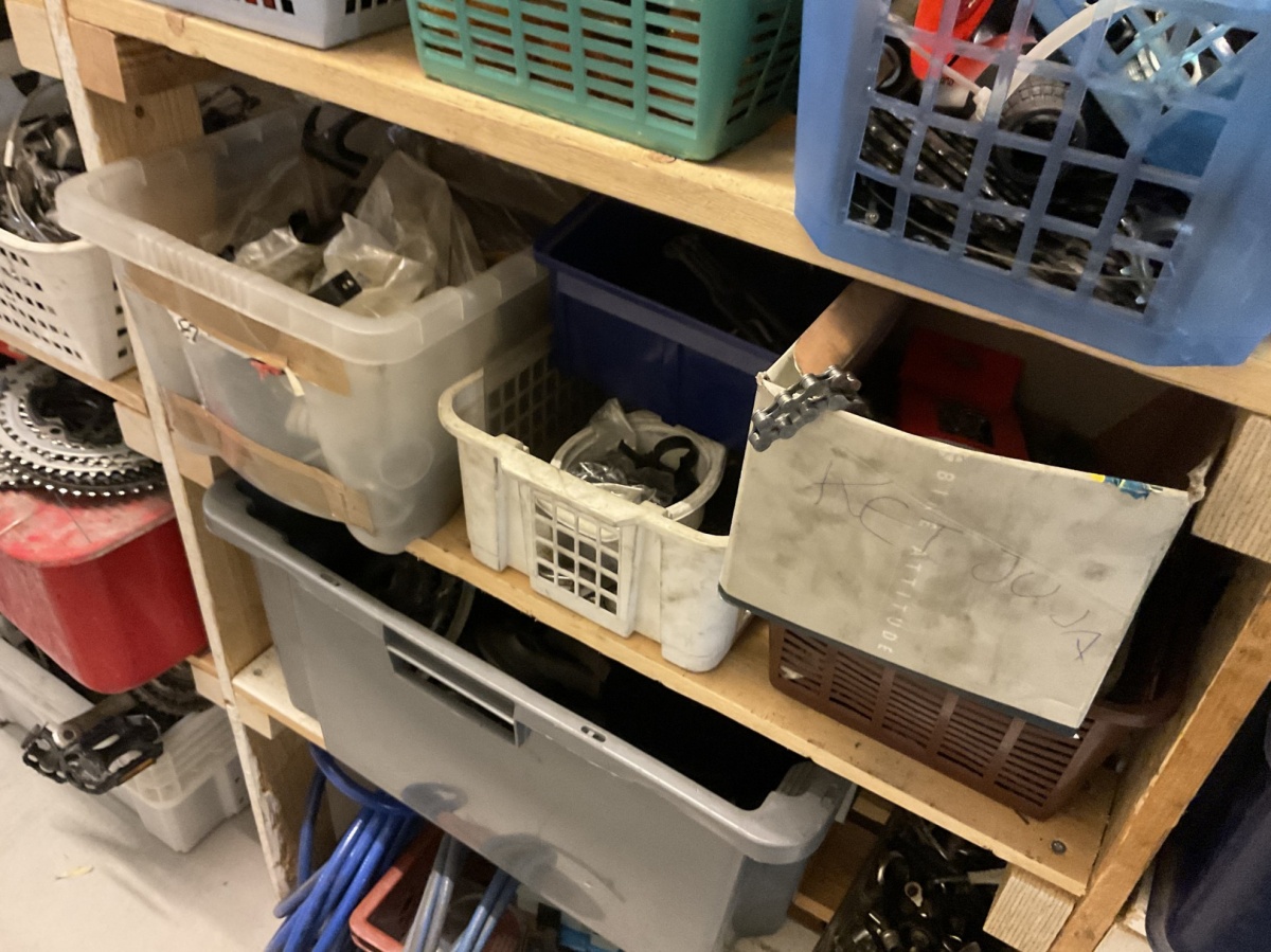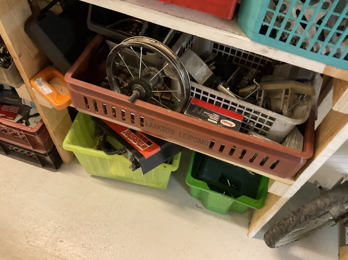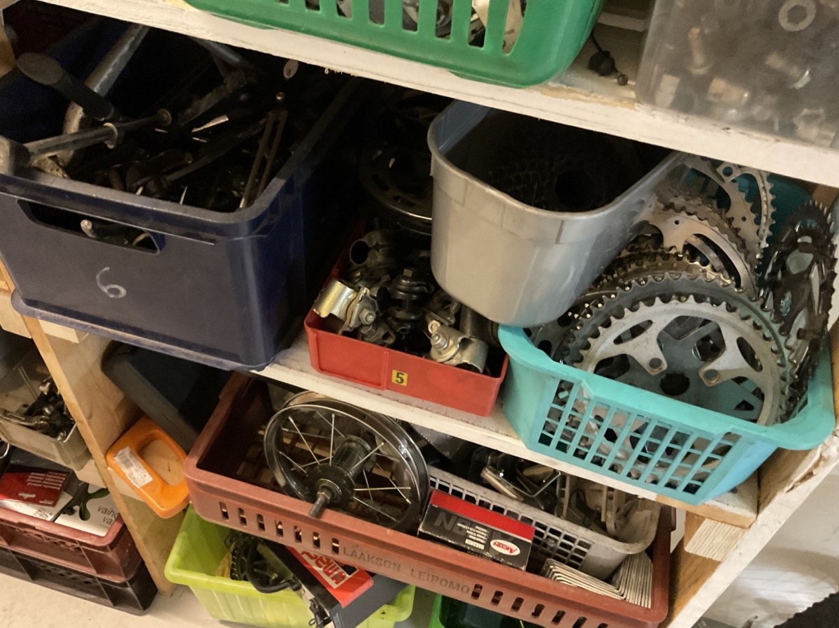 Myyntikohteet » 1. Kierrätyspyöräverstas Recykkeli /Monipalvelukeskus Tsemppi ry (1756671-3) TURKU, 03.10.2025 » 19. Polkupyöräpajan varastohylly, jossa on paljon lajittelemattomia pyörien huoltoon ja korjaukseen liittyviä tarvikkeita.