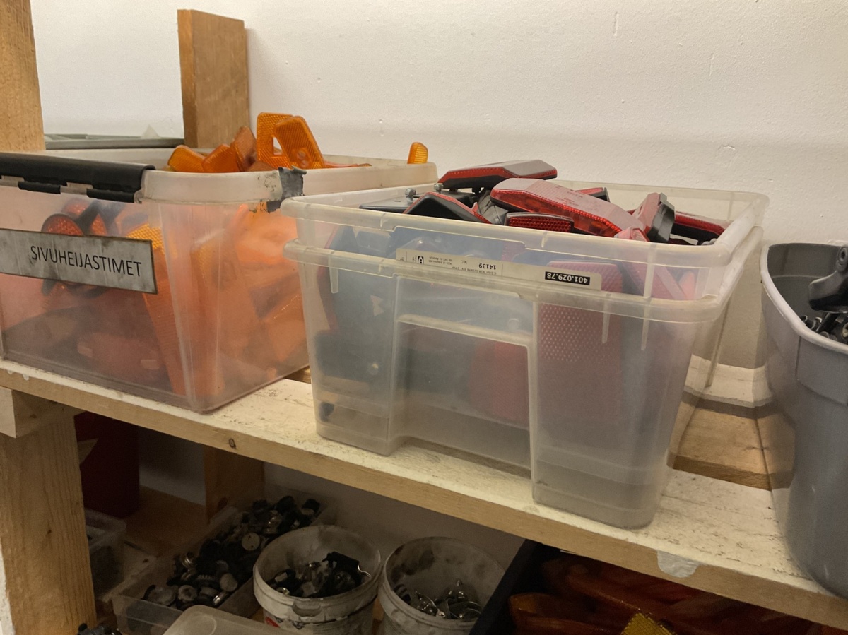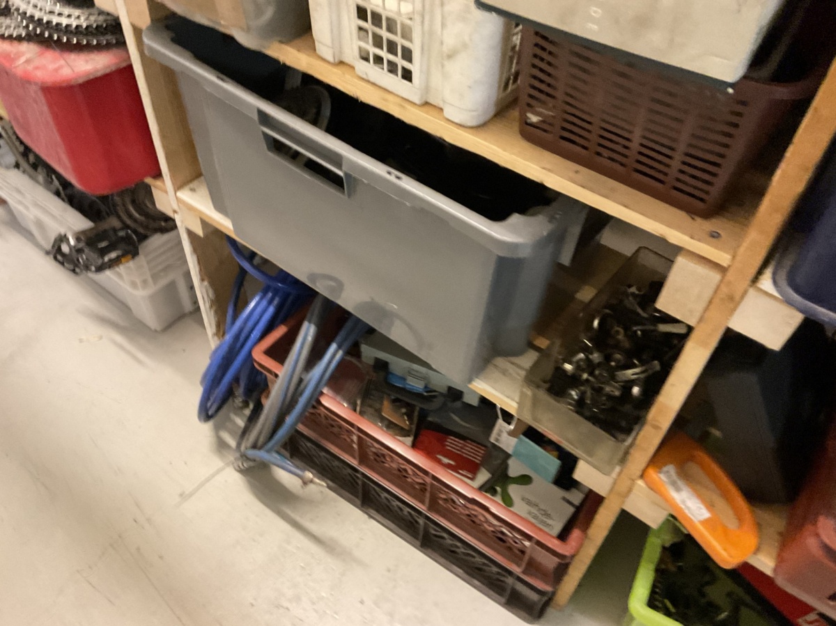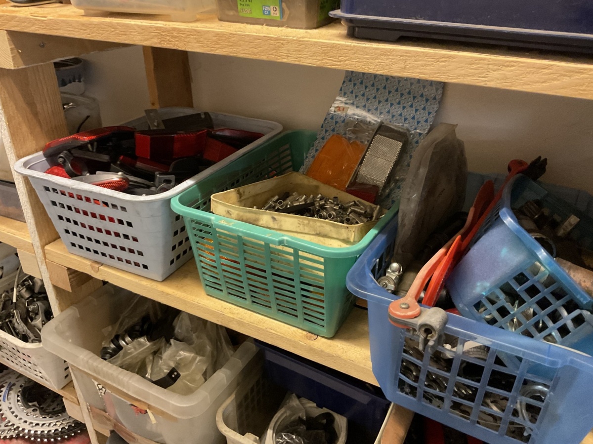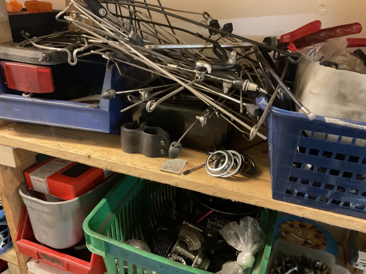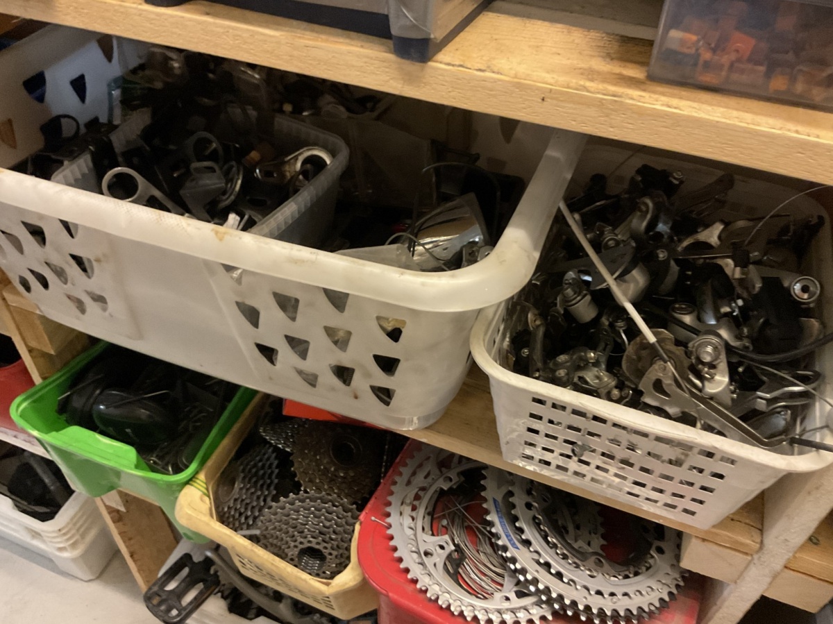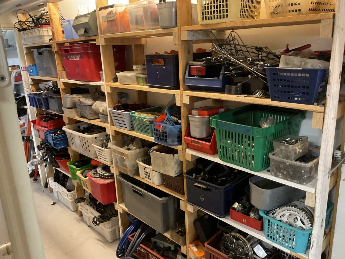 Myyntikohteet » 1. Kierrätyspyöräverstas Recykkeli /Monipalvelukeskus Tsemppi ry (1756671-3) TURKU, 03.10.2025 » 19. Polkupyöräpajan varastohylly, jossa on paljon lajittelemattomia pyörien huoltoon ja korjaukseen liittyviä tarvikkeita.