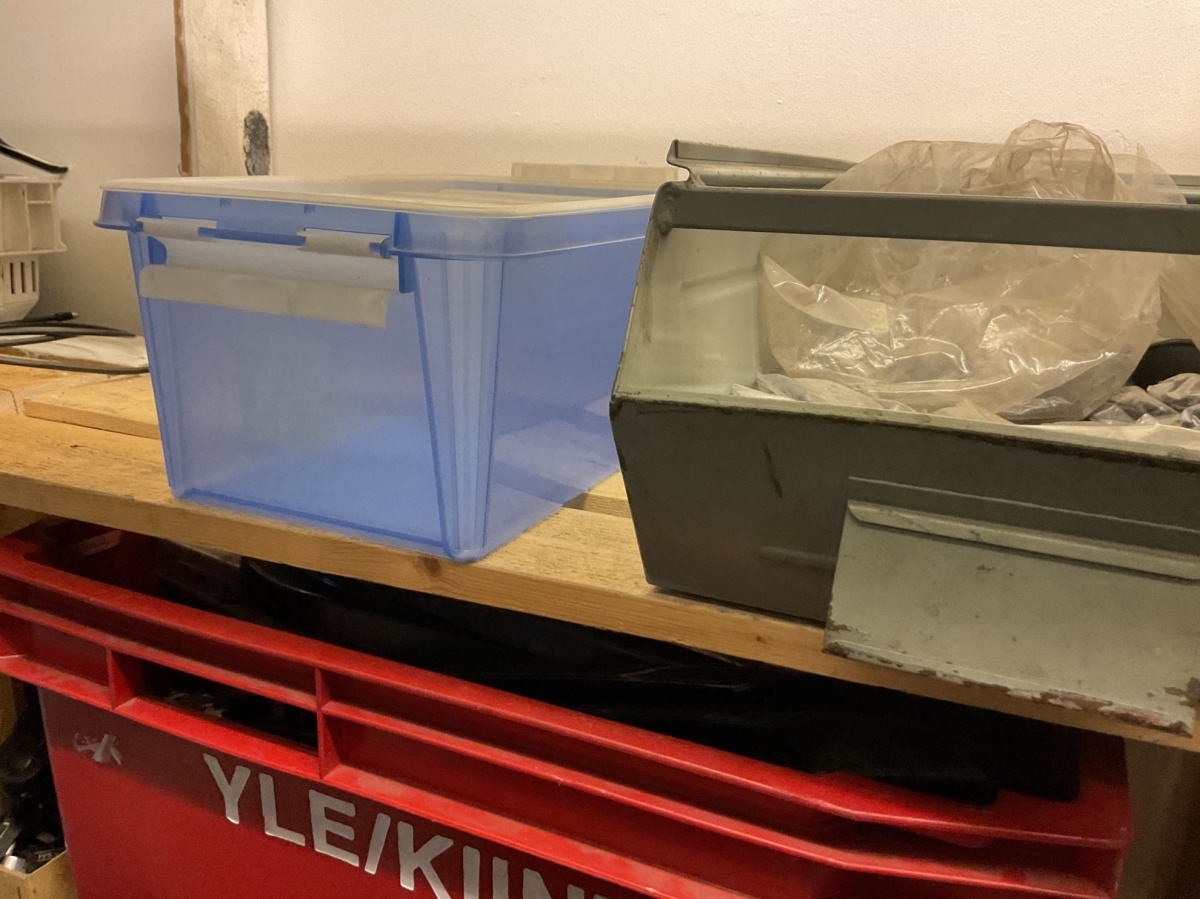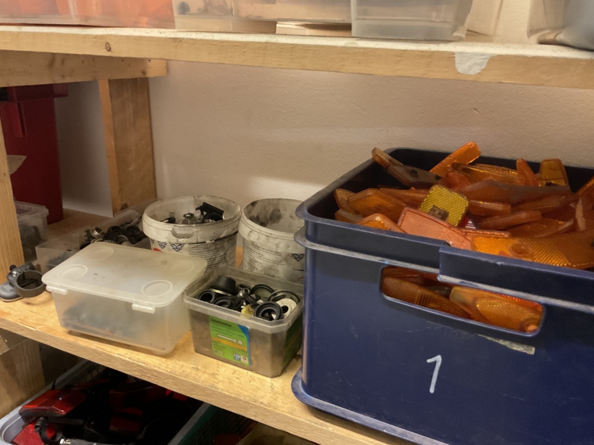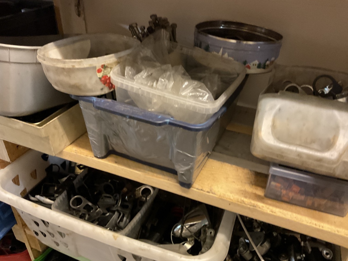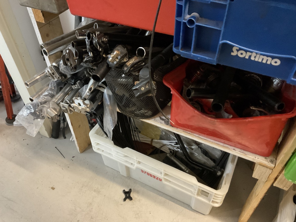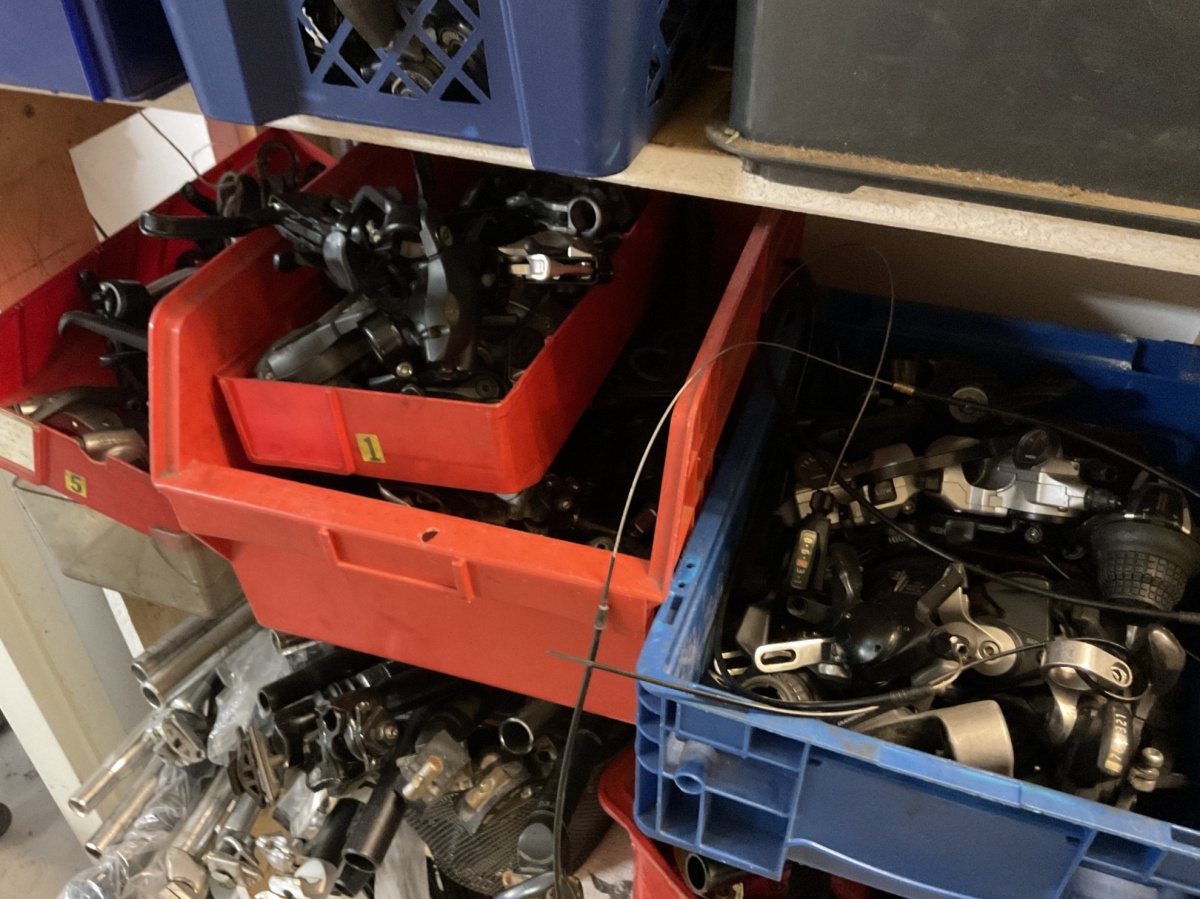 Myyntikohteet » 1. Kierrätyspyöräverstas Recykkeli /Monipalvelukeskus Tsemppi ry (1756671-3) TURKU, 03.10.2025 » 19. Polkupyöräpajan varastohylly, jossa on paljon lajittelemattomia pyörien huoltoon ja korjaukseen liittyviä tarvikkeita.