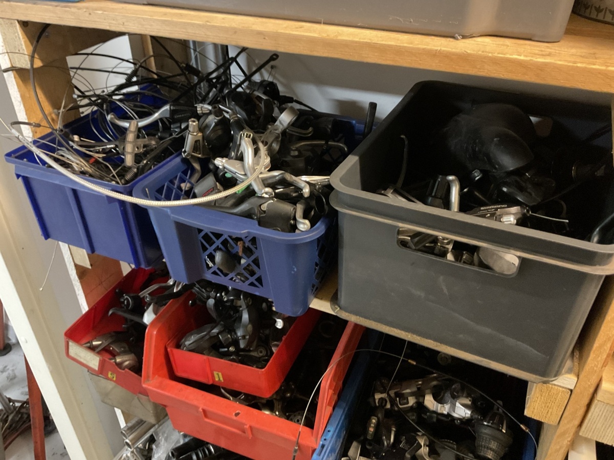 Polkupyöräpajan varastohylly, jossa on paljon lajittelemattomia pyörien huoltoon ja korjaukseen liittyviä tarvikkeita.