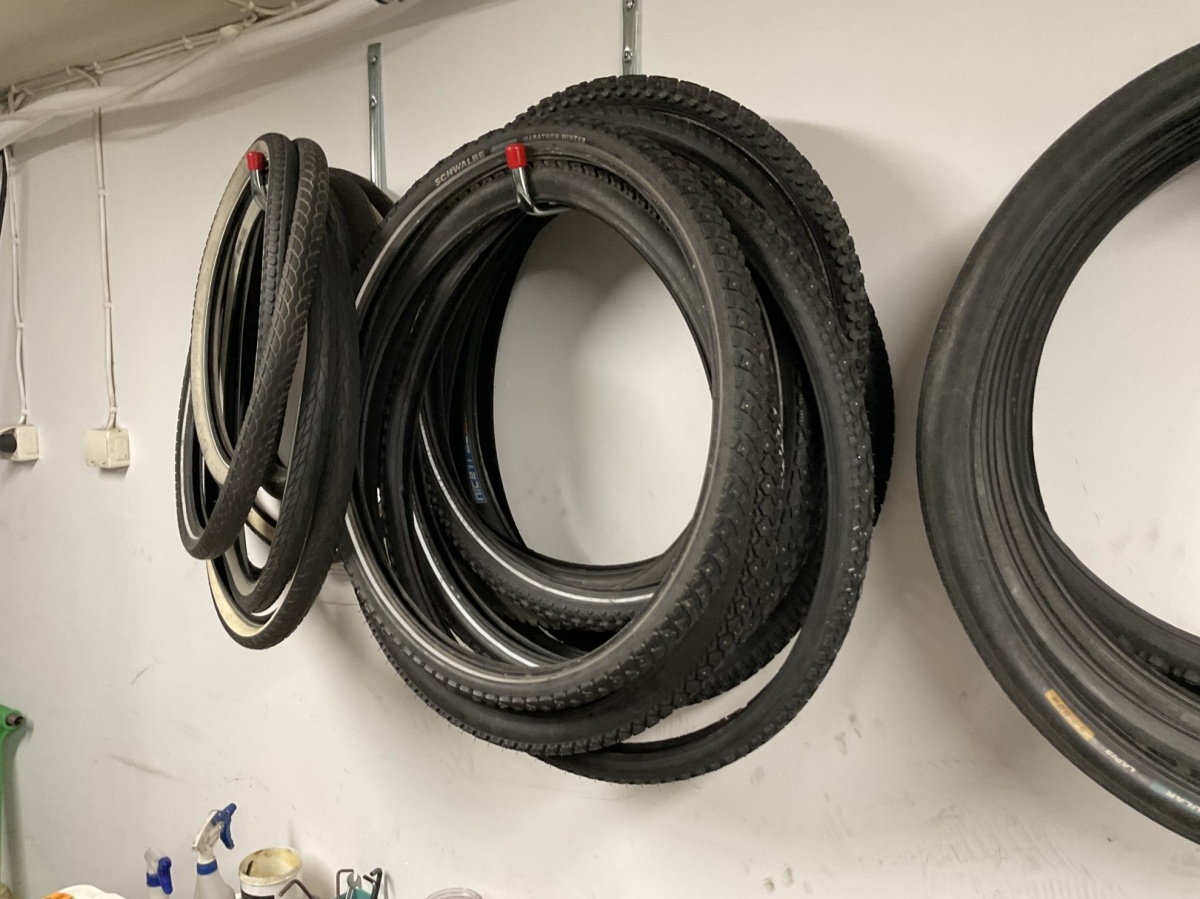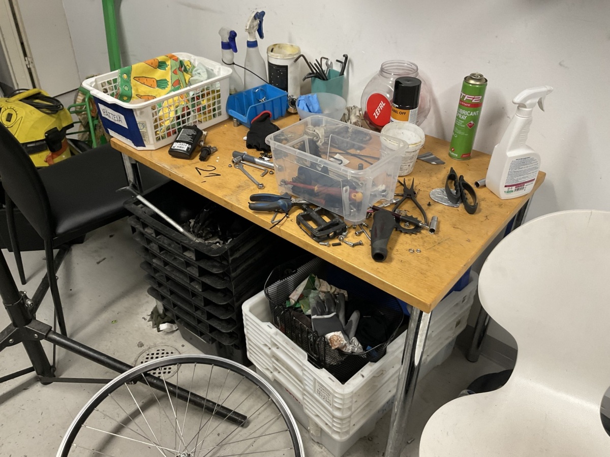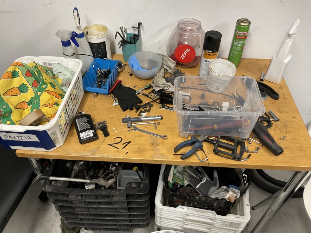 Myyntikohteet » 1. Kierrätyspyöräverstas Recykkeli /Monipalvelukeskus Tsemppi ry (1756671-3) TURKU, 03.10.2025 » 21. Pyörähuoltoon varattu työtilaa/nurkkaus, jossa on työkaluja, huoltovälineitä sekä varaosia, renkaita ja vanteita.