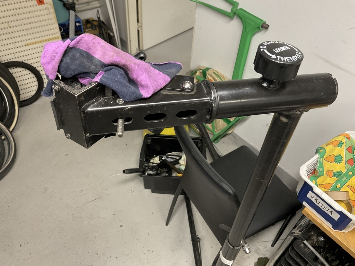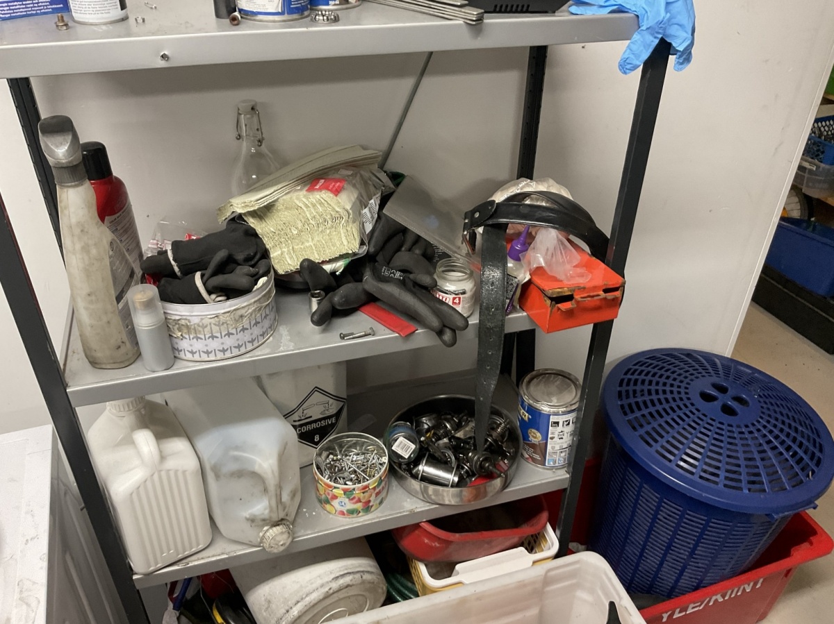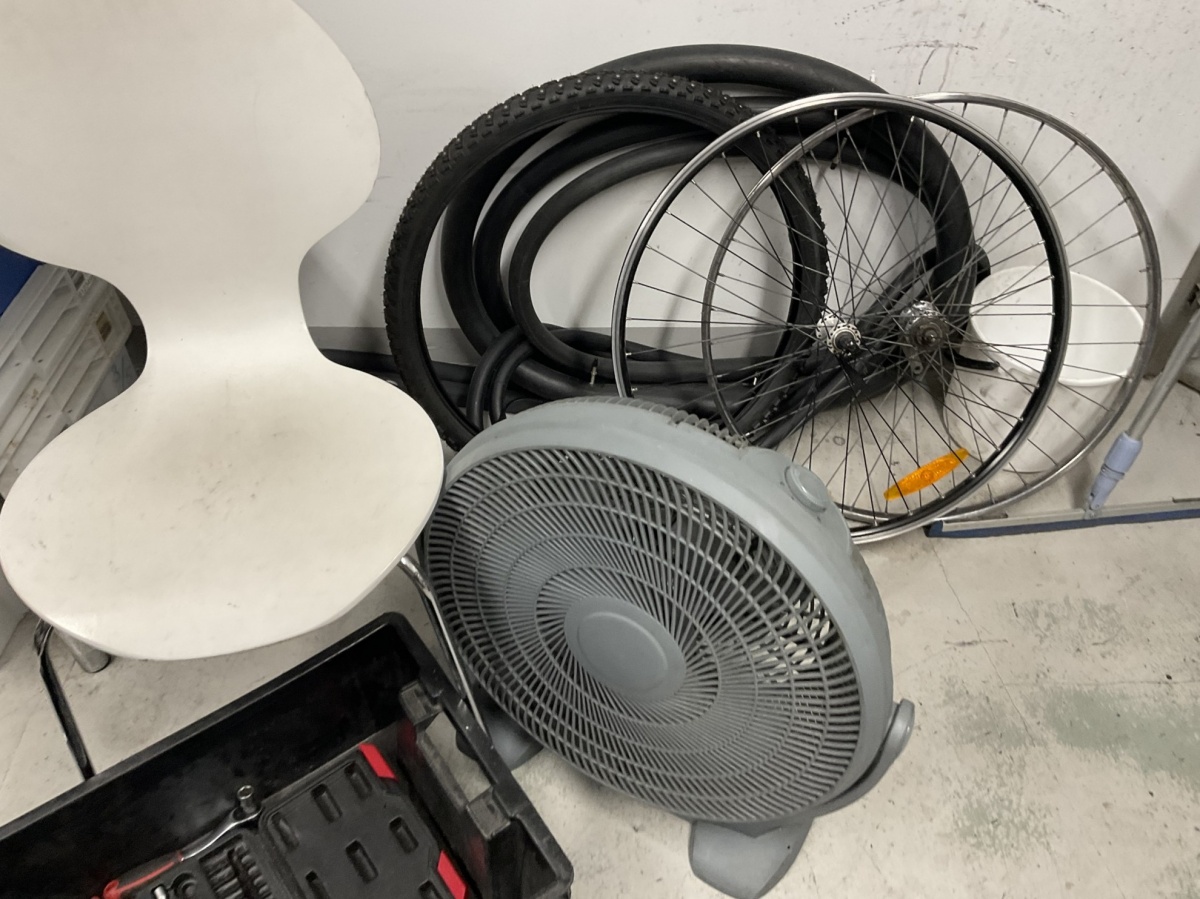 Myyntikohteet » 1. Kierrätyspyöräverstas Recykkeli /Monipalvelukeskus Tsemppi ry (1756671-3) TURKU, 03.10.2025 » 21. Pyörähuoltoon varattu työtilaa/nurkkaus, jossa on työkaluja, huoltovälineitä sekä varaosia, renkaita ja vanteita.
