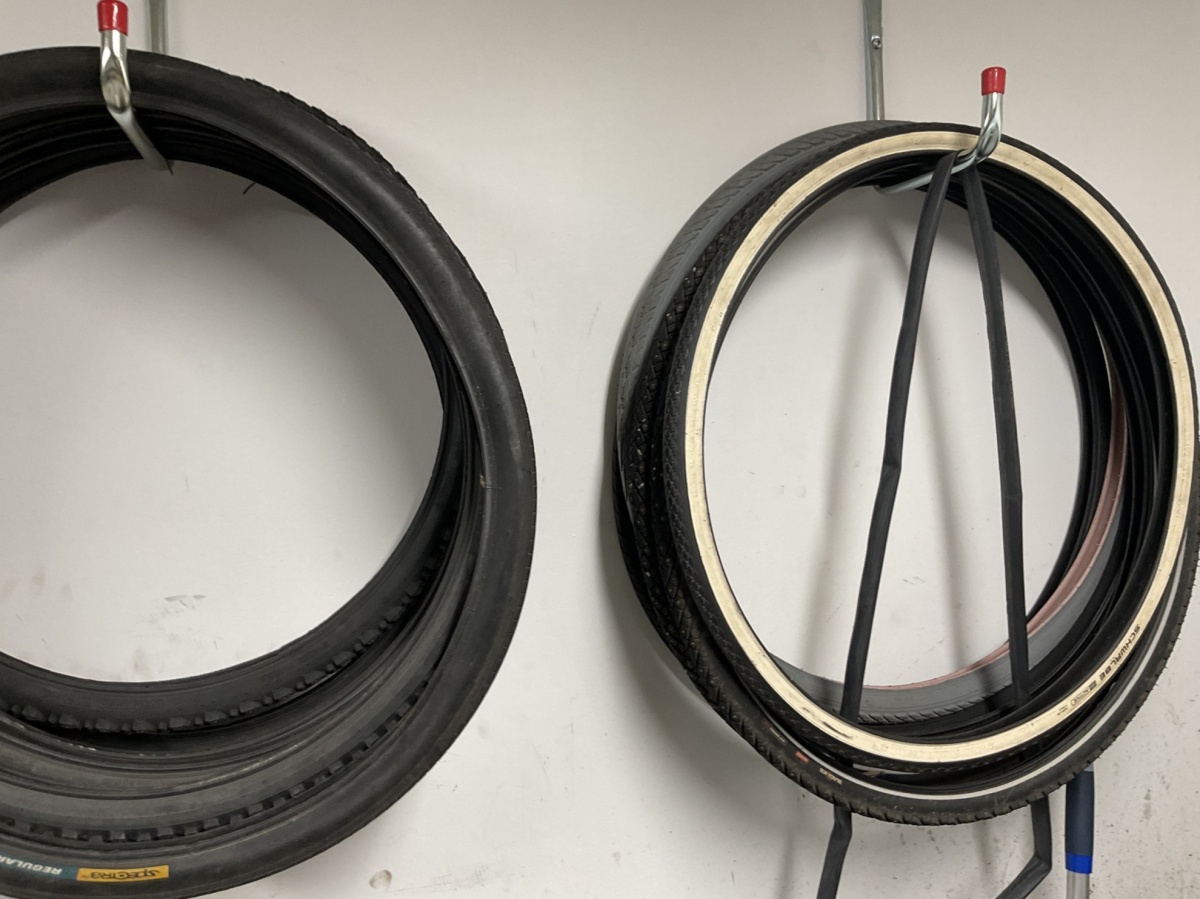 Polkupyörän ulkokumeja eri kokoisina. Työkaluja, pieniä varaosia. Pyöräteline (huoltostandi)