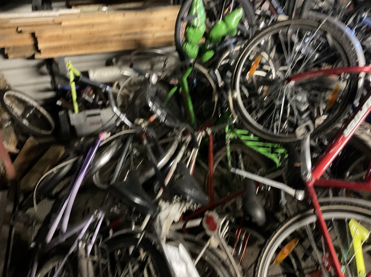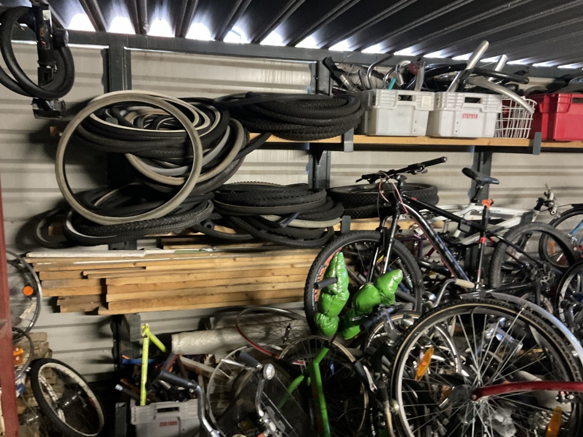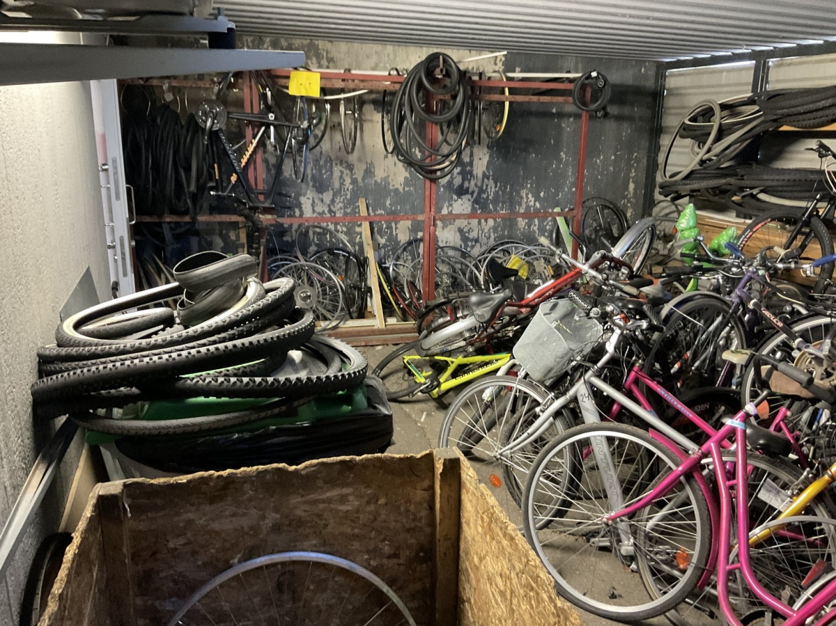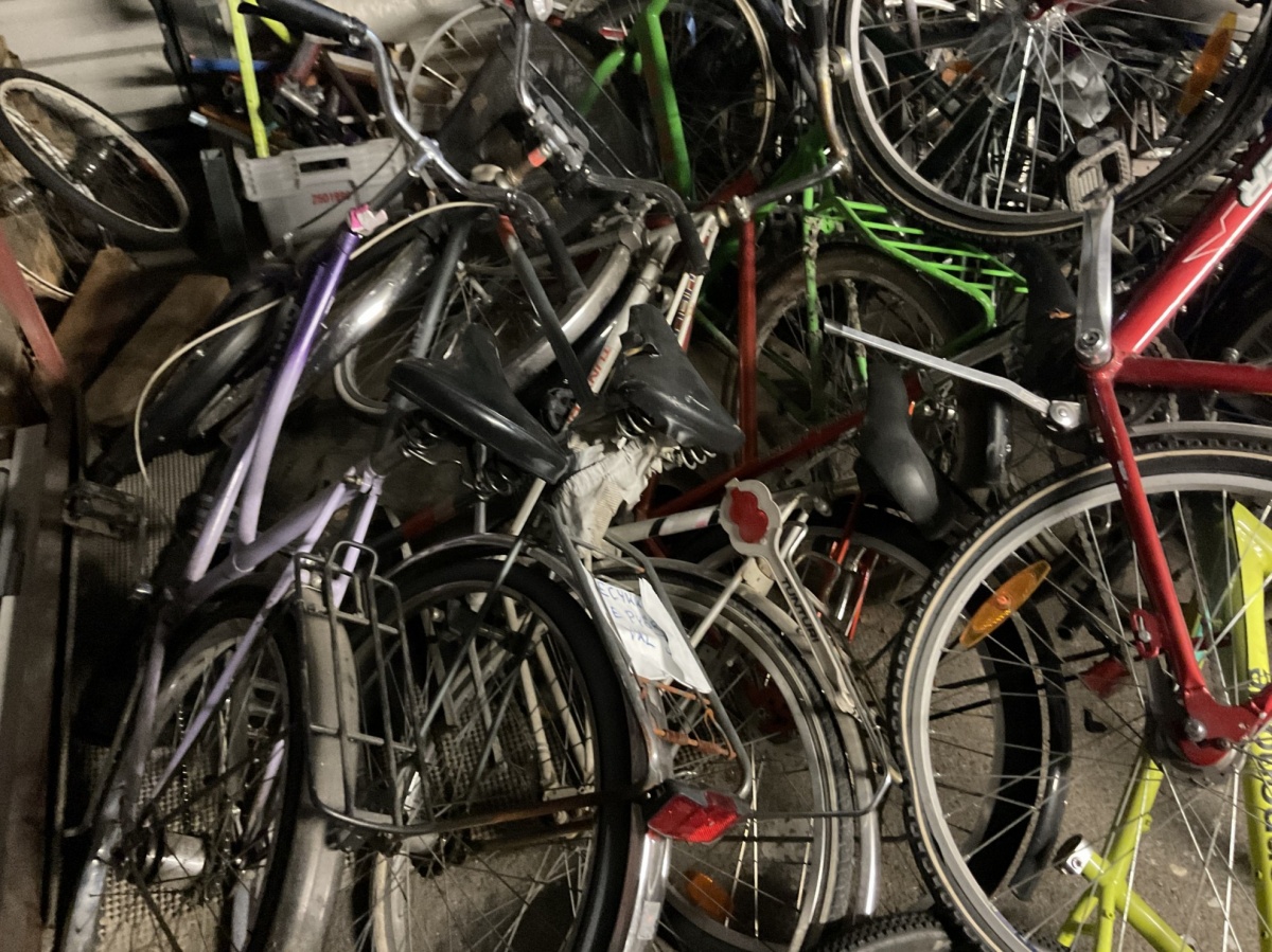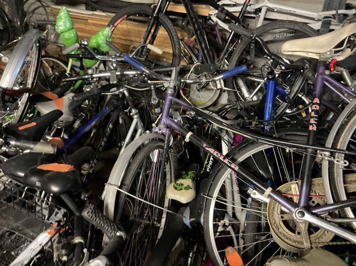 Pyörävarasto, jossa iso määrä käytettyjä, kunnostettavia tai varaosiksi tarkoitettuja polkupyöriä.