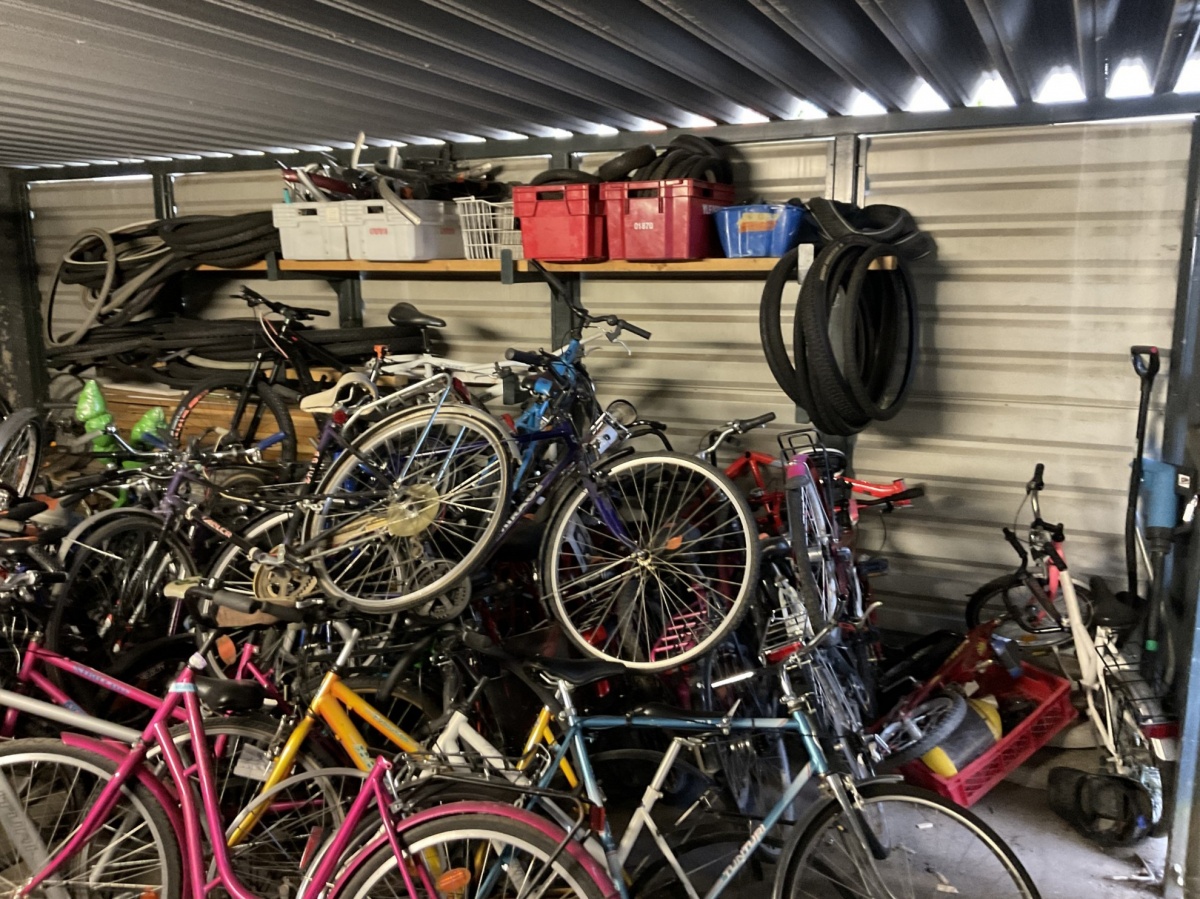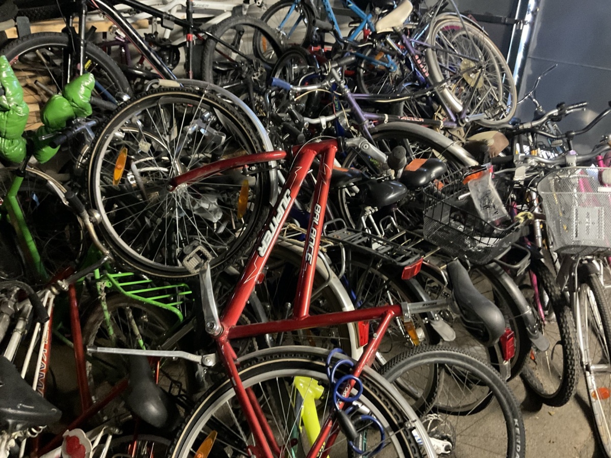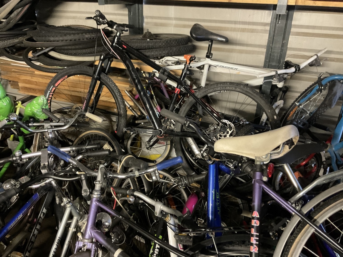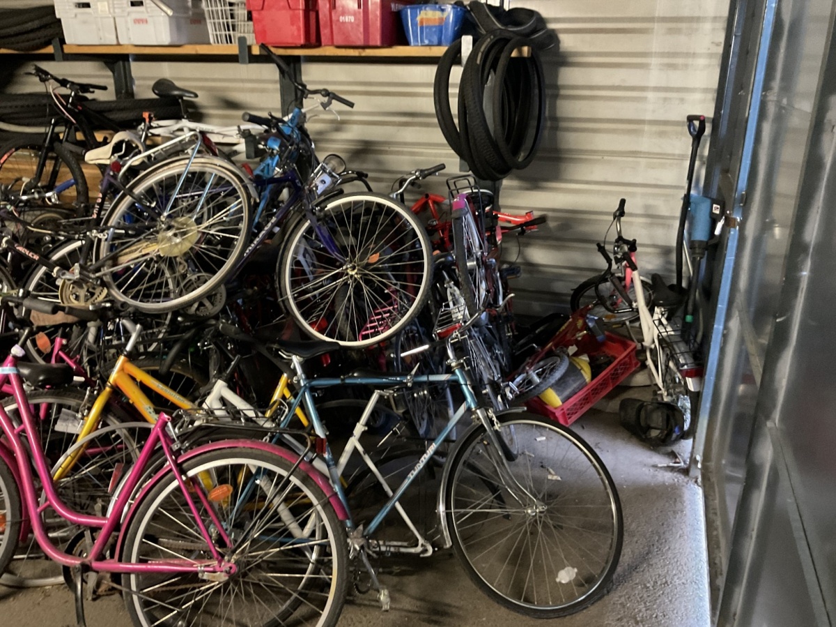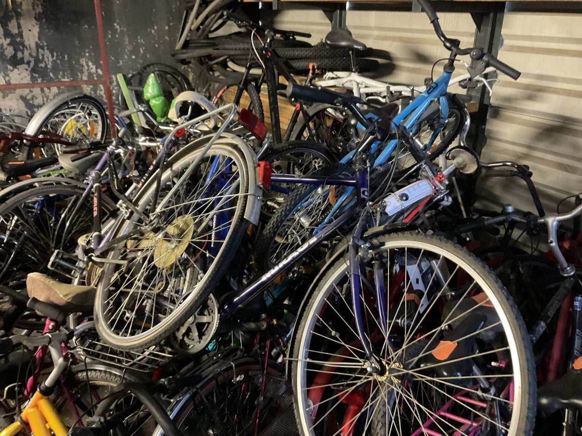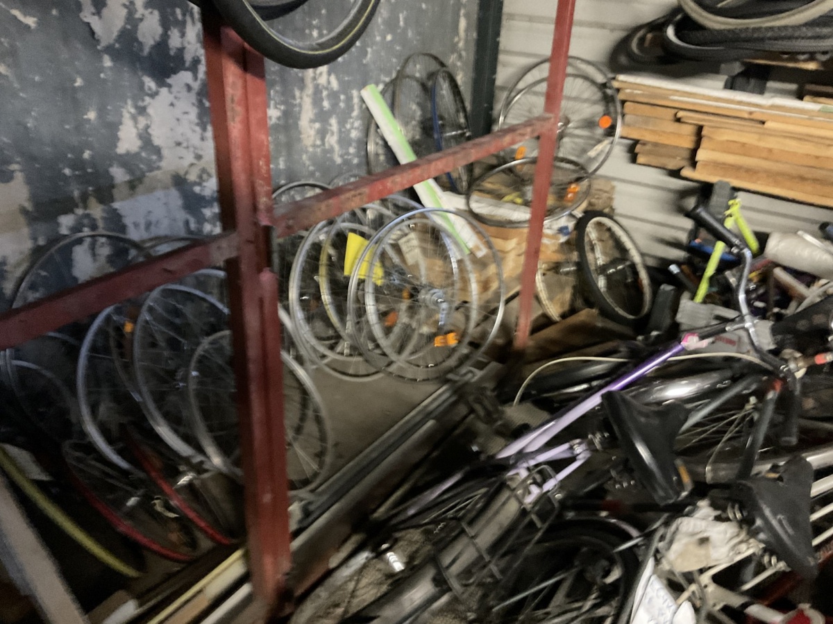 Pyörävarasto, jossa iso määrä käytettyjä, kunnostettavia tai varaosiksi tarkoitettuja polkupyöriä.