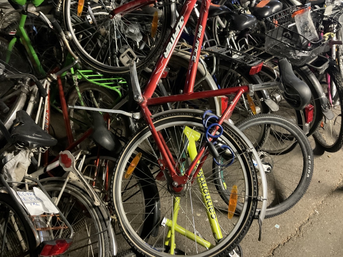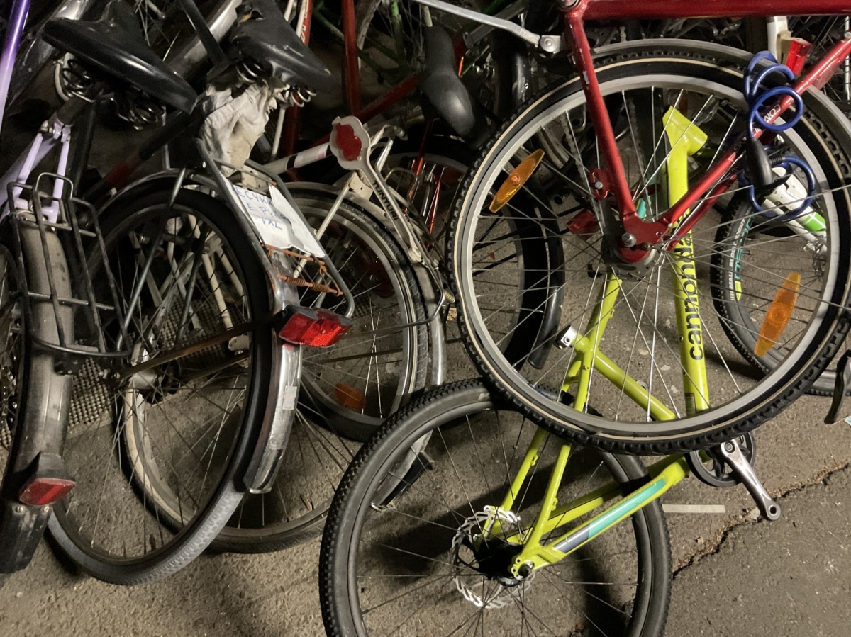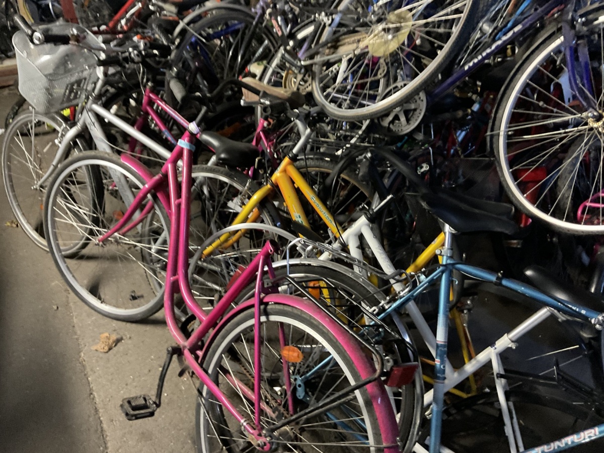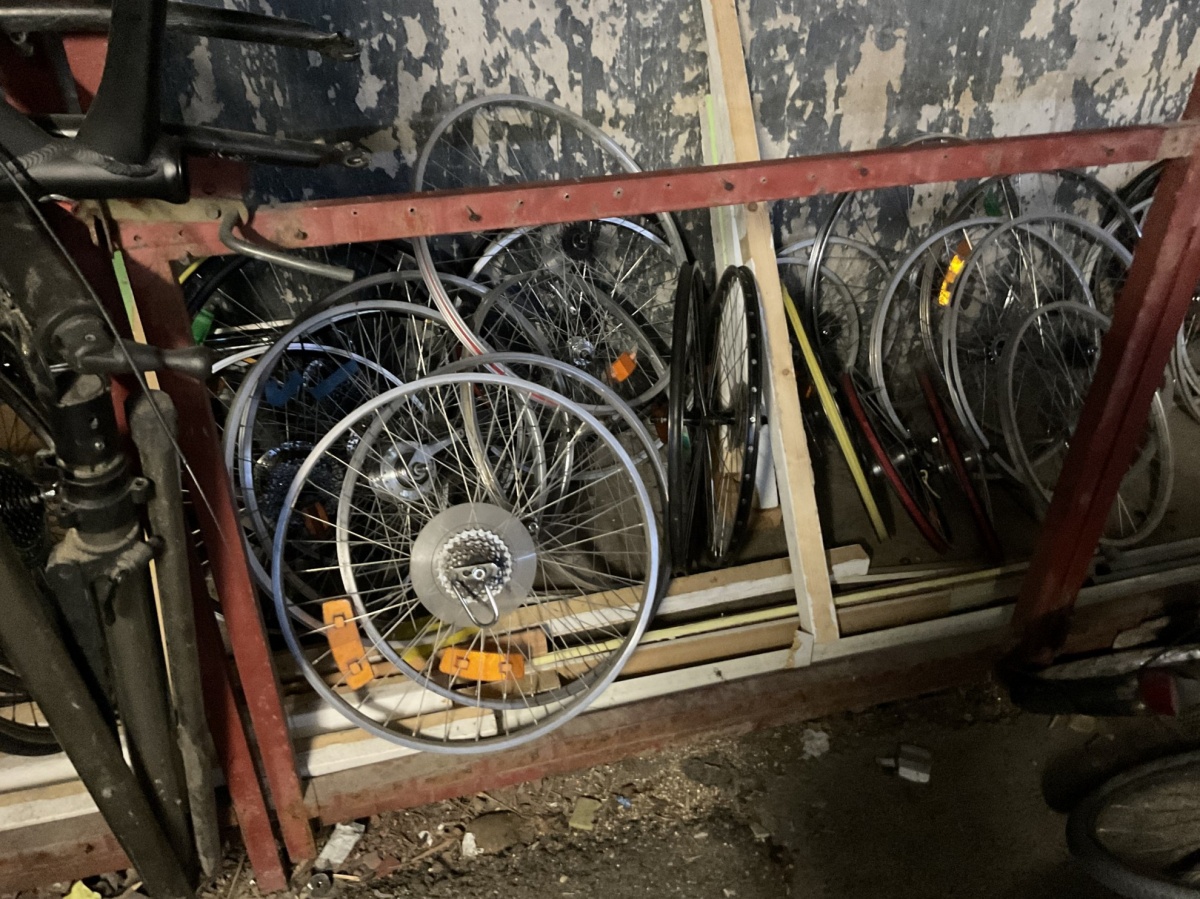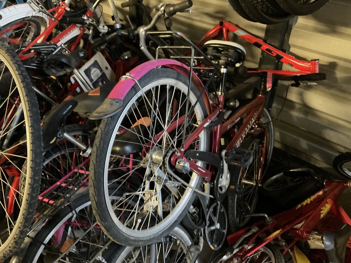 Pyörävarasto, jossa iso määrä käytettyjä, kunnostettavia tai varaosiksi tarkoitettuja polkupyöriä.