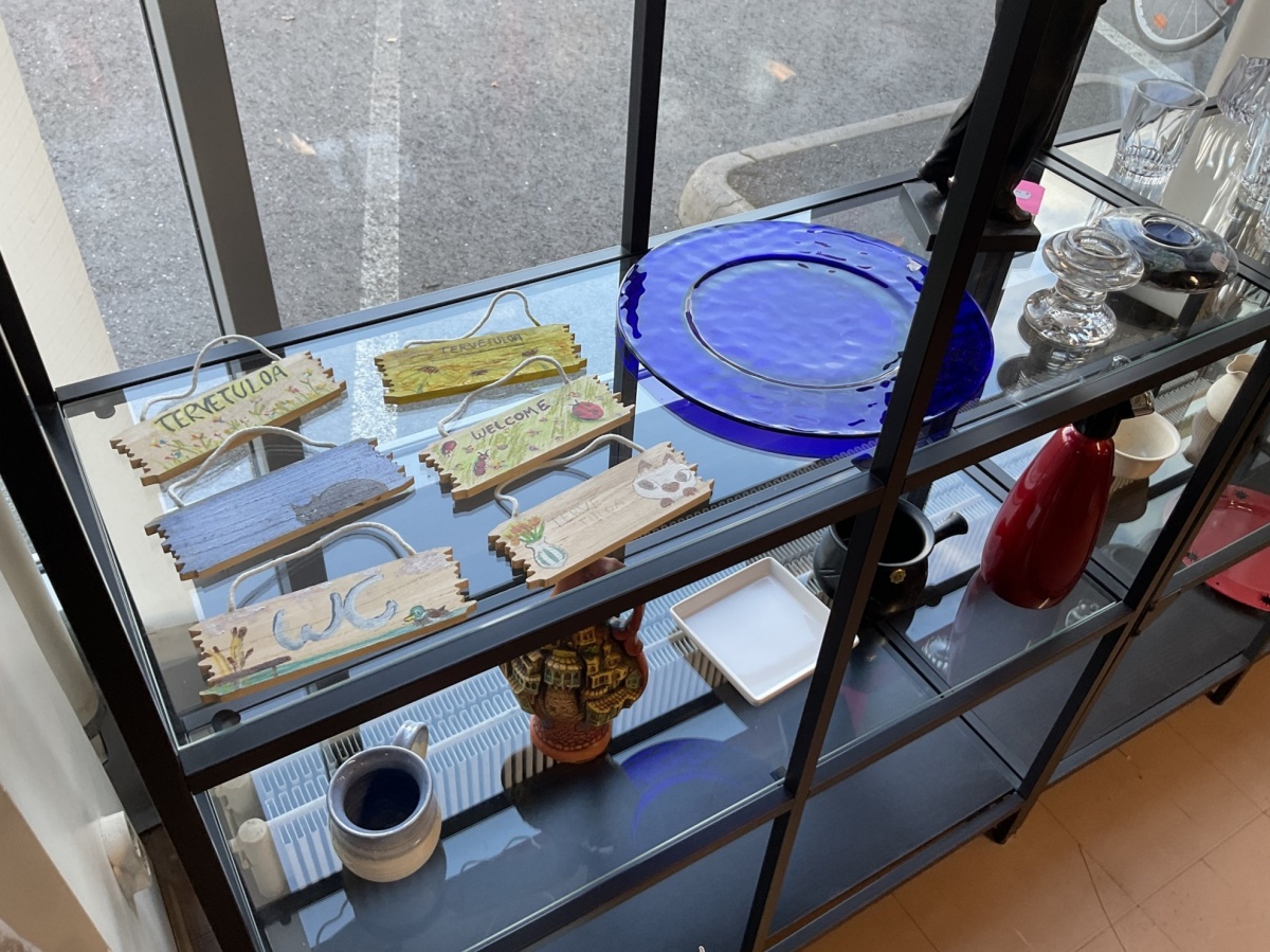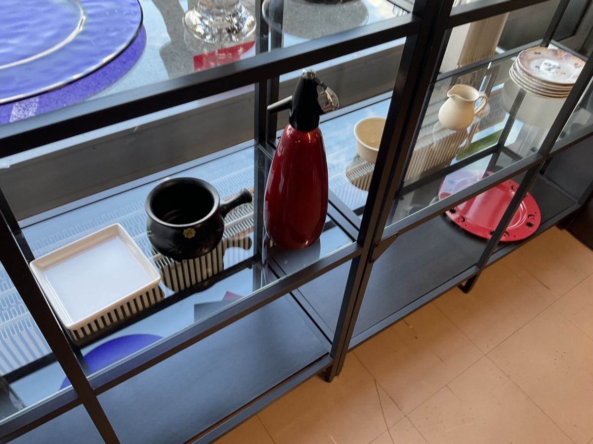Lasihyllykkö, jossa kodintavaroita ja astioita