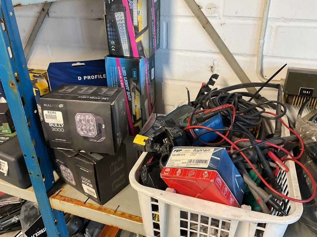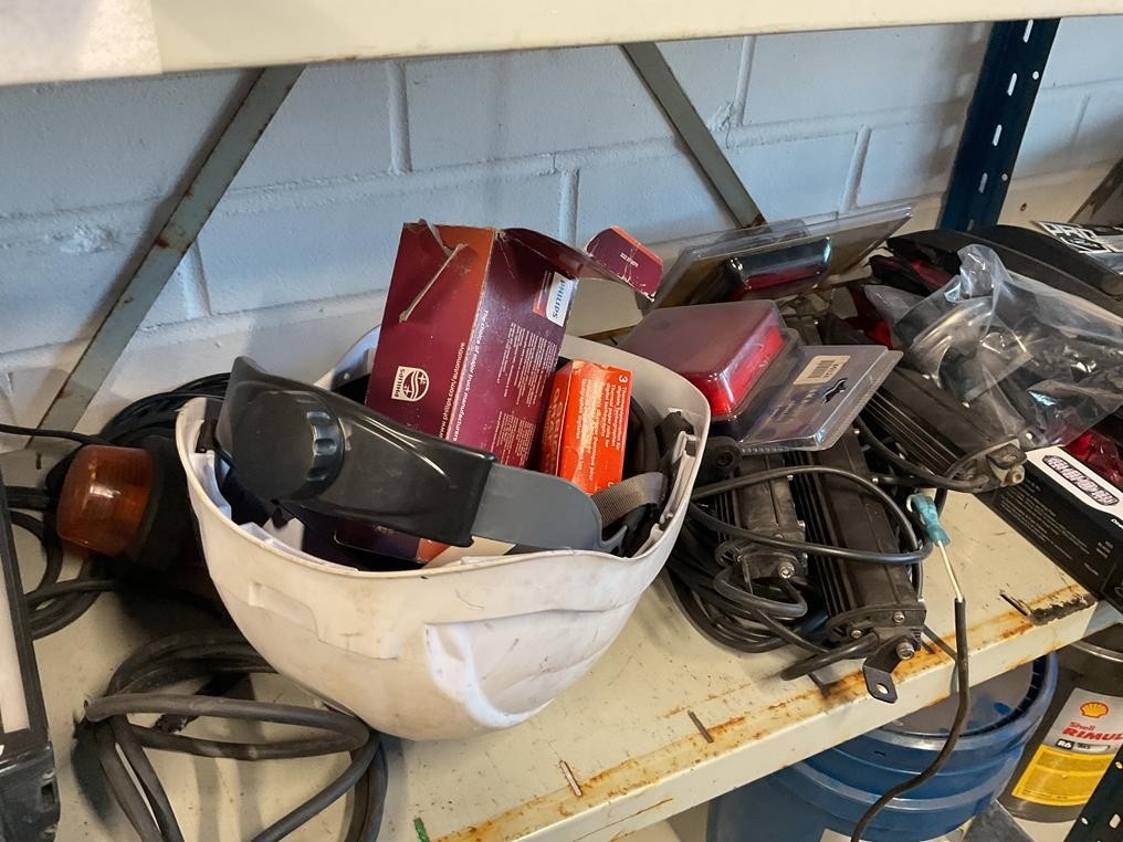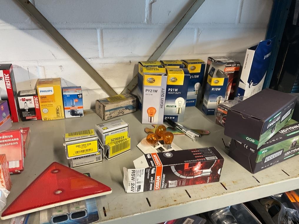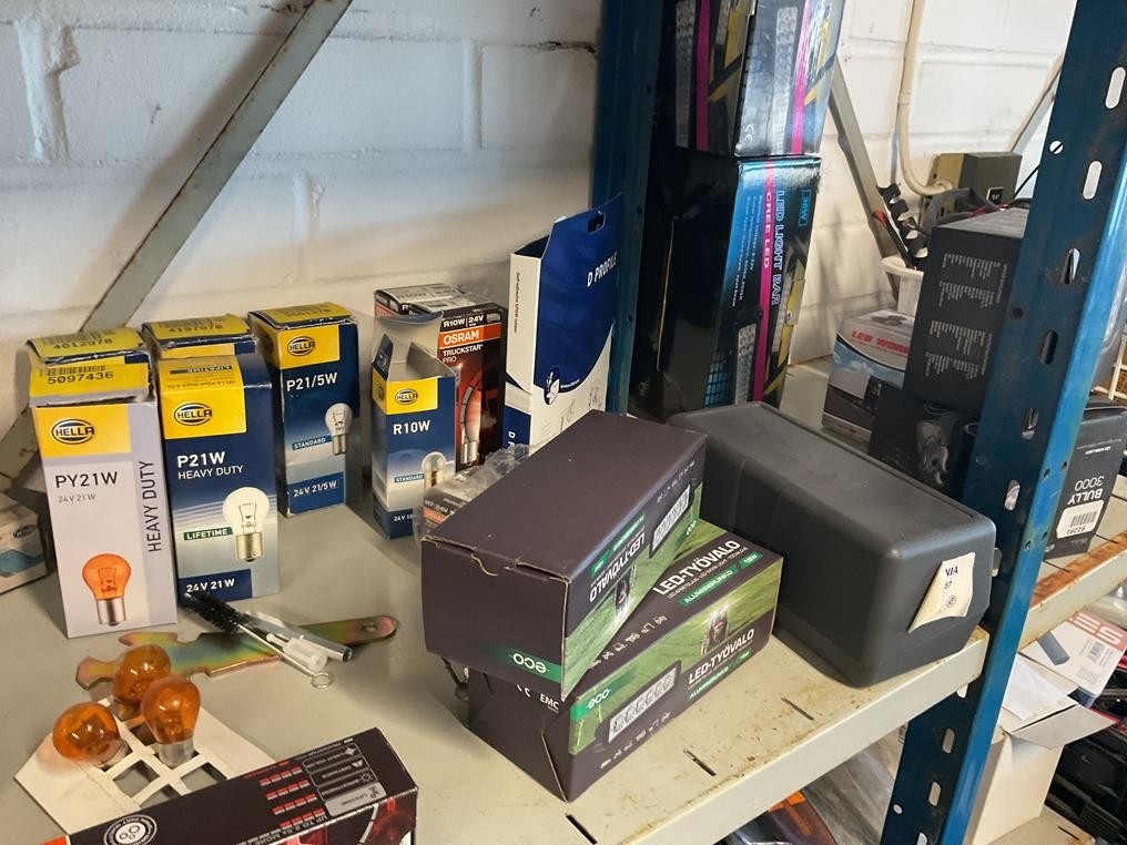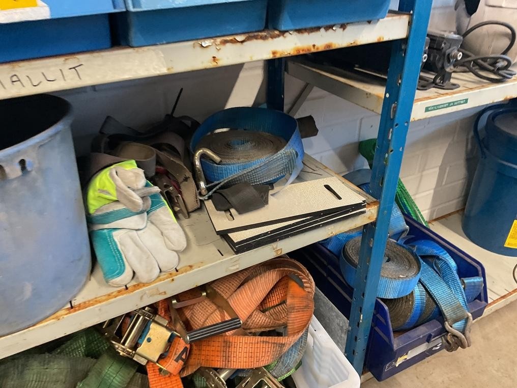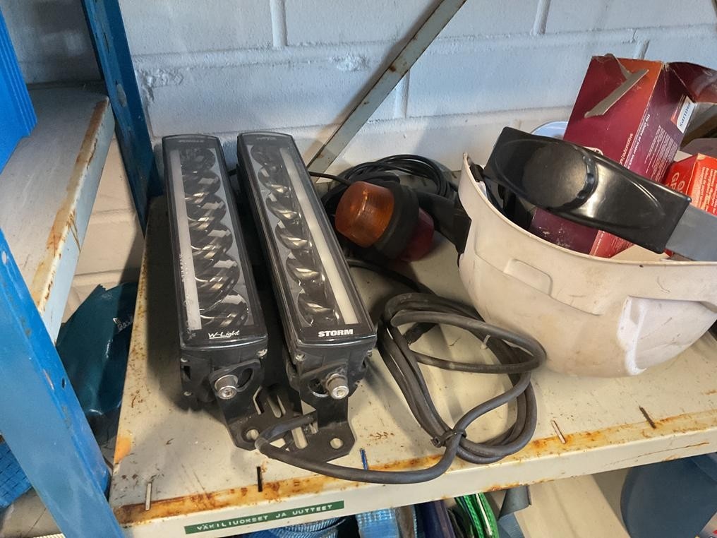 Kolmessa hyllyvälissä olevat liinat, muovilokerot, lisävalot, polttimot ym. (Hylly kuuluu myytävään kohteeseen)