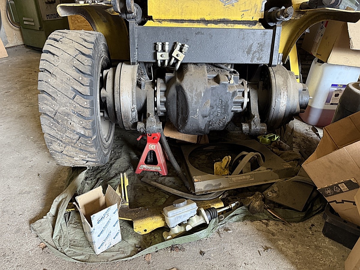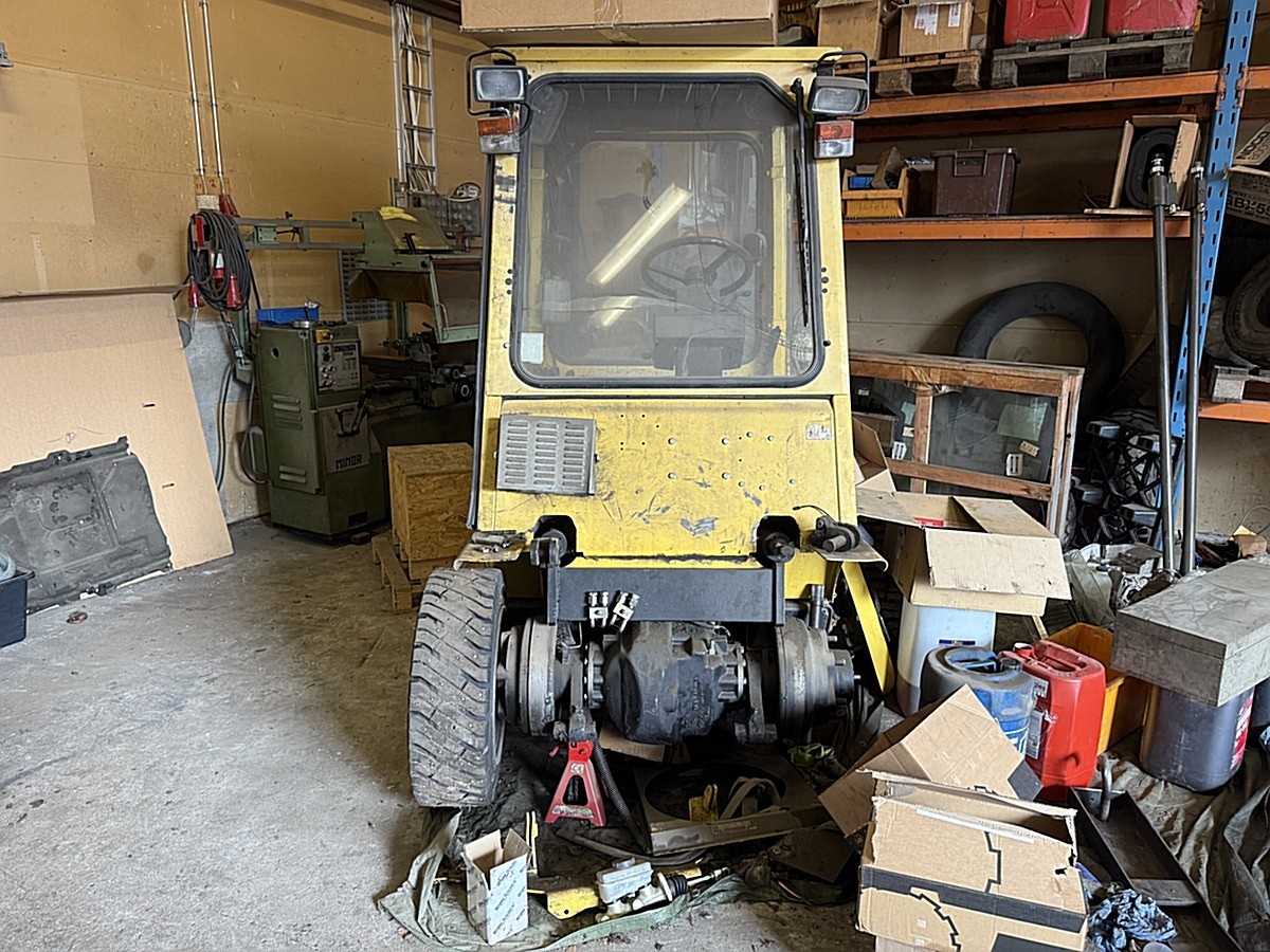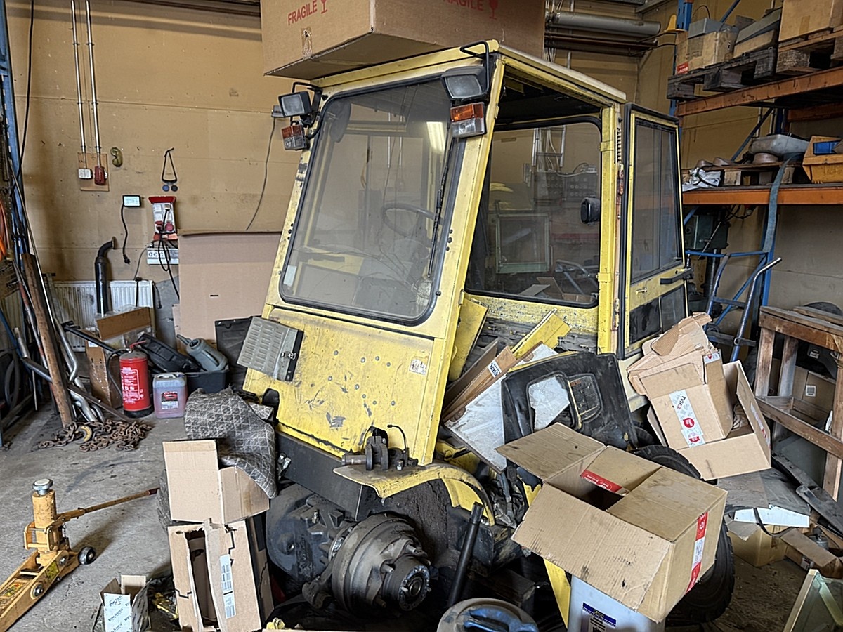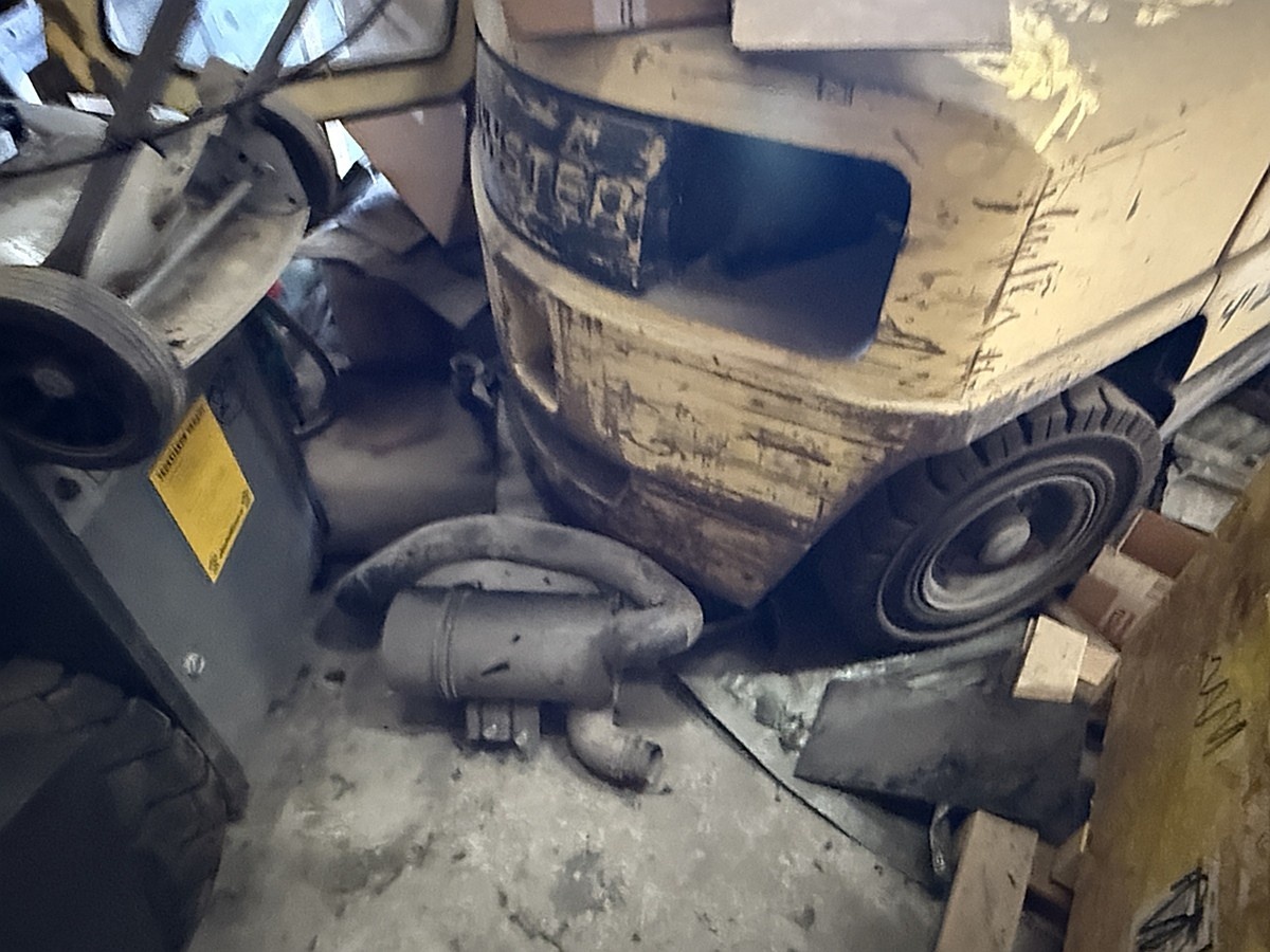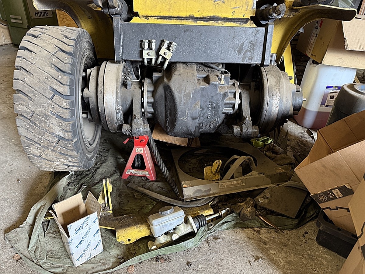 Diesel trukki Hyster kunnostettavaksi puretut osat löytyvät ja saamamme tiedon mukaan etuakselin vetopyörästön isosta lautaspyörästä on murtunut hampaita eli vaatii uuden lautasparin. Kaikki osta pitäisi löytyä, mutta konkurssipesä ei takaa, että kaikki osat ovat tallella. Masto löytyy ulkoa ja piikit, penkki yms trukkilavahyllyltä. Laturi ja startti pahvilaatikosta trukin vierestä