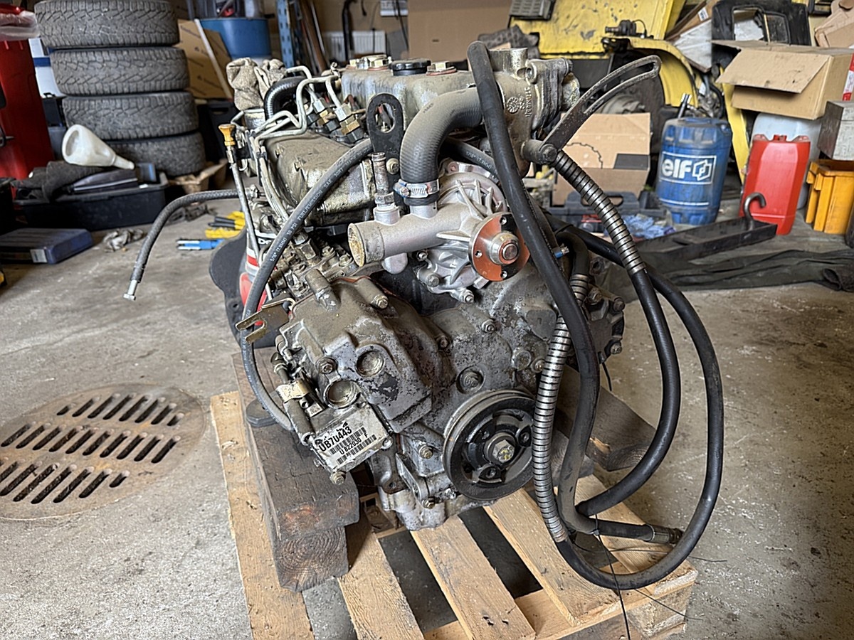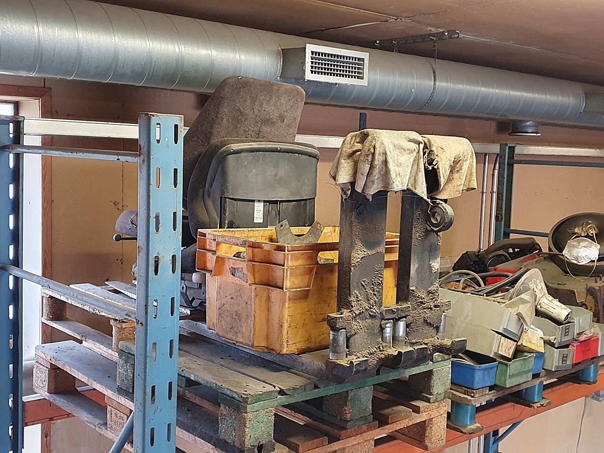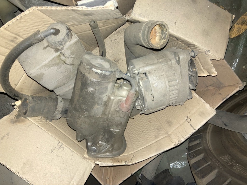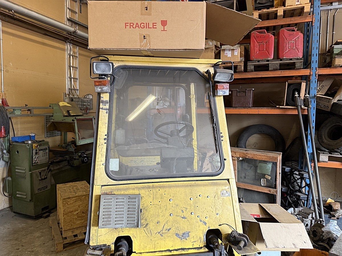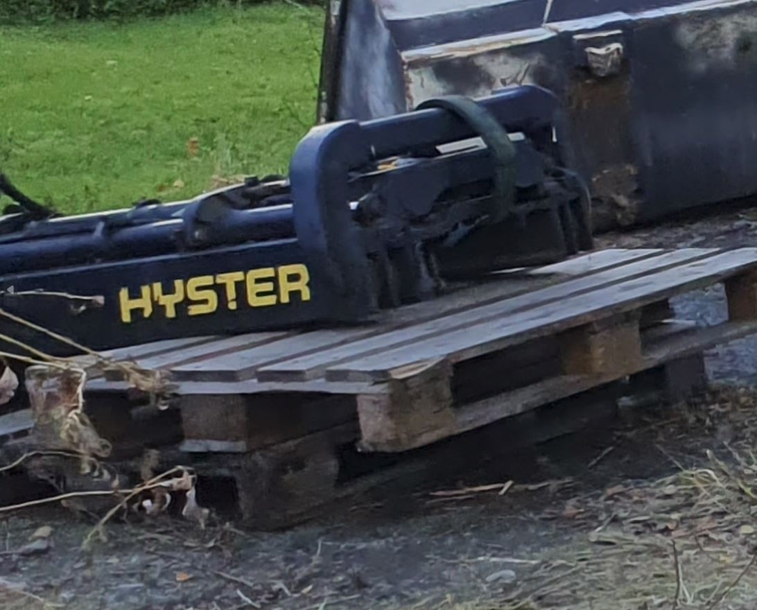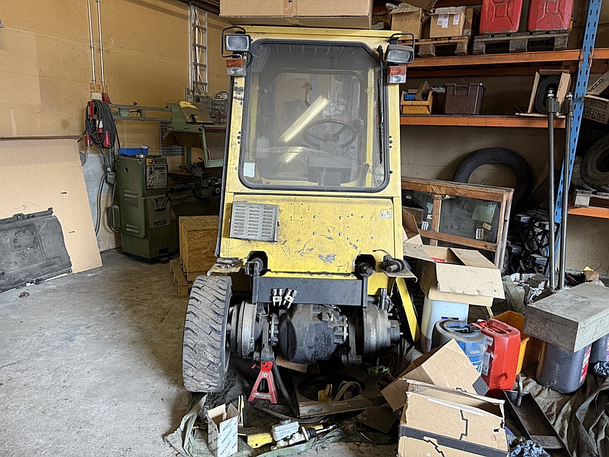 Diesel trukki Hyster kunnostettavaksi puretut osat löytyvät ja saamamme tiedon mukaan etuakselin vetopyörästön isosta lautaspyörästä on murtunut hampaita eli vaatii uuden lautasparin. Kaikki osta pitäisi löytyä, mutta konkurssipesä ei takaa, että kaikki osat ovat tallella. Masto löytyy ulkoa ja piikit, penkki yms trukkilavahyllyltä. Laturi ja startti pahvilaatikosta trukin vierestä