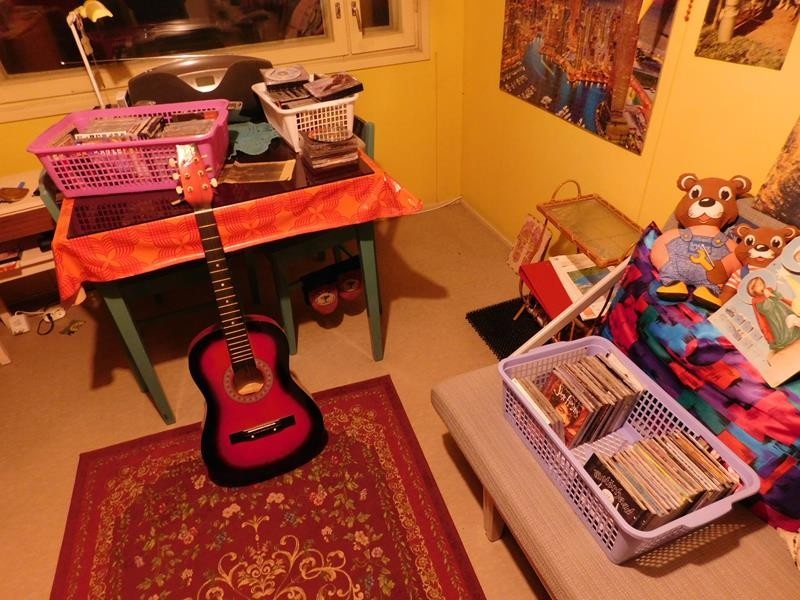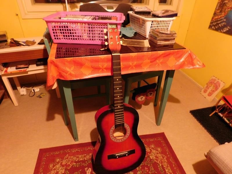 Erä erilaisia CD-levyjä, kasetteja ja kitara.