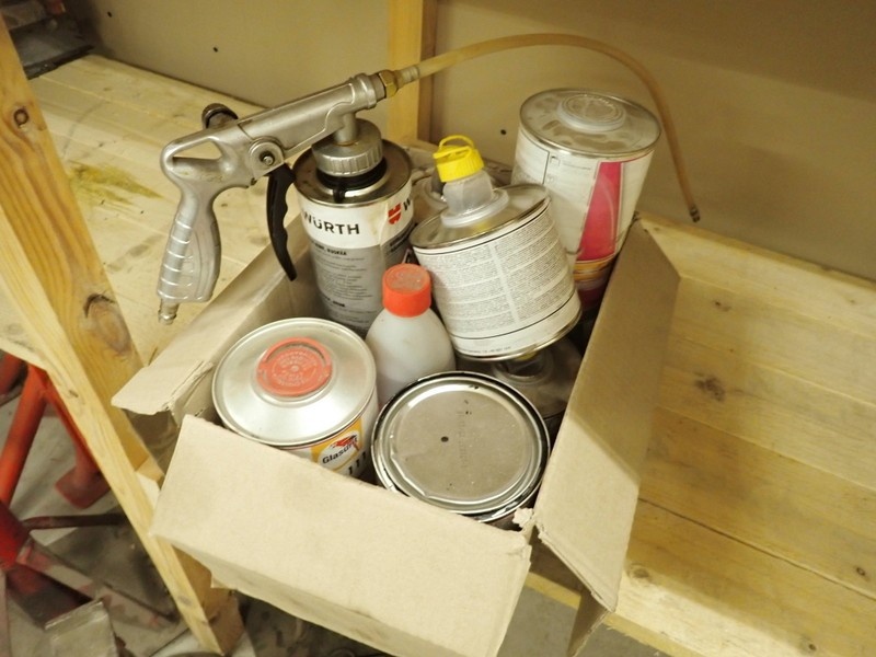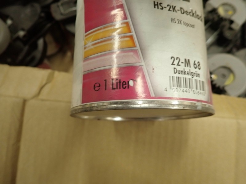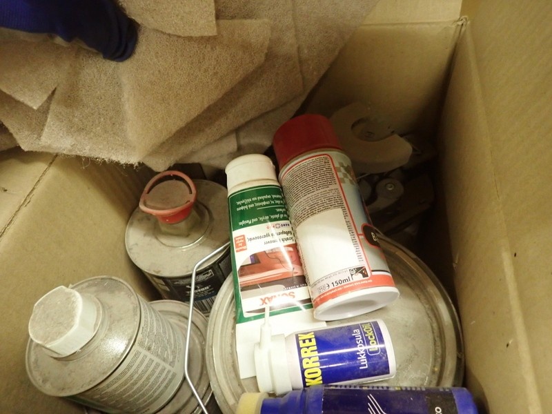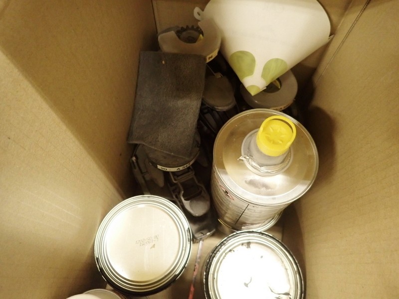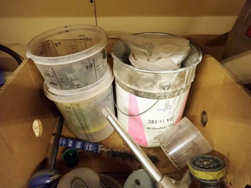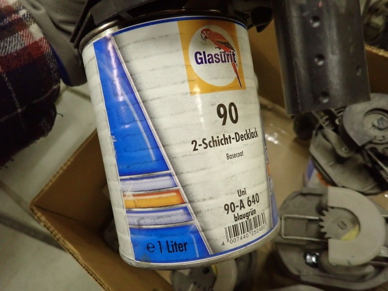 4. Ajoneuvomaalit kiinnitettynä sekoituskansissa. Maalit, kemikaalit.