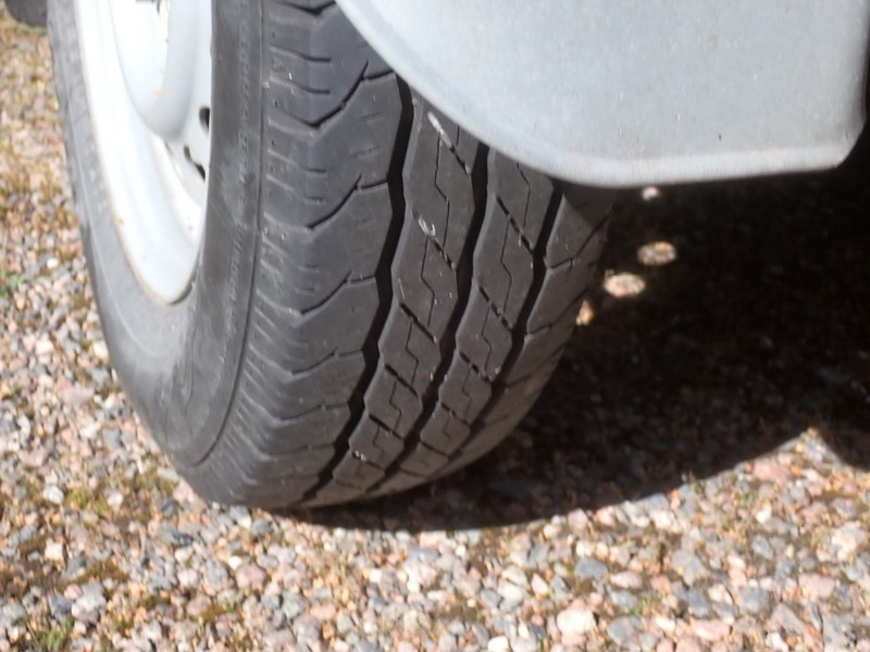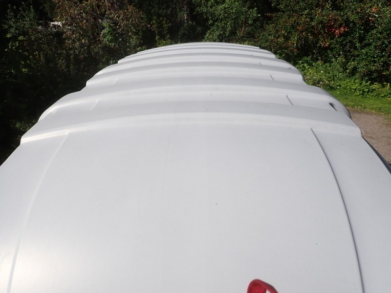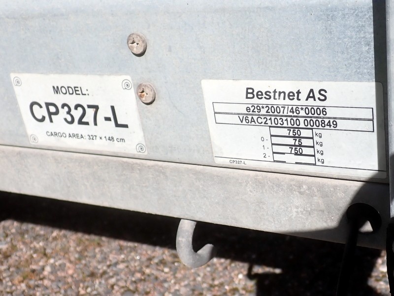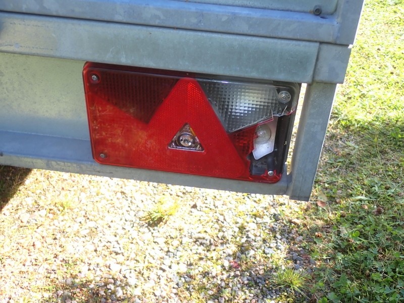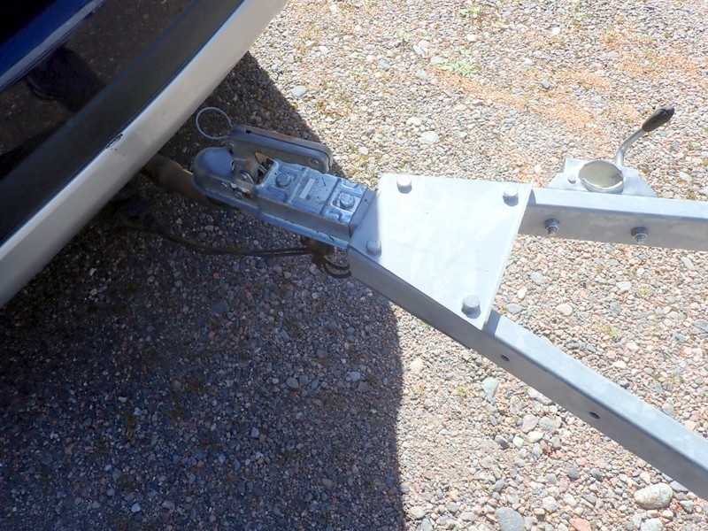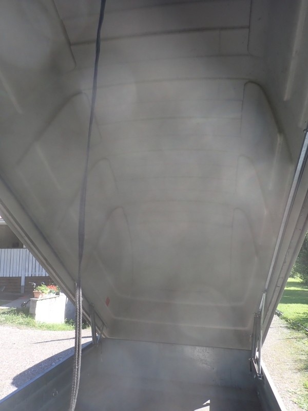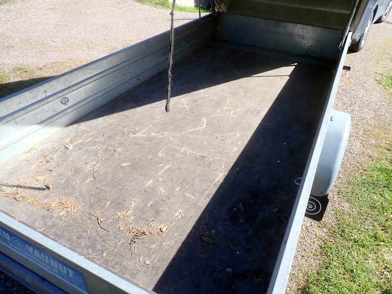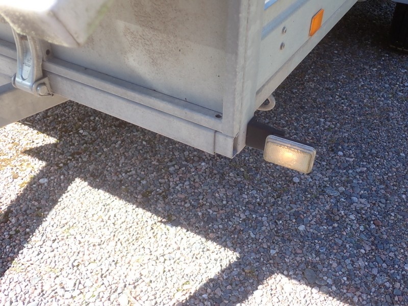 Perävaunu korkealla kuomulla. Sallittu kokonaismassa 825 kg. Nokkapyörä puuttuu, oikea takavalon lasi rikki. Perävaunussa on hyvät renkaat ja ehjä kuomu.
