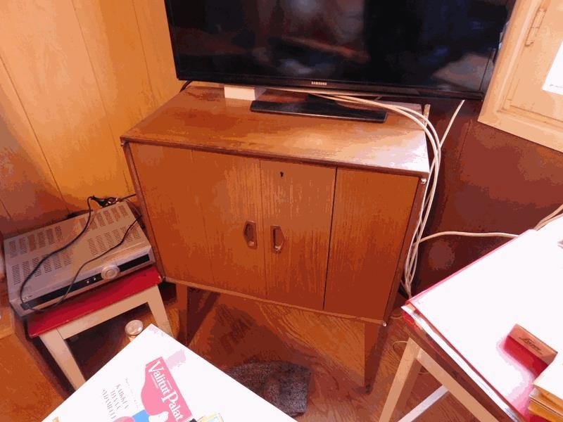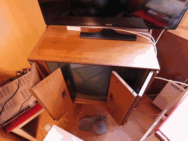 Vanha kuvaputki-tv jossa on ovet edessä. Se on "naamioitu" kaapiksi kun ulkopuolisia tuli kylään...