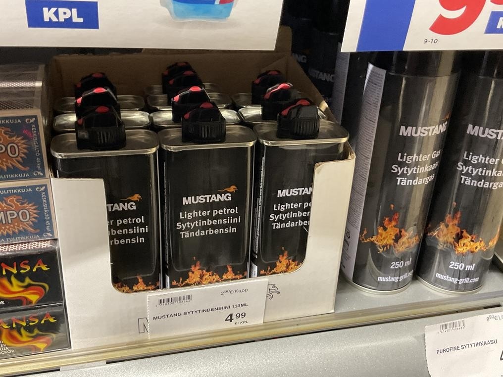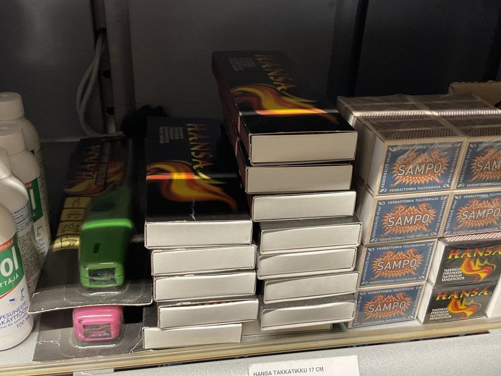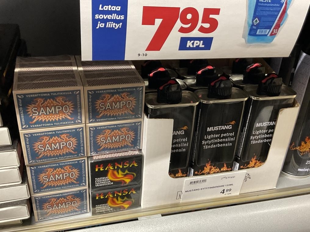 Hyllytasolla olevat polttimot, tulitikut, sytytinkaasu ja-bensiini