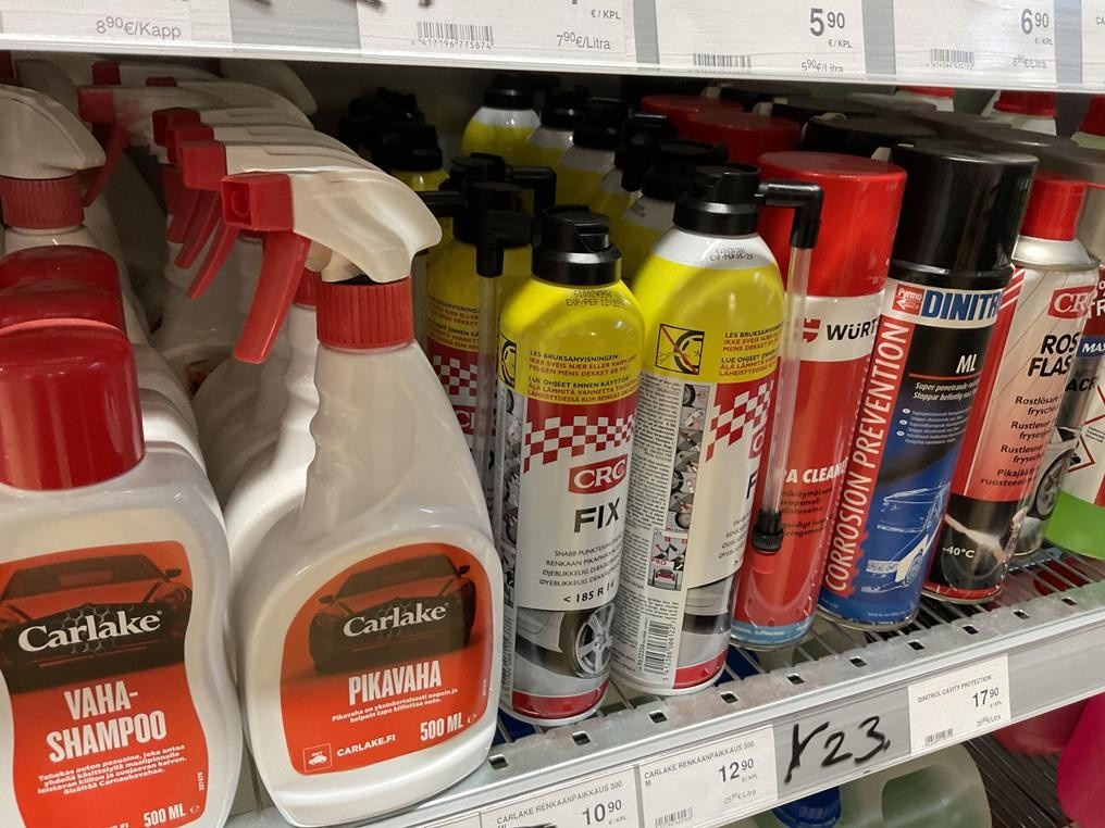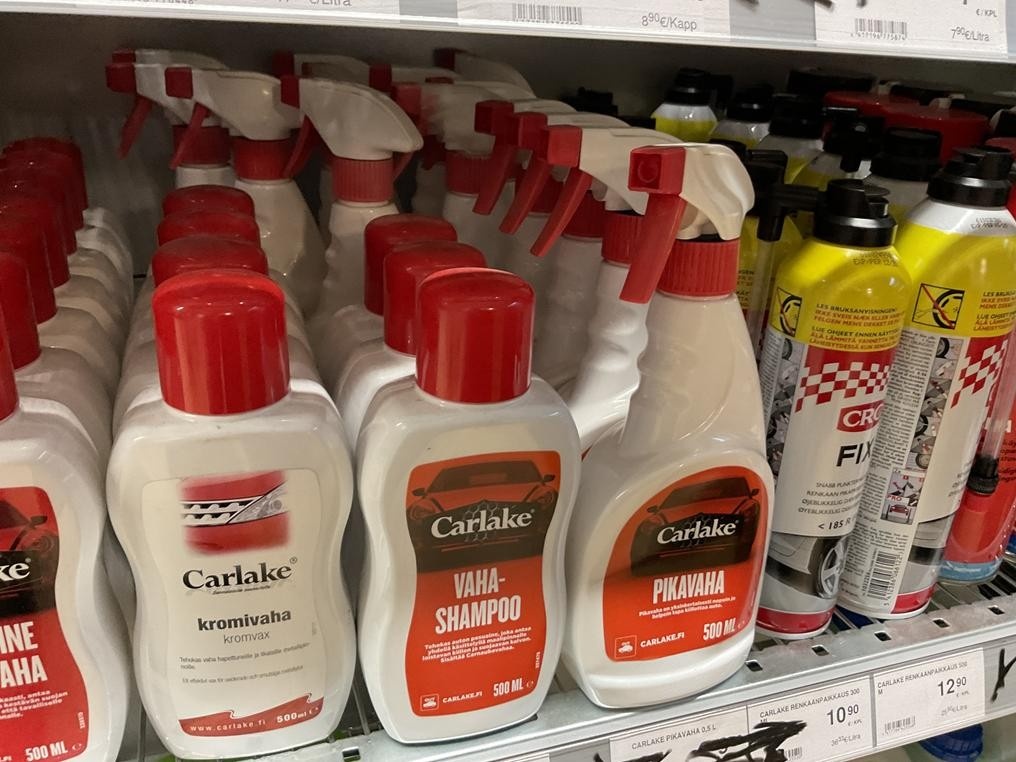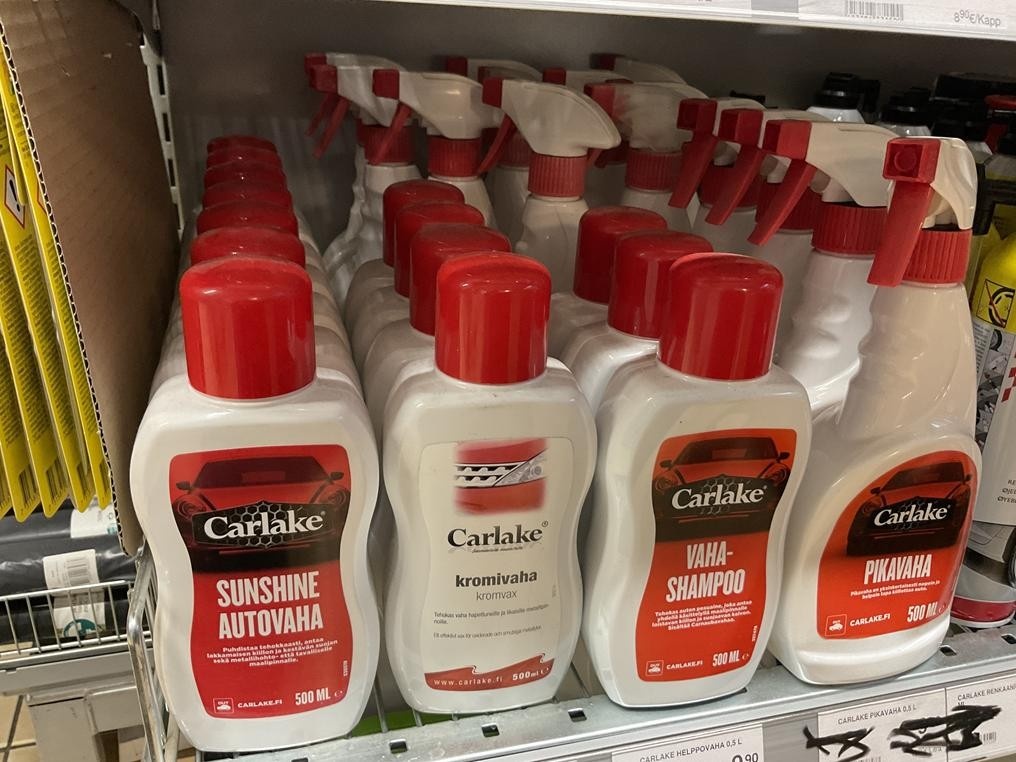 Hyllyvälissä olevat autonhoitotuotteet Carlake, CRC (mm. vahat / puhdistusaineet)