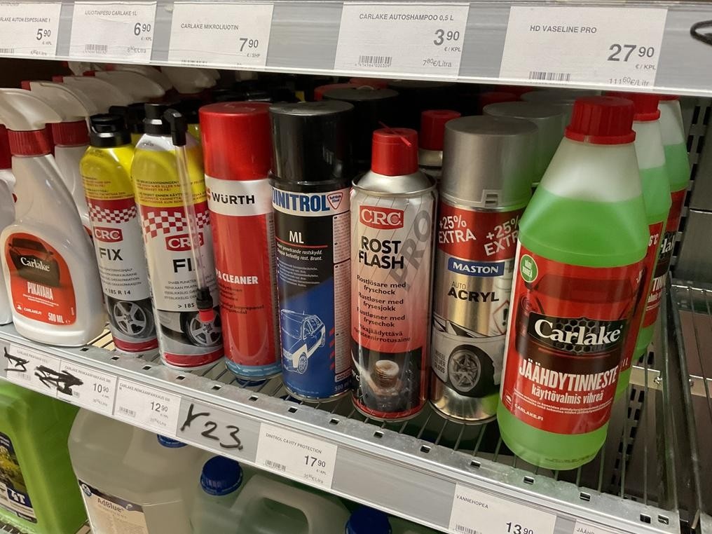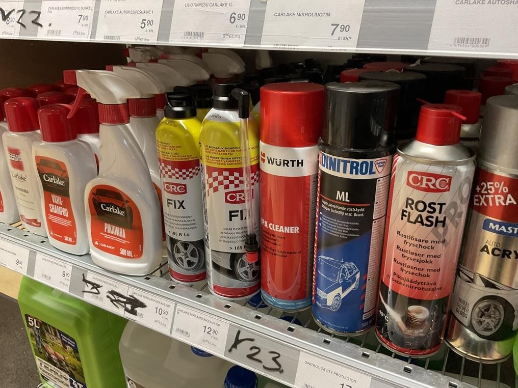 Myyntikohteet » 4. Jenoil Oy:n konkurssipesä, TURKU (2915929-3), 31.10.2025 » V23. Hyllyvälissä olevat Carlake, CRC , Würth, Dinitrol, Maston-tuotteet (mm. vahat / puhdistusaineet)