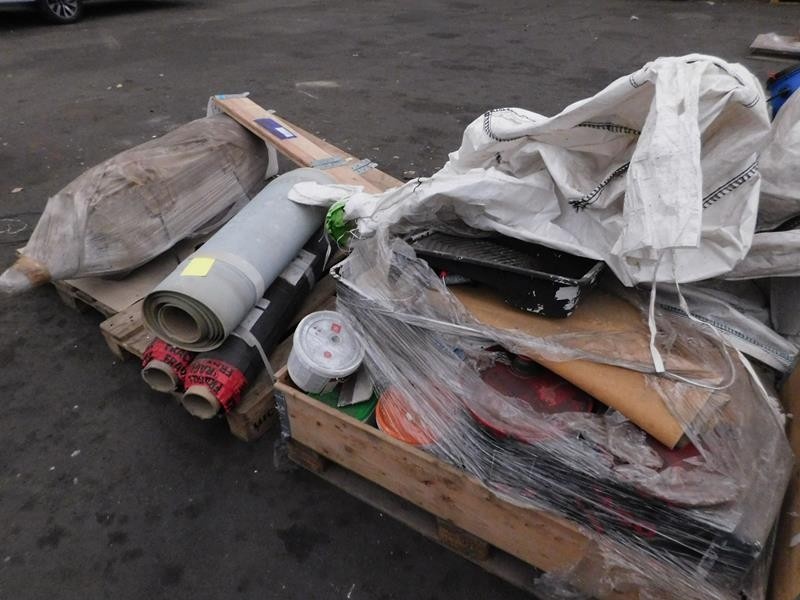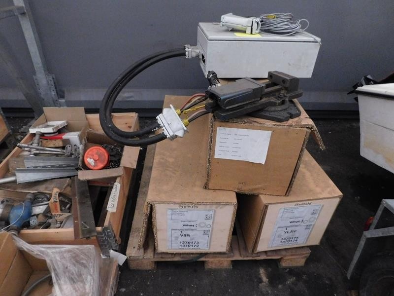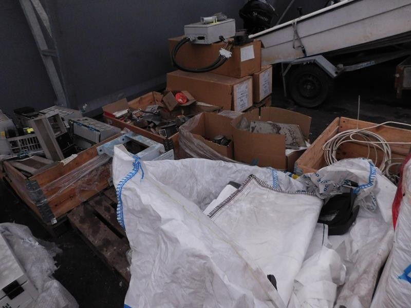 Erä erilaisia varaosia, mittareita, viiroja, johtoja, sähkökeskus, säkkejä ym. 10 trukkilavallista tavaraa.