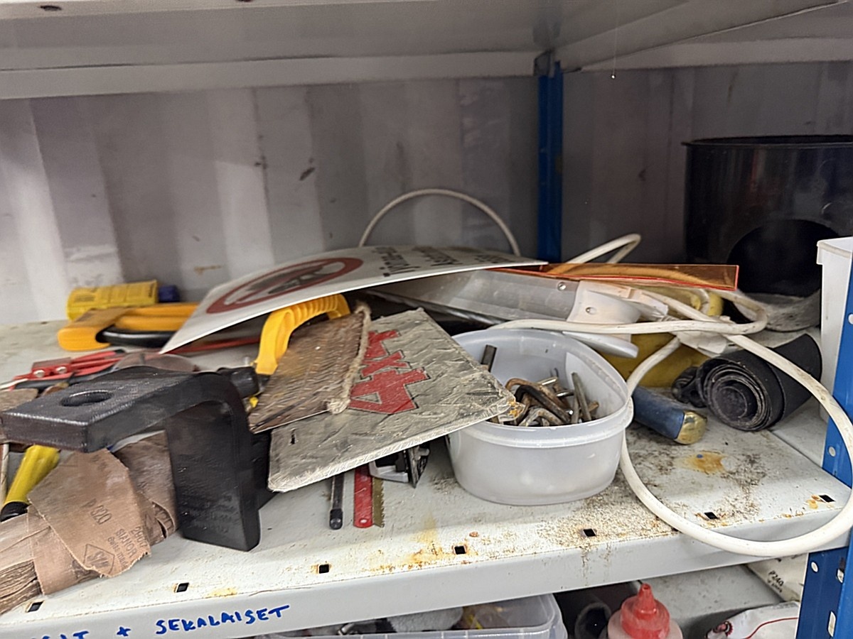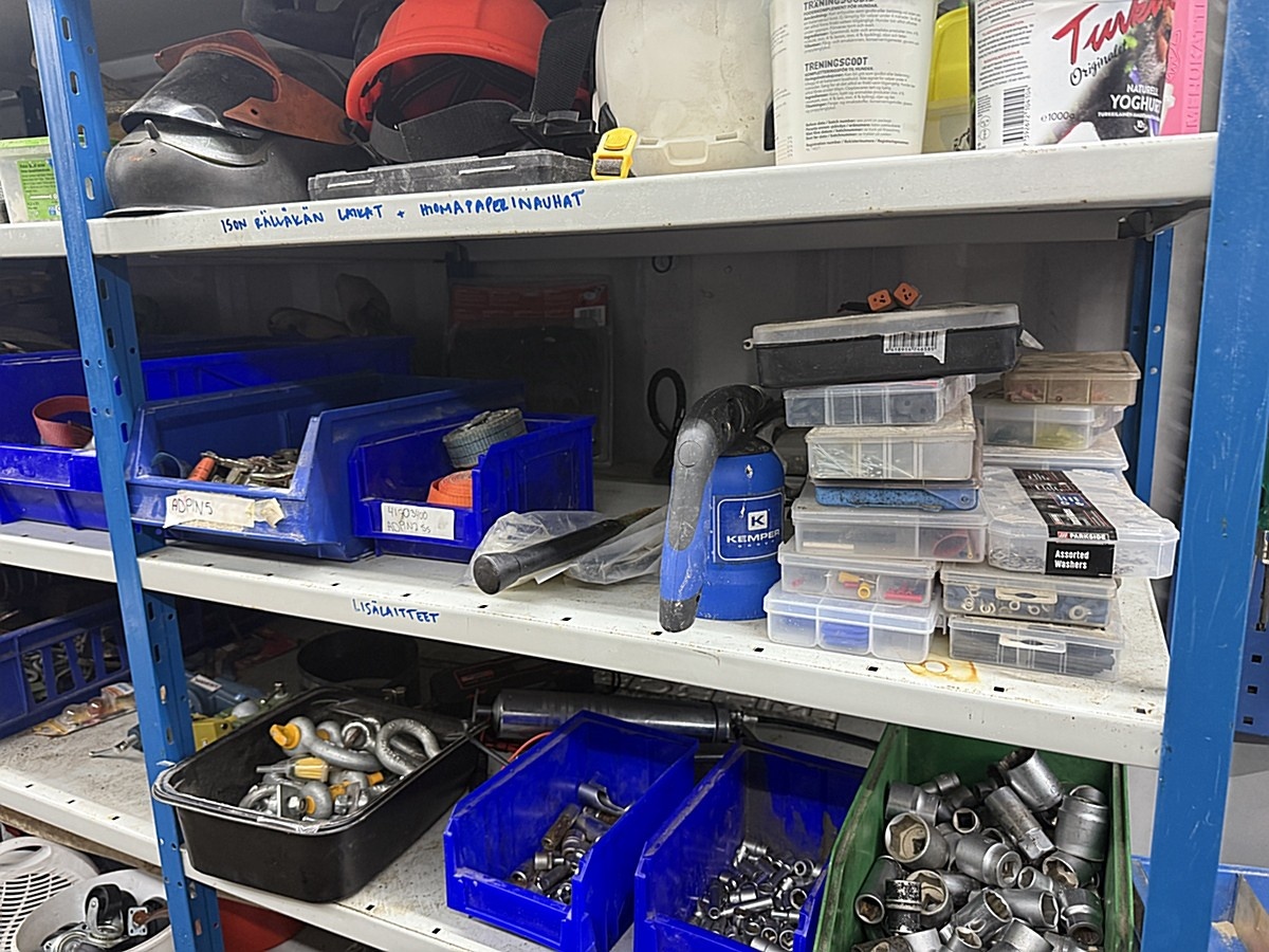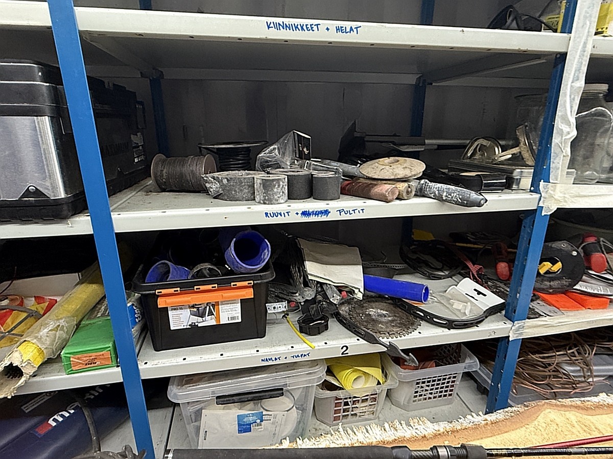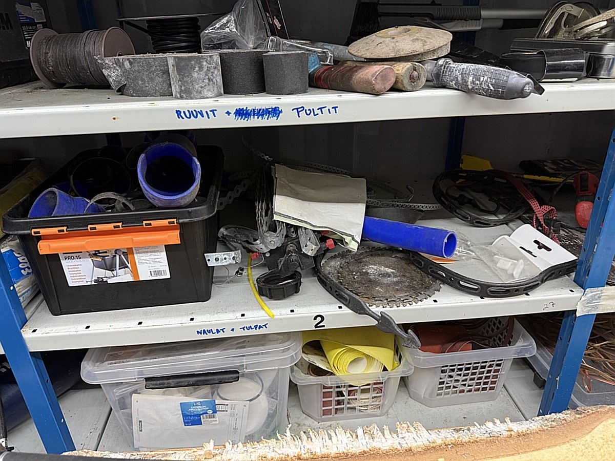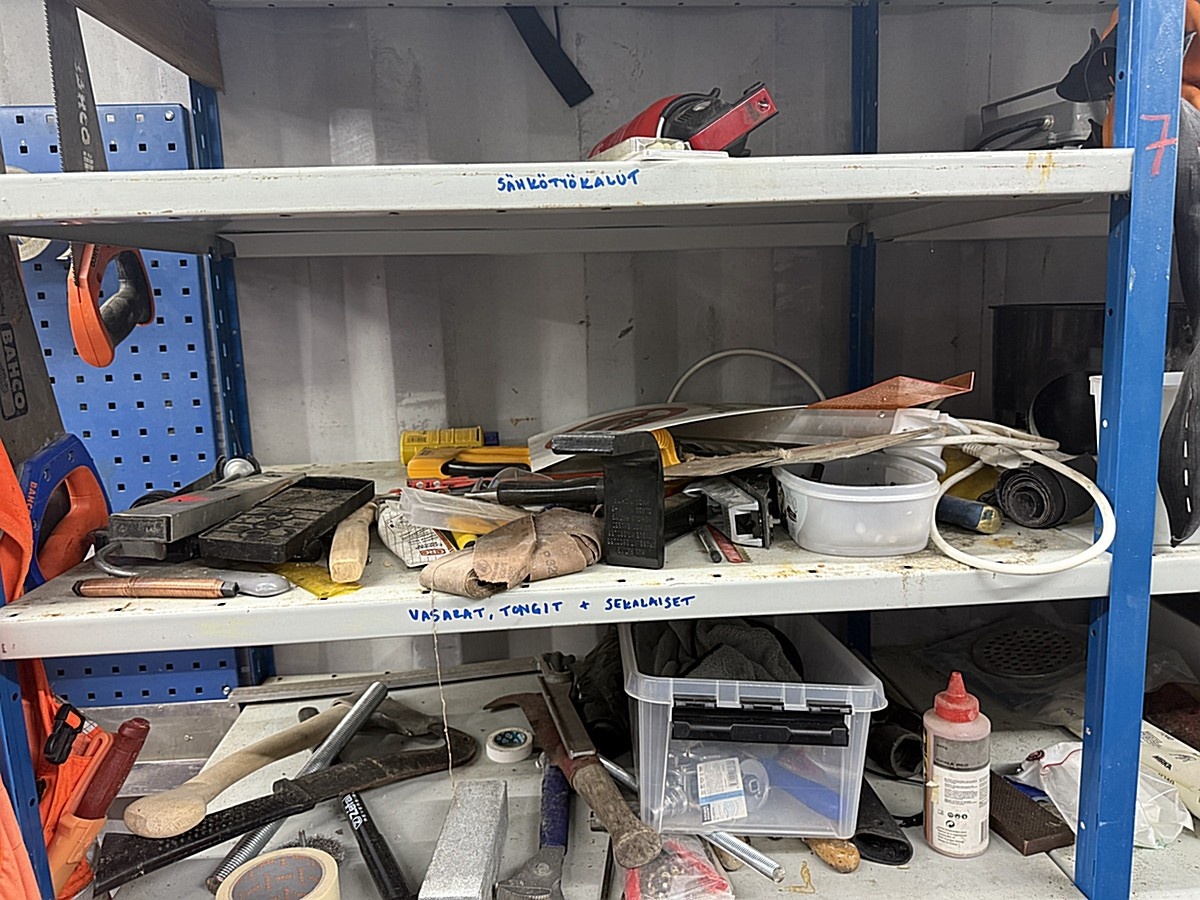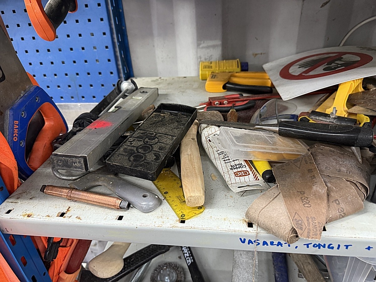 Myyntikohteet » UP Rakennus Tmi:n konkurssipesä (3155713-5), KÄMMENNIEMI, 05.11.2025 » 6.Hyllyn (5-hyllyväliä) ja työpöydän työkalut ja tavarat.